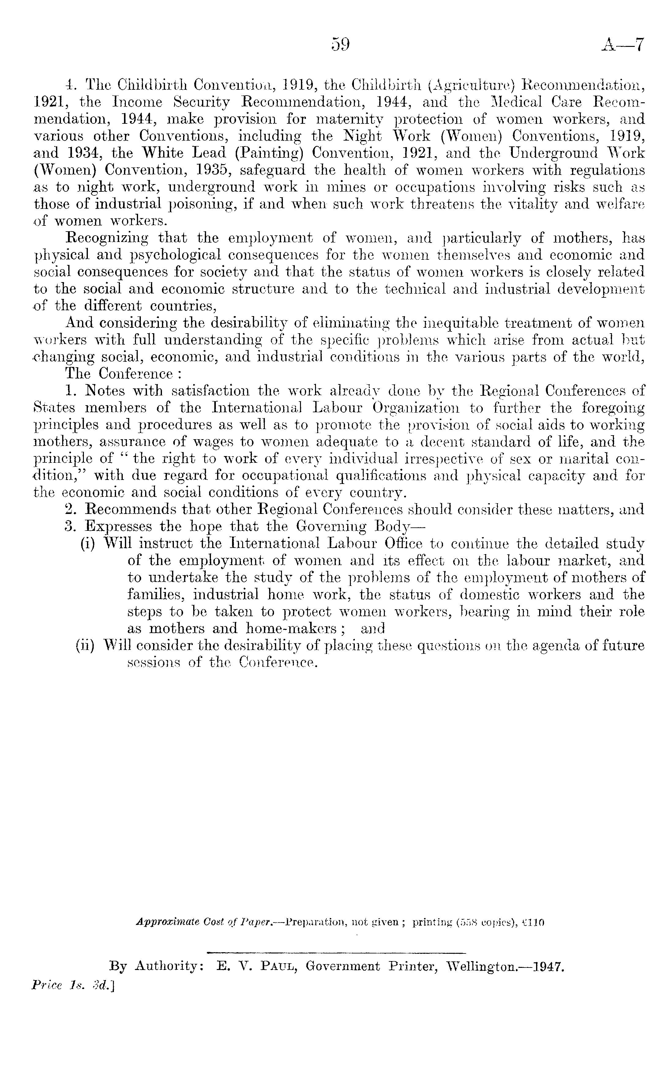 4. The Childbirth Convention, 1919, the Childbirth (Agriculture) Recommendation, 1921, the Income Security Recommendation, 1944, and the Medical Care Recommendation, 1944, make provision for maternity protection of women workers, and various other Conventions, including the Night Work (Women) Conventions, 1919, and 1934, the White Lead (Painting) Convention, 1921, and the Underground Work (Women) Convention, 1935, safeguard the health of women workers with regulations as to night work, underground work in mines or occupations involving risks such as those of industrial poisoning, if and when such work threatens the vitality and welfare of women workers. Recognizing that the employment of women, and particularly of mothers, has physical and psychological consequences for the women themselves and economic and social consequences for society and that the status of women workers is closely related to the social and economic structure and to the technical and industrial development of the different countries, And considering the desirability of eliminating the inequitable treatment of women workers with full understanding of the specific problems which arise from actual but changing social, economic, and industrial conditions in the various parts of the world, The Conference : 1. Notes with satisfaction the work already done by the Regional Conferences of States members of the International Labour Organization to further the foregoing principles and procedures as well as to promote the provision of social aids to working mothers, assurance of wages to women adequate to a decent standard of life, and the principle of " the right to work of every individual irrespective of sex or marital condition," with due regard for occupational qualifications and physical capacity and for the economic and social conditions of every country. 2. Recommends that other Regional Conferences should consider these matters, and 3. Expresses the hope that the Governing Body—(i) Will instruct the International Labour Office to continue the detailed study of the employment, of women and its effect on the labour market, and to undertake the study of the problems of the employment of mothers of families, industrial home work, the status of domestic workers and the steps to be taken to protect women workers, bearing in mind their role as mothers and home-makers ; and (ii) W ill consider the desirability of placing these questions on the agenda of future sessions of the Conference.