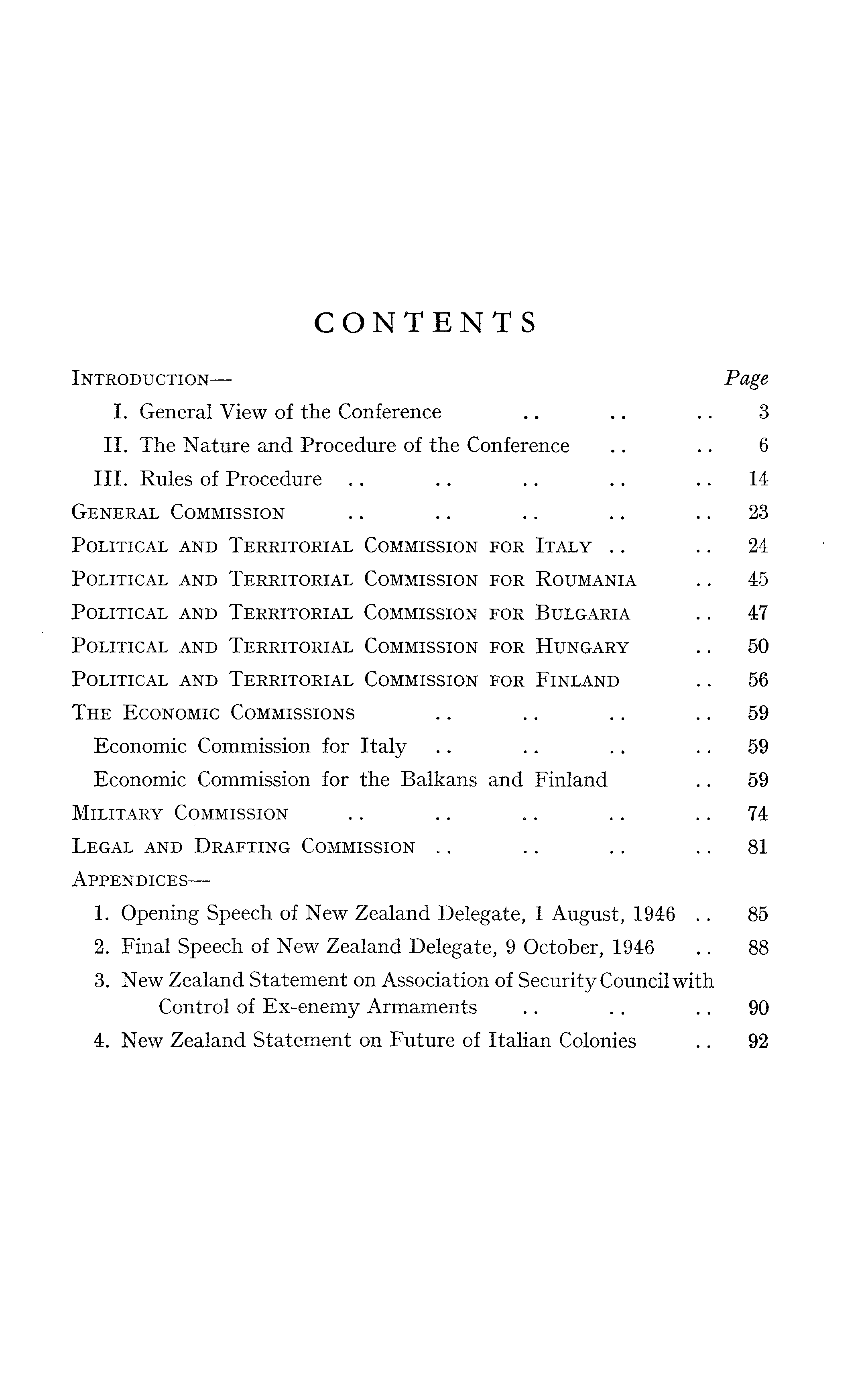 CONTENTS Introduction — Page I. General View of the Conference .. .. .. 3 11. The Nature and Procedure of the Conference .. .. 6 111. Rules of Procedure .. .. .. .. 14 General Commission .. .. .. .. 23 Political and Territorial Commission for Italy .. .. 24 Political and Territorial Commission for Roumania .. 45 Political and Territorial Commission for Bulgaria .. 47 Political and Territorial Commission for Hungary .. 50 Political and Territorial Commission for Finland .. 56 The Economic Commissions .. .. .. 59 Economic Commission for Italy .. .. .. 59 Economic Commission for the Balkans and Finland .. 59 Military Commission .. .. .. .. 74 Legal and Drafting Commission .. .. .. 81 Appendices—1. Opening Speech of New Zealand Delegate, 1 August, 1946 .. 85 2. Final Speech of New Zealand Delegate, 9 October, 1946 .. 88 3. New Zealand Statement on Association of Security Council with Control of Ex-enemy Armaments .. .. .. 90 4. New Zealand Statement on Future of Italian Colonies .. 92