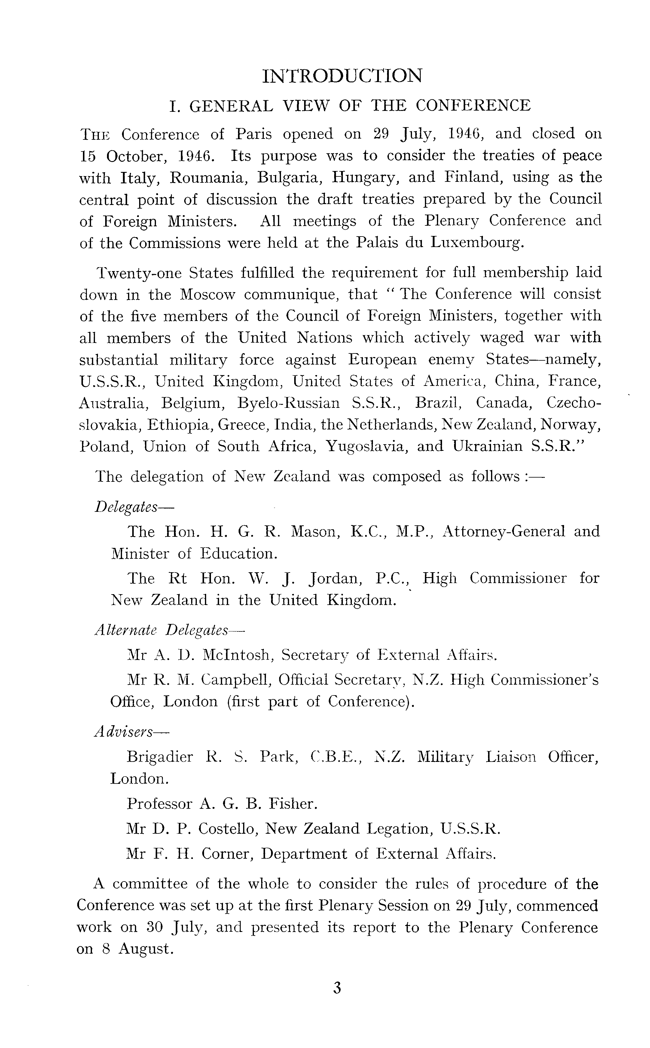 INTRODUCTION I. GENERAL VIEW OF THE CONFERENCE The Conference of Paris opened on 29 July, 1946, and closed on 15 October, 1946. Its purpose was to consider the treaties of peace with Italy, Roumania, Bulgaria, Hungary, and Finland, using as the central point of discussion the draft treaties prepared by the Council of Foreign Ministers. All meetings of the Plenary Conference and of the Commissions were held at the Palais du Luxembourg. Twenty-one States fulfilled the requirement for full membership laid down in the Moscow communique, that " The Conference will consist of the five members of the Council of Foreign Ministers, together with all members of the United Nations which actively waged war with substantial military force against European enemy States —namely, U.S.S.R., United Kingdom, United States of America, China, France, Australia, Belgium, Byelo-Russian S.S.R., Brazil, Canada, Czechoslovakia, Ethiopia, Greece, India, the Netherlands, New Zealand, Norway, Poland, Union of South Africa, Yugoslavia, and Ukrainian S.S.R." The delegation of New Zealand was composed as follows : Delegates — The Hon. H. G. R. Mason, K.C., M.P., Attorney-General and Minister of Education. The Rt Hon. W. J. Jordan, P.C., High Commissioner for New Zealand in the United Kingdom. Alternate Delegates — Mr A. D. Mcintosh, Secretary of External Affairs. Mr R. M. Campbell, Official Secretary, N.Z. High Commissioner's Office, London (first part of Conference). Advisers —■ Brigadier R. S. Park, C.8.E., N.Z. Military Liaison Officer, London. Professor A. G. B. Fisher. Mr D. P. Costello, New Zealand Legation, U.S.S.R. Mr F. H. Corner, Department of External Affairs. A committee of the whole to consider the rules of procedure of the Conference was set up at the first Plenary Session on 29 July, commenced work on 30 July, and presented its report to the Plenary Conference on 8 August.