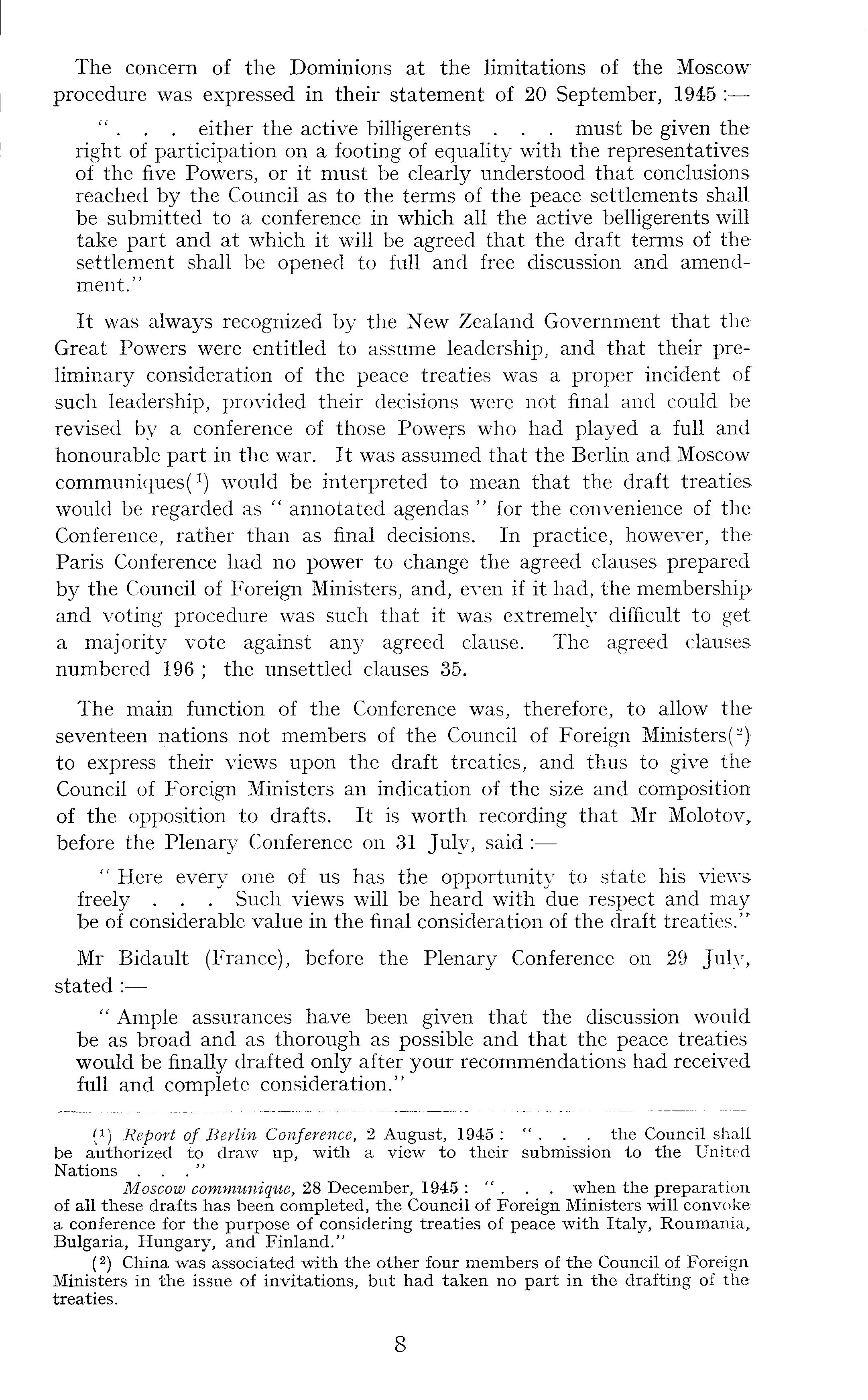 The concern of the Dominions at the limitations of the Moscow procedure was expressed in their statement of 20 September, 1945 : " . . . either the active billigerents . . . must be given the right of participation on a footing of equality with the representatives of the five Powers, or it must be clearly understood that conclusions reached by the Council as to the terms of the peace settlements shall be submitted to a conference in which all the active belligerents will take part and at which it will be agreed that the draft terms of the settlement shall be opened to full and free discussion and amendment." It was always recognized by the New Zealand Government that the Great Powers were entitled to assume leadership, and that their preliminary consideration of the peace treaties was a proper incident of such leadership, provided their decisions were not final and could be revised by a conference of those Powers who had played a full and honourable part in the war. It was assumed that the Berlin and Moscow communiques( x ) would be interpreted to mean that the draft treaties would be regarded as " annotated agendas " for the convenience of the Conference, rather than as final decisions. In practice, however, the Paris Conference had no power to change the agreed clauses prepared by the Council of Foreign Ministers, and, even if it had, the membership and voting procedure was such that it was extremely difficult to get a majority vote against any agreed clause. The agreed clauses numbered 196 ; the unsettled clauses 35. The main function of the Conference was, therefore, to allow the seventeen nations not members of the Council of Foreign Ministers( 2 ) to express their views upon the draft treaties, and thus to give the Council of Foreign Ministers an indication of the size and composition of the opposition to drafts. It is worth recording that Mr Molotov, before the Plenary Conference on 31 July, said : " Here every one of us has the opportunity to state his views freely . . . Such views will be heard with due respect and may be of considerable value in the final consideration of the draft treaties." Mr Bidault (France), before the Plenary Conference on 29 July, stated : " Ample assurances have been given that the discussion would be as broad and as thorough as possible and that the peace treaties would be finally drafted only after your recommendations had received full and complete consideration."