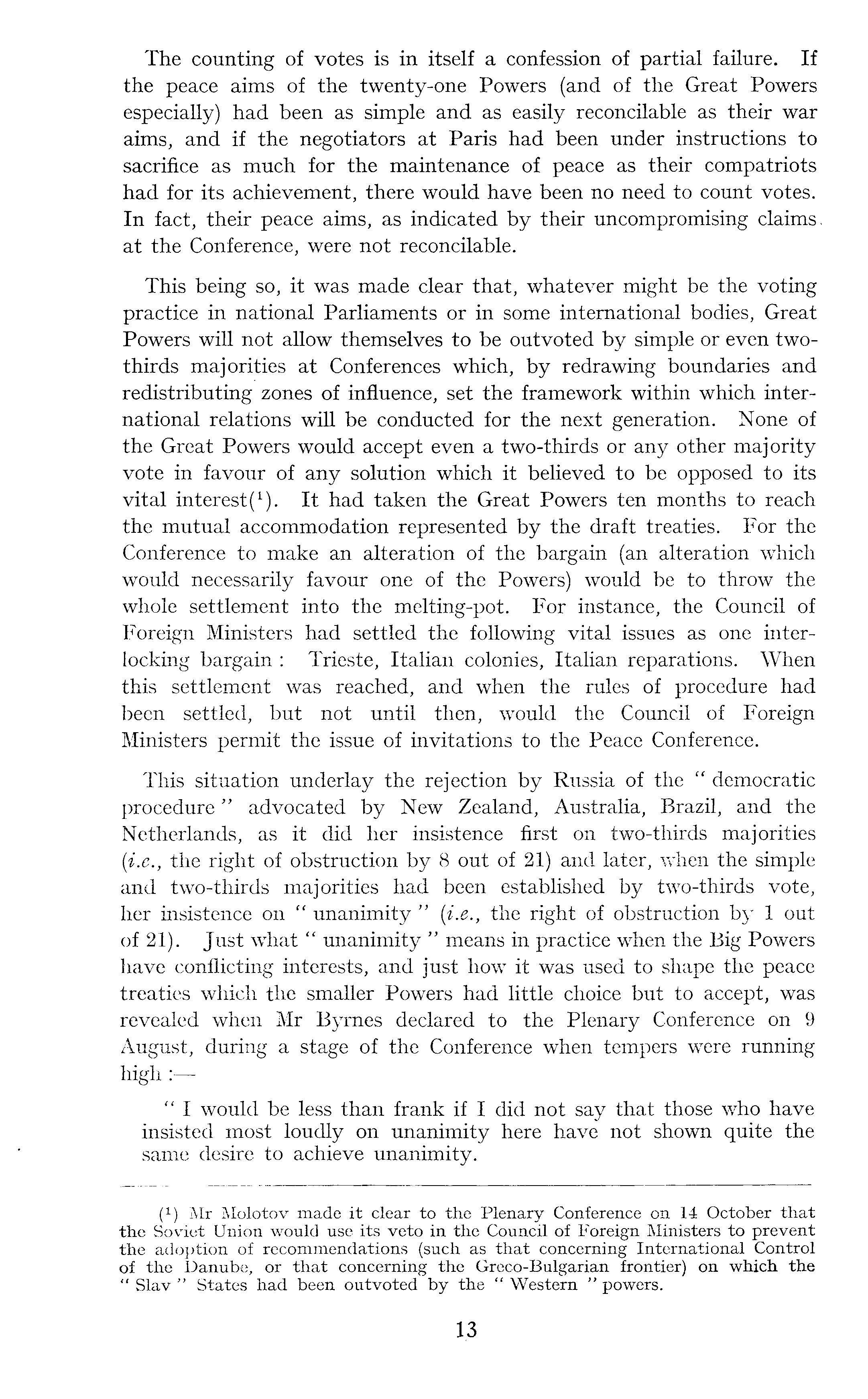 The counting of votes is in itself a confession of partial failure. If the peace aims of the twenty-one Powers (and of the Great Powers especially) had been as simple and as easily reconcilable as their war aims, and if the negotiators at Paris had been under instructions to sacrifice as much for the maintenance of peace as their compatriots had for its achievement, there would have been no need to count votes. In fact, their peace aims, as indicated by their uncompromising claims, at the Conference, were not reconcilable. This being so, it was made clear that, whatever might be the voting practice in national Parliaments or in some international bodies, Great Powers will not allow themselves to be outvoted by simple or even twothirds majorities at Conferences which, by redrawing boundaries and redistributing zones of influence, set the framework within which international relations will be conducted for the next generation. None of the Great Powers would accept even a two-thirds or any other majority vote in favour of any solution which it believed to be opposed to its vital interest ( l ). It had taken the Great Powers ten months to reach the mutual accommodation represented by the draft treaties. For the Conference to make an alteration of the bargain (an alteration which would necessarily favour one of the Powers) would be to throw the whole settlement into the melting-pot. For instance, the Council of Foreign Ministers had settled the following vital issues as one interlocking bargain : Trieste, Italian colonies, Italian reparations. When this settlement was reached, and when the rules of procedure had been settled, but not until then, would the Council of Foreign Ministers permit the issue of invitations to the Peace Conference. This situation underlay the rejection by Russia of the " democratic procedure" advocated by New Zealand, Australia, Brazil, and the Netherlands, as it did her insistence first on two-thirds majorities {i.e., the right of obstruction by 8 out of 21) and later, when the simple and two-thirds majorities had been established by two-thirds vote, her insistence on " unanimity " {i.e., the right of obstruction by 1 out of 21). Just what " unanimity " means in practice when the Big Powers have conflicting interests, and just how it was used to shape the peace treaties which the smaller Powers had little choice but to accept, was revealed when Mr Byrnes declared to the Plenary Conference on 9 August, during a stage of the Conference when tempers were running high : " I would be less than frank if I did not say that those who have insisted most loudly on unanimity here have not shown quite the same desire to achieve unanimity.