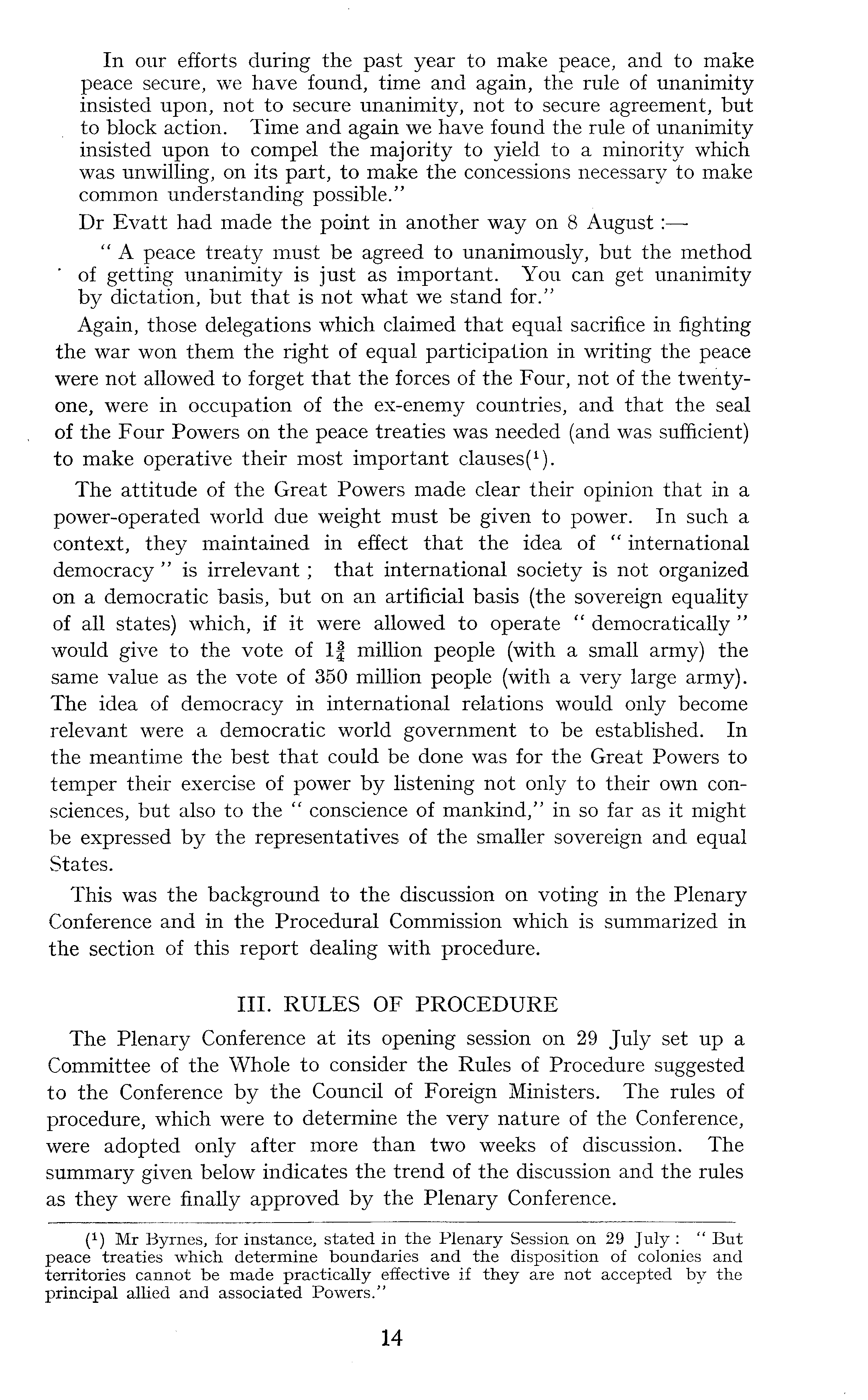 In our efforts during the past year to make peace, and to make peace secure, we have found, time and again, the rule of unanimity insisted upon, not to secure unanimity, not to secure agreement, but to block action. Time and again we have found the rule of unanimity insisted upon to compel the majority to yield to a minority which was unwilling, on its part, to make the concessions necessary to make common understanding possible." Dr Evatt had made the point in another way on 8 August : " A peace treaty must be agreed to unanimously, but the method of getting unanimity is just as important. You can get unanimity by dictation, but that is not what we stand for." Again, those delegations which claimed that equal sacrifice in fighting the war won them the right of equal participation in writing the peace were not allowed to forget that the forces of the Four, not of the twentyone, were in occupation of the ex-enemy countries, and that the seal of the Four Powers on the peace treaties was needed (and was sufficient) to make operative their most important clauses^). The attitude of the Great Powers made clear their opinion that in a power-operated world due weight must be given to power. In such a context, they maintained in effect that the idea of " international democracy "is irrelevant; that international society is not organized on a democratic basis, but on an artificial basis (the sovereign equality of all states) which, if it were allowed to operate " democratically " would give to the vote of If million people (with a small army) the same value as the vote of 350 million people (with a very large army). The idea of democracy in international relations would only become relevant were a democratic world government to be established. In the meantime the best that could be done was for the Great Powers to temper their exercise of power by listening not only to their own consciences, but also to the " conscience of mankind," in so far as it might be expressed by the representatives of the smaller sovereign and equal States. This was the background to the discussion on voting in the Plenary Conference and in the Procedural Commission which is summarized in the section of this report dealing with procedure. 111. RULES OF PROCEDURE The Plenary Conference at its opening session on 29 July set up a Committee of the Whole to consider the Rules of Procedure suggested to the Conference by the Council of Foreign Ministers. The rules of procedure, which were to determine the very nature of the Conference, were adopted only after more than two weeks of discussion. The summary given below indicates the trend of the discussion and the rules as they were finally approved by the Plenary Conference.
