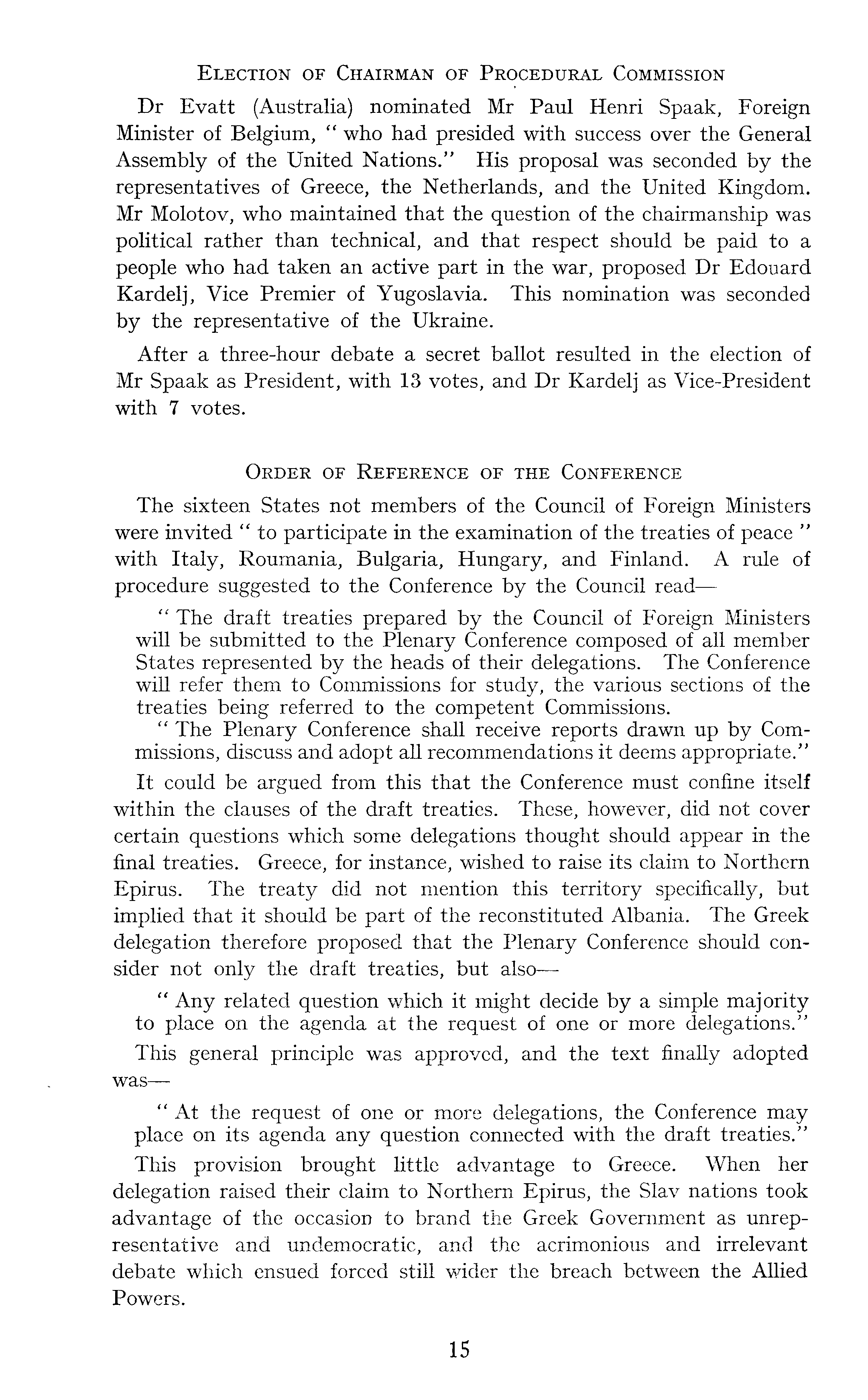 Election of Chairman of Procedural Commission Dr Evatt (Australia) nominated Mr Paul Henri Spaak, Foreign Minister of Belgium, " who had presided with success over the General Assembly of the United Nations." His proposal was seconded by the representatives of Greece, the Netherlands, and the United Kingdom. Mr Molotov, who maintained that the question of the chairmanship was political rather than technical, and that respect should be paid to a people who had taken an active part in the war, proposed Dr Edouard Kardelj, Vice Premier of Yugoslavia. This nomination was seconded by the representative of the Ukraine. After a three-hour debate a secret ballot resulted in the election of Mr Spaak as President, with 13 votes, and Dr Kardelj as Vice-President with 7 votes. Order of Reference of the Conference The sixteen States not members of the Council of Foreign Ministers were invited " to participate in the examination of the treaties of peace " with Italy, Roumania, Bulgaria, Hungary, and Finland. A rule of procedure suggested to the Conference by the Council read — " The draft treaties prepared by the Council of Foreign Ministers will be submitted to the Plenary Conference composed of all member States represented by the heads of their delegations. The Conference will refer them to Commissions for study, the various sections of the treaties being referred to the competent Commissions. " The Plenary Conference shall receive reports drawn up by Commissions, discuss and adopt all recommendations it deems appropriate." It could be argued from this that the Conference must confine itself within the clauses of the draft treaties. These, however, did not cover certain questions which some delegations thought should appear in the final treaties. Greece, for instance, wished to raise its claim to Northern Epirus. The treaty did not mention this territory specifically, but implied that it should be part of the reconstituted Albania. The Greek delegation therefore proposed that the Plenary Conference should consider not only the draft treaties, but also—- " Any related question which it might decide by a simple majority to place on the agenda at the request of one or more delegations." This general principle was approved, and the text finally adopted was—- " At the request of one or more delegations, the Conference may place on its agenda any question connected with the draft treaties." This provision brought little advantage to Greece. When her delegation raised their claim to Northern Epirus, the Slav nations took advantage of the occasion to brand the Greek Government as unrepresentative and undemocratic, and the acrimonious and irrelevant debate which ensued forced still wider the breach between the Allied Powers.