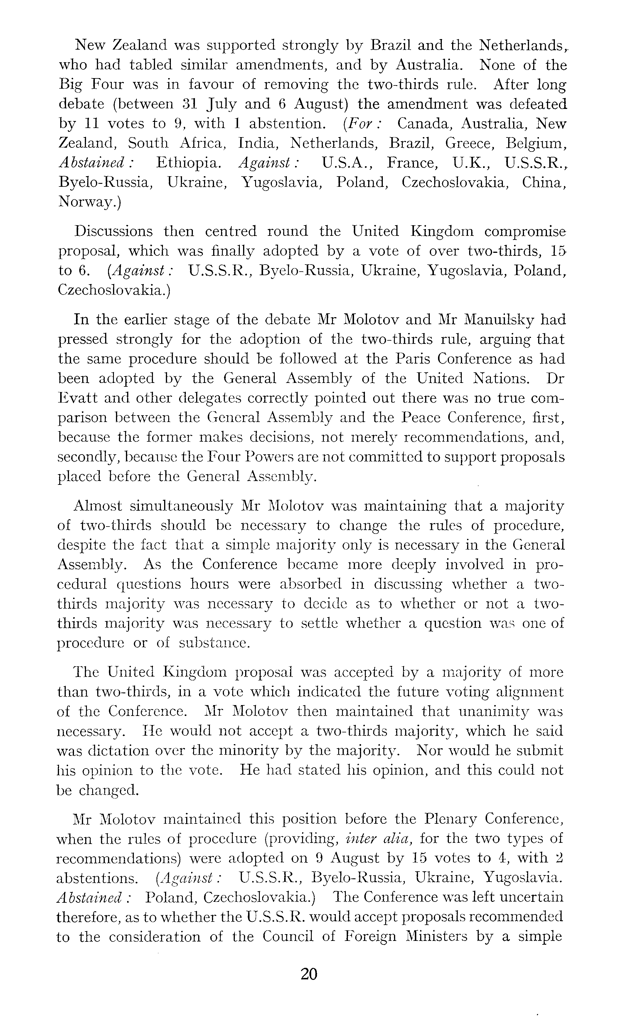 New Zealand was supported strongly by Brazil and the Netherlands r who had tabled similar amendments, and by Australia. None of the Big Four was in favour of removing the two-thirds rule. After long debate (between 31 July and 6 August) the amendment was defeated by 11 votes to 9, with 1 abstention. (For: Canada, Australia, New Zealand, South Africa, India, Netherlands, Brazil, Greece, Belgium, Abstained: Ethiopia. Against: U.S.A., France, U.K., U.S.S.R., Byelo-Russia, Ukraine, Yugoslavia, Poland, Czechoslovakia, China, Norway.) Discussions then centred round the United Kingdom compromise proposal, which was finally adopted by a vote of over two-thirds, 15 to 6. (Against: U.S.S.R., Byelo-Russia, Ukraine, Yugoslavia, Poland, Czechoslovakia.) In the earlier stage of the debate Mr Molotov and Mr Manuilsky had pressed strongly for the adoption of the two-thirds rule, arguing that the same procedure should be followed at the Paris Conference as had been adopted by the General Assembly of the United Nations. Dr Evatt and other delegates correctly pointed out there was no true comparison between the General Assembly and the Peace Conference, first, because the former makes decisions, not merely recommendations, and, secondly, because the Four Powers are not committed to support proposals placed before the General Assembly. Almost simultaneously Mr Molotov was maintaining that a majority of two-thirds should be necessary to change the rules of procedure, despite the fact that a simple majority only is necessary in the General Assembly. As the Conference became more deeply involved in procedural questions hours were absorbed in discussing whether a twothirds majority was necessary to decide as to whether or not a twothirds majority was necessary to settle whether a question was one of procedure or of substance. The United Kingdom proposal was accepted by a majority of more than two-thirds, in a vote which indicated the future voting alignment of the Conference. Mr Molotov then maintained that unanimity was necessary. He would not accept a two-thirds majority, which he said was dictation over the minority by the majority. Nor would he submit his opinion to the vote. He had stated his opinion, and this could not be changed. Mr Molotov maintained this position before the Plenary Conference, when the rules of procedure (providing, inter alia, for the two types of recommendations) were adopted on 9 August by 15 votes to 4, with 2 abstentions. (Against: U.S.S.R., Byelo-Russia, Ukraine, Yugoslavia. Abstained : Poland, Czechoslovakia.) The Conference was left uncertain therefore, as to whether the U.S.S.R. would accept proposals recommended to the consideration of the Council of Foreign Ministers by a simple