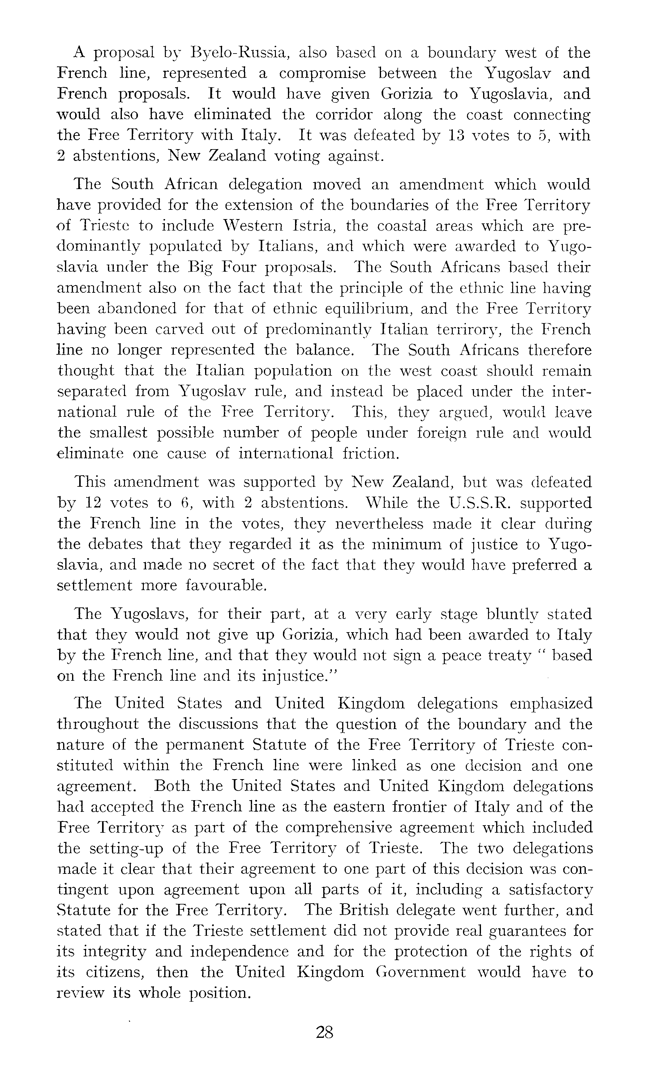 A proposal by B}/elo-Russia, also based on a boundary west of the French line, represented a compromise between the Yugoslav and French proposals. It would have given Gorizia to Yugoslavia, and would also have eliminated the corridor along the coast connecting the Free Territory with Italy. It was defeated by 13 votes to 5, with 2 abstentions, New Zealand voting against. The South African delegation moved an amendment which would have provided for the extension of the boundaries of the Free Territory of Trieste to include Western Istria, the coastal areas which are predominantly populated by Italians, and which were awarded to Yugoslavia under the Big Four proposals. The South Africans based their amendment also on the fact that the principle of the ethnic line having been abandoned for that of ethnic equilibrium, and the Free Territory having been carved out of predominantly Italian terrirory, the French line no longer represented the balance. The South Africans therefore thought that the Italian population on the west coast should remain separated from Yugoslav rule, and instead be placed under the international rule of the Free Territory. This, they argued, would leave the smallest possible number of people under foreign rule and would eliminate one cause of international friction. This amendment was supported by New Zealand, but was defeated by 12 votes to 6, with 2 abstentions. While the U.S.S.R. supported the French line in the votes, they nevertheless made it clear during the debates that they regarded it as the minimum of justice to Yugoslavia, and made no secret of the fact that they would have preferred a settlement more favourable. The Yugoslavs, for their part, at a very early stage bluntly stated that they would not give up Gorizia, which had been awarded to Italy by the French line, and that they would not sign a peace treaty " based on the French line and its injustice." The United States and United Kingdom delegations emphasized throughout the discussions that the question of the boundary and the nature of the permanent Statute of the Free Territory of Trieste constituted within the French line were linked as one decision and one agreement. Both the United States and United Kingdom delegations had accepted the French line as the eastern frontier of Italy and of the Free Territory as part of the comprehensive agreement which included the setting-up of the Free Territory of Trieste. The two delegations made it clear that their agreement to one part of this decision was contingent upon agreement upon all parts of it, including a satisfactory Statute for the Free Territory. The British delegate went further, and stated that if the Trieste settlement did not provide real guarantees for its integrity and independence and for the protection of the rights of its citizens, then the United Kingdom Government would have to review its whole position.