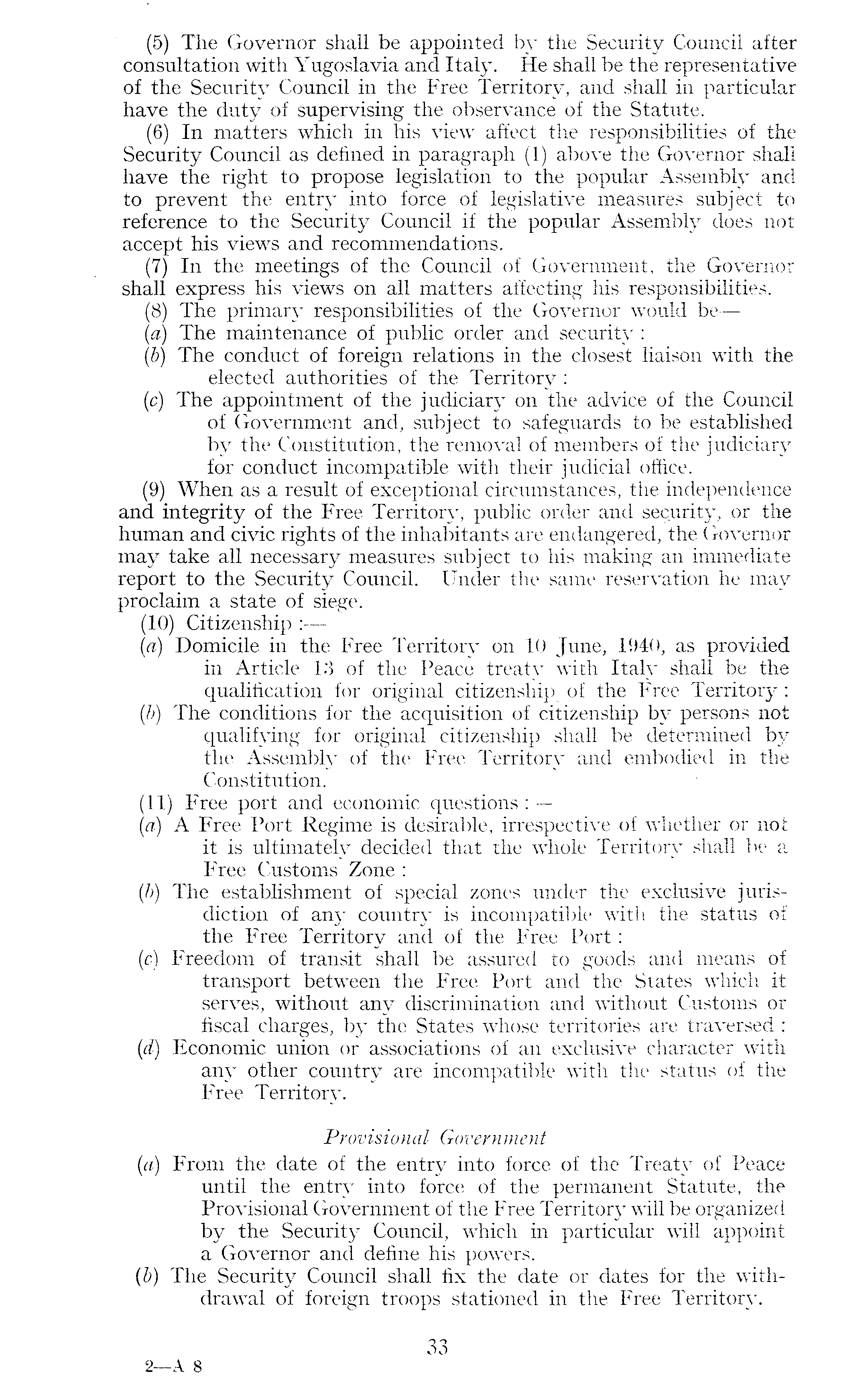(5) The Governor shall be appointed by the Security Council after consultation with Yugoslavia and Italy. He shall be the representative of the Security Council in the Free Territory, and shall in particular have the duty of supervising the observance of the Statute. (6) In matters which in his view affect the responsibilities of the Security Council as defined in paragraph (1) above the Governor shall have the right to propose legislation to the popular Assembly and to prevent the entry into force of legislative measures subject to reference to the Security Council if the popular Assembly does not accept his views and recommendations. (7) In the meetings of the Council of Government, the Governor shall express his views on all matters affecting his responsibilities. (8) The primary responsibilities of the Governor would be — (a) The maintenance of public order and security : (b) The conduct of foreign relations in the closest liaison with the elected authorities of the Territory : (c) The appointment of the judiciary on the advice of the Council of Government and, subject to safeguards to be established by the Constitution, the removal of members of the judiciary for conduct incompatible with their judicial office. (9) When as a result of exceptional circumstances, the independence and integrity of the Free Territory, public order and security, or the human and civic rights of the inhabitants are endangered, the Governor may take all necessary measures subject to his making an immediate report to the Security Council. Under the same reservation he may proclaim a state of siege. (10) Citizenship : (a) Domicile in the Free Territory on 10 June, 1940, as provided in Article 13 of the Peace treaty with Italy shall be the qualification for original citizenship of the Free Territory : (b) The conditions for the acquisition of citizenship by persons not qualifying for original citizenship shall be determined by the Assembly of the Free Territory and embodied in the Constitution. (11) Free port and economic questions : (a) A Free Port Regime is desirable, irrespective of whether or not it is ultimately decided that the whole Territory shall be a Free Customs Zone : (b) The establishment of special zones under the exclusive jurisdiction of any country is incompatible with the status of the Free Territory and of the Free Port : (c) Freedom of transit shall be assured to goods and means of transport between the Free Port and the States which it serves, without any discrimination and without Customs or fiscal charges, by the States whose territories are traversed : (d) Economic union or associations of an exclusive character with any other country are incompatible with the status of the Free Territory. Provisional Government (a) From the date of the entry into force of the Treaty of Peace until the entry into force of the permanent Statute, the Provisional Government of the Free Territory will be organized by the Security Council, which in particular will appoint a Governor and define his powers. (b) The Security Council shall fix the date or dates for the withdrawal of foreign troops stationed in the Free Territory.