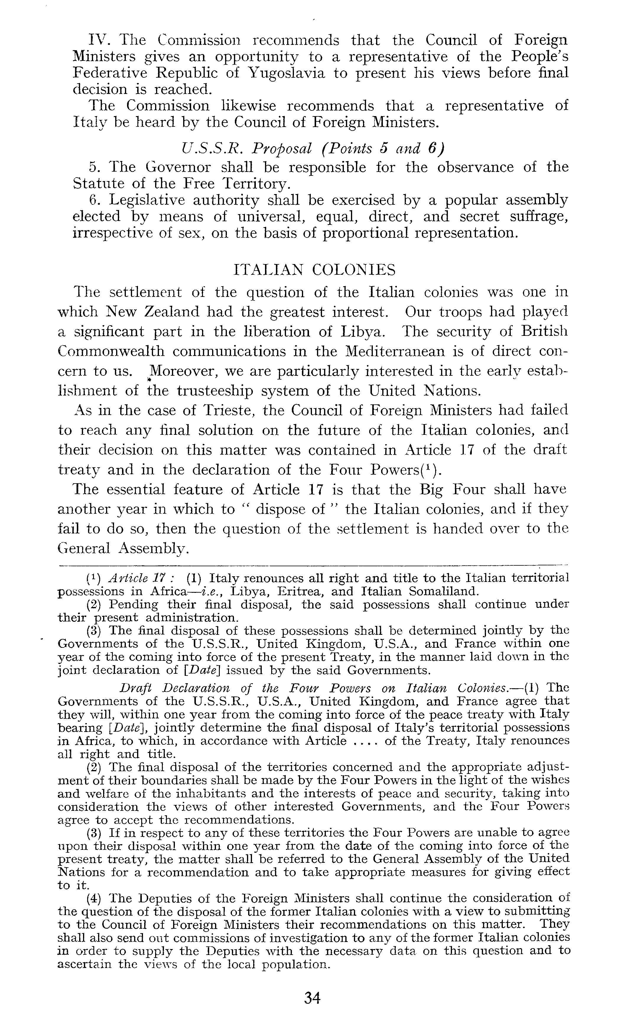 IV. The Commission recommends that the Council of Foreign Ministers gives an opportunity to a representative of the People's Federative Republic of Yugoslavia to present his views before final decision is reached. The Commission likewise recommends that a representative of Italy be heard by the Council of Foreign Ministers. U.S.S.R. Proposal (Points 5 and 6) 5. The Governor shall be responsible for the observance of the Statute of the Free Territory. 6. Legislative authority shall be exercised by a popular assembly elected by means of universal, equal, direct, and secret suffrage, irrespective of sex, on the basis of proportional representation. ITALIAN COLONIES The settlement of the question of the Italian colonies was one in which New Zealand had the greatest interest. Our troops had played a significant part in the liberation of Libya. The security of British Commonwealth communications in the Mediterranean is of direct concern to us. we are particularly interested in the early establishment of the trusteeship system of the United Nations. As in the case of Trieste, the Council of Foreign Ministers had failed to reach any final solution on the future of the Italian colonies, and their decision on this matter was contained in Article 17 of the draft treaty and in the declaration of the Four Powers( 1 ). The essential feature of Article 17 is that the Big Four shall have another year in which to dispose of " the Italian colonies, and if they fail to do so, then the question of the settlement is handed over to the General Assembly.