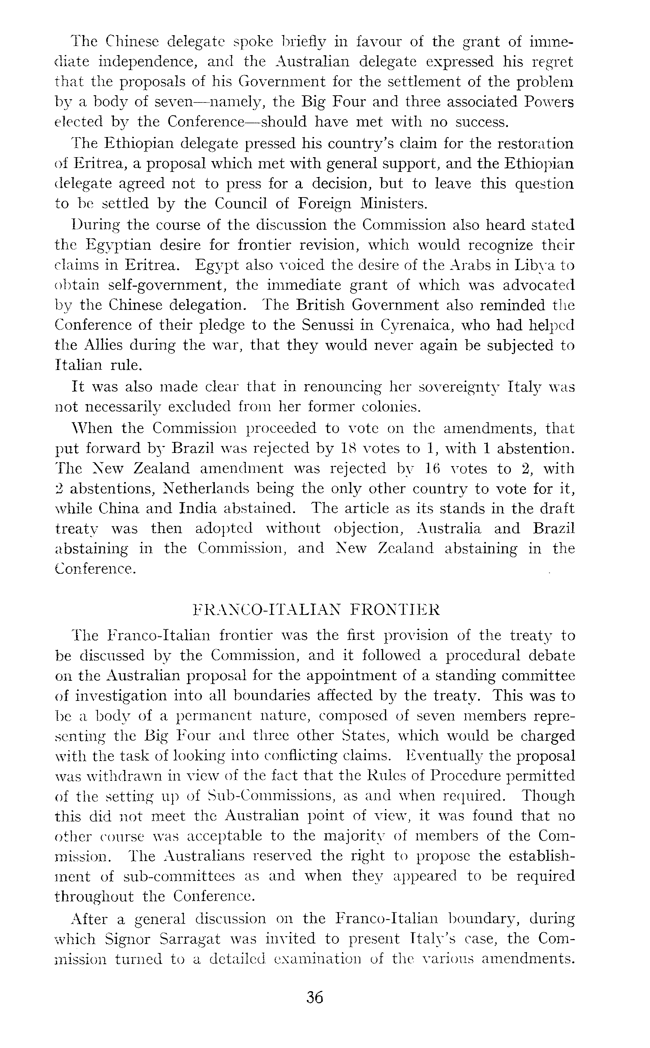 The Chinese delegate spoke briefly in favour of the grant of immediate independence, and the Australian delegate expressed his regret that the proposals of his Government for the settlement of the problem by a body of seven —namely, the Big Four and three associated Powers elected by the Conference—should have met with no success. The Ethiopian delegate pressed his country's claim for the restoration of Eritrea, a proposal which met with general support, and the Ethiopian delegate agreed not to press for a decision, but to leave this question to be settled by the Council of Foreign Ministers. During the course of the discussion the Commission also heard stated the Egyptian desire for frontier revision, which would recognize their claims in Eritrea. Egypt also voiced the desire of the Arabs in Libya to obtain self-government, the immediate grant of which was advocated by the Chinese delegation. The British Government also reminded the Conference of their pledge to the Senussi in Cyrenaica, who had helped the Allies during the war, that they would never again be subjected to Italian rule. It was also made clear that in renouncing her sovereignty Italy was not necessarily excluded from her former colonies. When the Commission proceeded to vote on the amendments, that put forward by Brazil was rejected by 18 votes to 1, with 1 abstention. The New Zealand amendment was rejected by 16 votes to 2, with 2 abstentions, Netherlands being the only other country to vote for it, while China and India abstained. The article as its stands in the draft treaty was then adopted without objection, Australia and Brazil abstaining in the Commission, and New Zealand abstaining in the Conference. FRANCO-ITALIAN FRONTIER The Franco-Italian frontier was the first provision of the treaty to be discussed by the Commission, and it followed a procedural debate on the Australian proposal for the appointment of a standing committee of investigation into all boundaries affected by the treaty. This was to be a body of a permanent nature, composed of seven members representing the Big Four and three other States, which would be charged with the task of looking into conflicting claims. Eventually the proposal was withdrawn in view of the fact that the Rules of Procedure permitted of the setting up of Sub-Commissions, as and when required. Though this did not meet the Australian point of view, it was found that no other course was acceptable to the majority of members of the Commission. The Australians reserved the right to propose the establishment of sub-committees as and when they appeared to be required throughout the Conference. After a general discussion on the Franco-Italian boundary, during which Signor Sarragat was invited to present Italy's case, the Commission turned to a detailed examination of the various amendments.