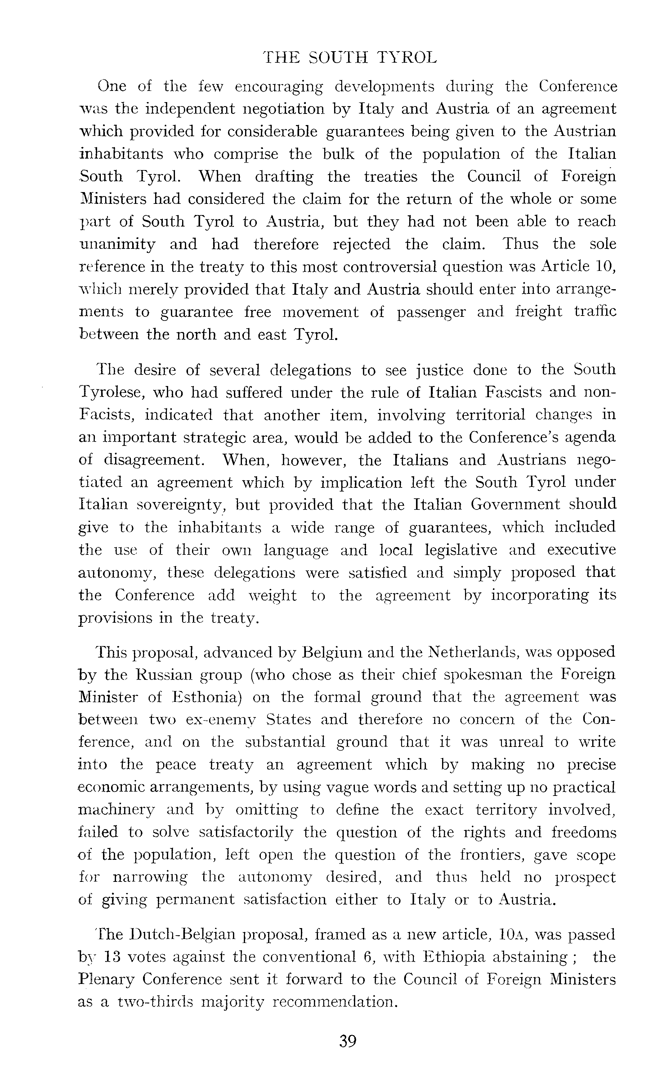 THE SOUTH TYROL One of the few encouraging developments during the Conference was the independent negotiation by Italy and Austria of an agreement which provided for considerable guarantees being given to the Austrian inhabitants who comprise the bulk of the population of the Italian South Tyrol. When drafting the treaties the Council of Foreign Ministers had considered the claim for the return of the whole or some part of South Tyrol to Austria, but they had not been able to reach unanimity and had therefore rejected the claim. Thus the sole reference in the treaty to this most controversial question was Article 10, which merely provided that Italy and Austria should enter into arrangements to guarantee free movement of passenger and freight traffic between the north and east Tyrol. The desire of several delegations to see justice done to the South Tyrolese, who had suffered under the rule of Italian Fascists and nonFacists, indicated that another item, involving territorial changes in an important strategic area, would be added to the Conference's agenda of disagreement. When, however, the Italians and Austrians negotiated an agreement which by implication left the South Tyrol under Italian sovereignty, but provided that the Italian Government should give to the inhabitants a wide range of guarantees, which included the use of their own language and local legislative and executive autonomy, these delegations were satisfied and simply proposed that the Conference add weight to the agreement by incorporating its provisions in the treaty. This proposal, advanced by Belgium and the Netherlands, was opposed by the Russian group (who chose as their chief spokesman the Foreign Minister of Esthonia) on the formal ground that the agreement was between two ex-enemy States and therefore no concern of the Conference, and on the substantial ground that it was unreal to write into the peace treaty an agreement which by making no precise economic arrangements, by using vague words and setting up no practical machinery and by omitting to define the exact territory involved, failed to solve satisfactorily the question of the rights and freedoms of the population, left open the question of the frontiers, gave scope for narrowing the autonomy desired, and thus held no prospect of giving permanent satisfaction either to Italy or to Austria. The Dutch-Belgian proposal, framed as a new article, 10a, was passed by 13 votes against the conventional 6, with Ethiopia abstaining; the Plenary Conference sent it forward to the Council of Foreign Ministers as a two-thirds majority recommendation.