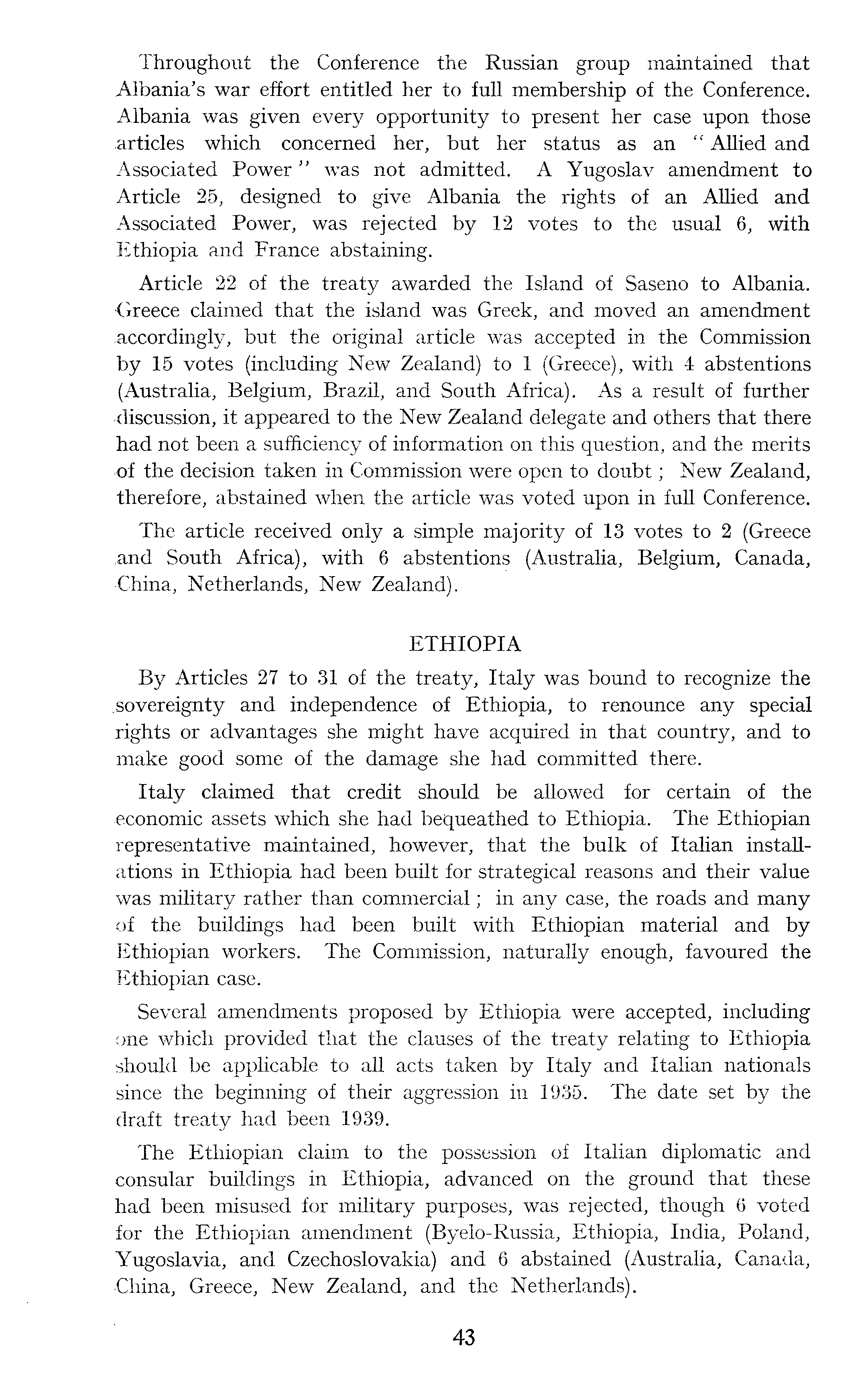 Throughout the Conference the Russian group maintained that Albania's war effort entitled her to full membership of the Conference. Albania was given every opportunity to present her case upon those .articles which concerned her, but her status as an " Allied and Associated Power" was not admitted. A Yugoslav amendment to Article 25, designed to give Albania the rights of an Allied and Associated Power, was rejected by 12 votes to the usual 6, with Ethiopia and France abstaining. Article 22 of the treaty awarded the Island of Saseno to Albania. Greece claimed that the island was Greek, and moved an amendment accordingly, but the original article was accepted in the Commission by 15 votes (including New Zealand) to 1 (Greece), with 4 abstentions (Australia, Belgium, Brazil, and South Africa). As a result of further discussion, it appeared to the New Zealand delegate and others that there had not been a sufficiency of information on this question, and the merits of the decision taken in Commission were open to doubt; New Zealand, therefore, abstained when the article was voted upon in full Conference. The article received only a simple majority of 13 votes to 2 (Greece and South Africa), with 6 abstentions (Australia, Belgium, Canada, China, Netherlands, New Zealand). ETHIOPIA By Articles 27 to 31 of the treaty, Italy was bound to recognize the sovereignty and independence of Ethiopia, to renounce any special rights or advantages she might have acquired in that country, and to make good some of the damage she had committed there. Italy claimed that credit should be allowed for certain of the economic assets which she had bequeathed to Ethiopia. The Ethiopian representative maintained, however, that the bulk of Italian installations in Ethiopia had been built for strategical reasons and their value was military rather than commercial; in any case, the roads and many of the buildings had been built with Ethiopian material and by Ethiopian workers. The Commission, naturally enough, favoured the Ethiopian case. Several amendments proposed by Ethiopia were accepted, including one which provided that the clauses of the treaty relating to Ethiopia should be applicable to all acts taken by Italy and Italian nationals since the beginning of their aggression in 1935. The date set by the draft treaty had been 1939. The Ethiopian claim to the possession of Italian diplomatic and consular buildings in Ethiopia, advanced on the ground that these had been misused for military purposes, was rejected, though 6 voted for the Ethiopian amendment (Byelo-Russia, Ethiopia, India, Poland, Yugoslavia, and Czechoslovakia) and 6 abstained (Australia, Canada, China, Greece, New Zealand, and the Netherlands).
