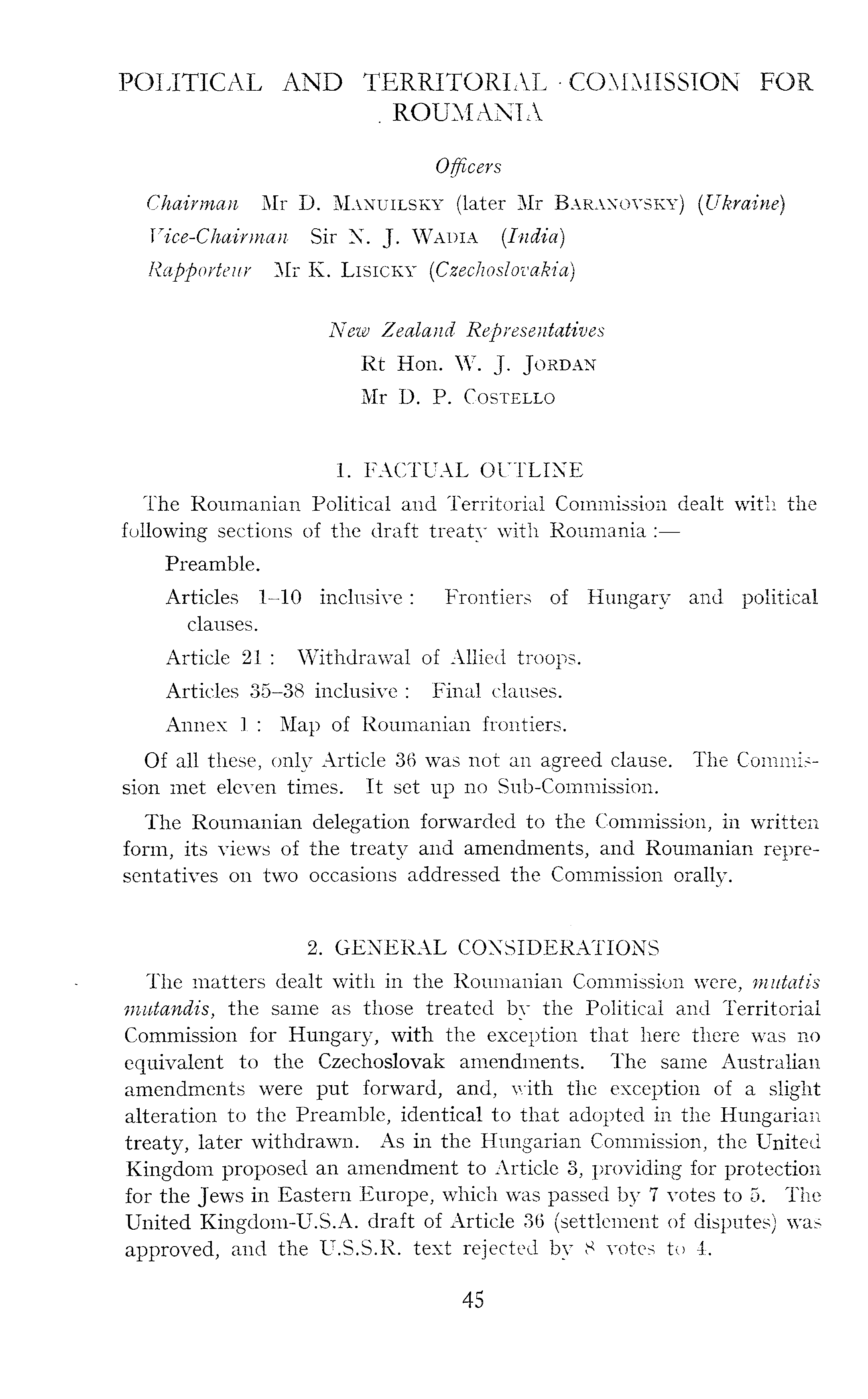 POLITICAL AND TERRITORIAL COMMISSION FOR . ROUMANIA Officers Chairman Mr D. Manuilsky (later Mr Baranovsky) {Ukraine) Vice-Chair man Sir N. J. Wadia (India) Rapporteur Mr K. Lisicky (Czechoslovakia) New Zealand Representatives Rt Hon. W. J. Jordan Mr D. P. Costello 1. FACTUAL OUTLINE The Roumanian Political and Territorial Commission dealt with the following sections of the draft treat}' with Roumania : Preamble. Articles 1-10 inclusive : Frontiers of Hungary and political clauses. Article 21 : Withdrawal of Allied troops. Articles 35-38 inclusive : Final clauses. Annex 1 : Map of Roumanian frontiers. Of all these, only Article 36 was not an agreed clause. The Commission met eleven times. It set up no Sub-Commission. The Roumanian delegation forwarded to the Commission, in written form, its views of the treaty and amendments, and Roumanian representatives on two occasions addressed the Commission orally. 2. GENERAL CONSIDERATIONS The matters dealt with in the Roumanian Commission were, mutatis mutandis, the same as those treated by the Political and Territorial Commission for Hungary, with the exception that here there was no equivalent to the Czechoslovak amendments. The same Australian amendments were put forward, and, with the exception of a slight alteration to the Preamble, identical to that adopted in the Hungarian treaty, later withdrawn. As in the Hungarian Commission, the United Kingdom proposed an amendment to Article 3, providing for protection for the Jews in Eastern Europe, which was passed by 7 votes to 5. The United Kingdom-U.S.A. draft of Article 36 (settlement of disputes) was approved, and the U.S.S.R. text rejected by 8 votes to 4.