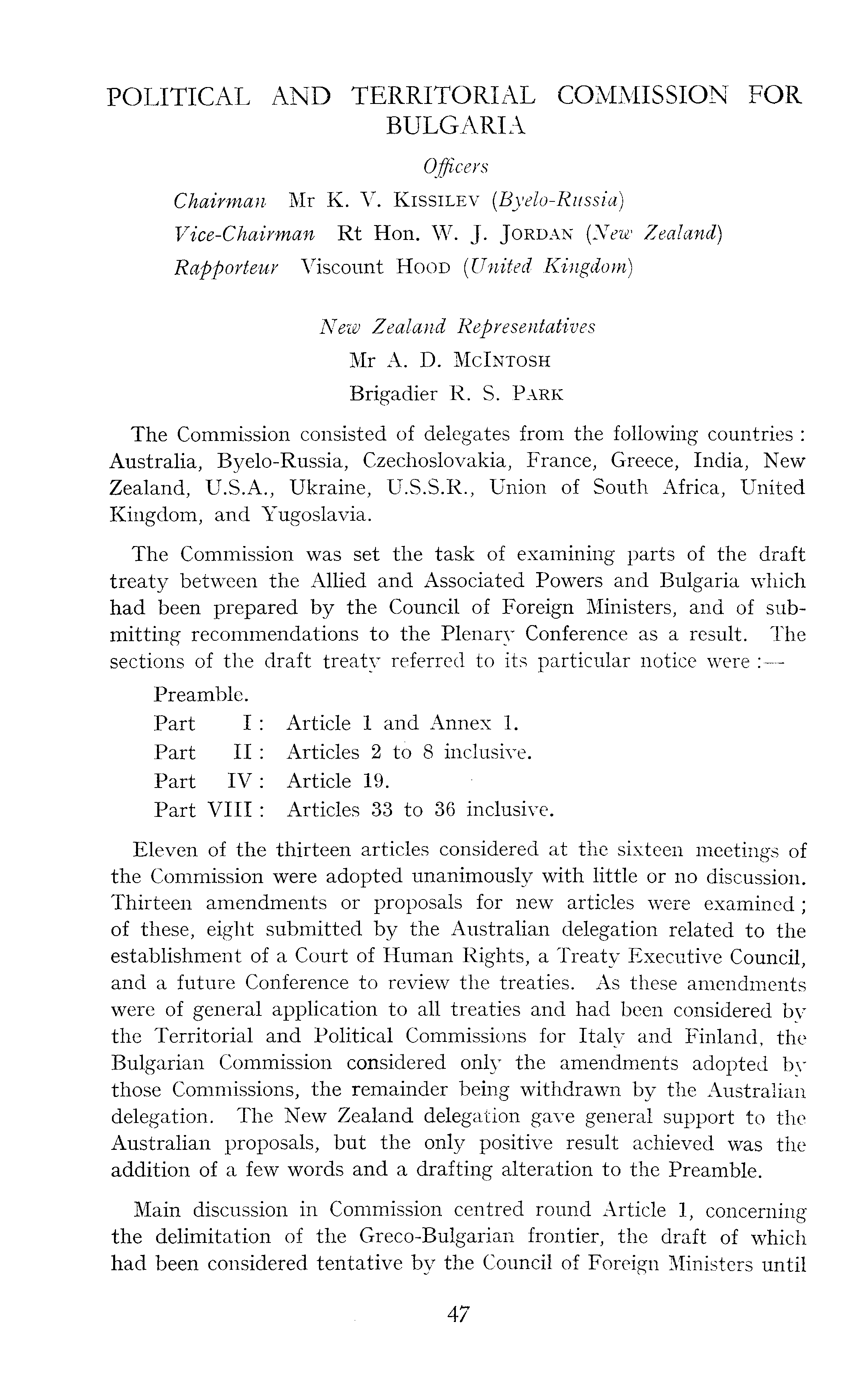 POLITICAL AND TERRITORIAL COMMISSION FOR BULGARIA Officers Chairman Mr K. V. Kissilev (Byelo-Russia) Vice-Chairman Rt Hon. W. J. Jordan {New Zealand) Rapporteur Viscount Hood [United Kingdom) New Zealand Representatives Mr A. D. Mclntosh Brigadier R. S. Park The Commission consisted of delegates from the following countries : Australia, Byelo-Russia, Czechoslovakia, France, Greece, India, NewZealand, U.S.A., Ukraine, U.S.S.R., Union of South Africa, United Kingdom, and Yugoslavia. The Commission was set the task of examining parts of the draft treaty between the Allied and Associated Powers and Bulgaria which had been prepared by the Council of Foreign Ministers, and of submitting recommendations to the Plenary Conference as a result. The sections of the draft treaty referred to its particular notice were : Preamble. Part I : Article 1 and Annex 1. Part II : Articles 2 to 8 inclusive. Part IV: Article 19. Part VIII : Articles 33 to 36 inclusive. Eleven of the thirteen articles considered at the sixteen meetings of the Commission were adopted unanimously with little or no discussion. Thirteen amendments or proposals for new articles were examined ; of these, eight submitted by the Australian delegation related to the establishment of a Court of Human Rights, a Treaty Executive Council, and a future Conference to review the treaties. As these amendments were of general application to all treaties and had been considered by the Territorial and Political Commissions for Italy and Finland, the Bulgarian Commission considered only the amendments adopted by those Commissions, the remainder being withdrawn by the Australian delegation. The New Zealand delegation gave general support to the Australian proposals, but the only positive result achieved was the addition of a few words and a drafting alteration to the Preamble. Main discussion in Commission centred round Article 1, concerning the delimitation of the Greco-Bulgarian frontier, the draft of which had been considered tentative by the Council of Foreign Ministers until