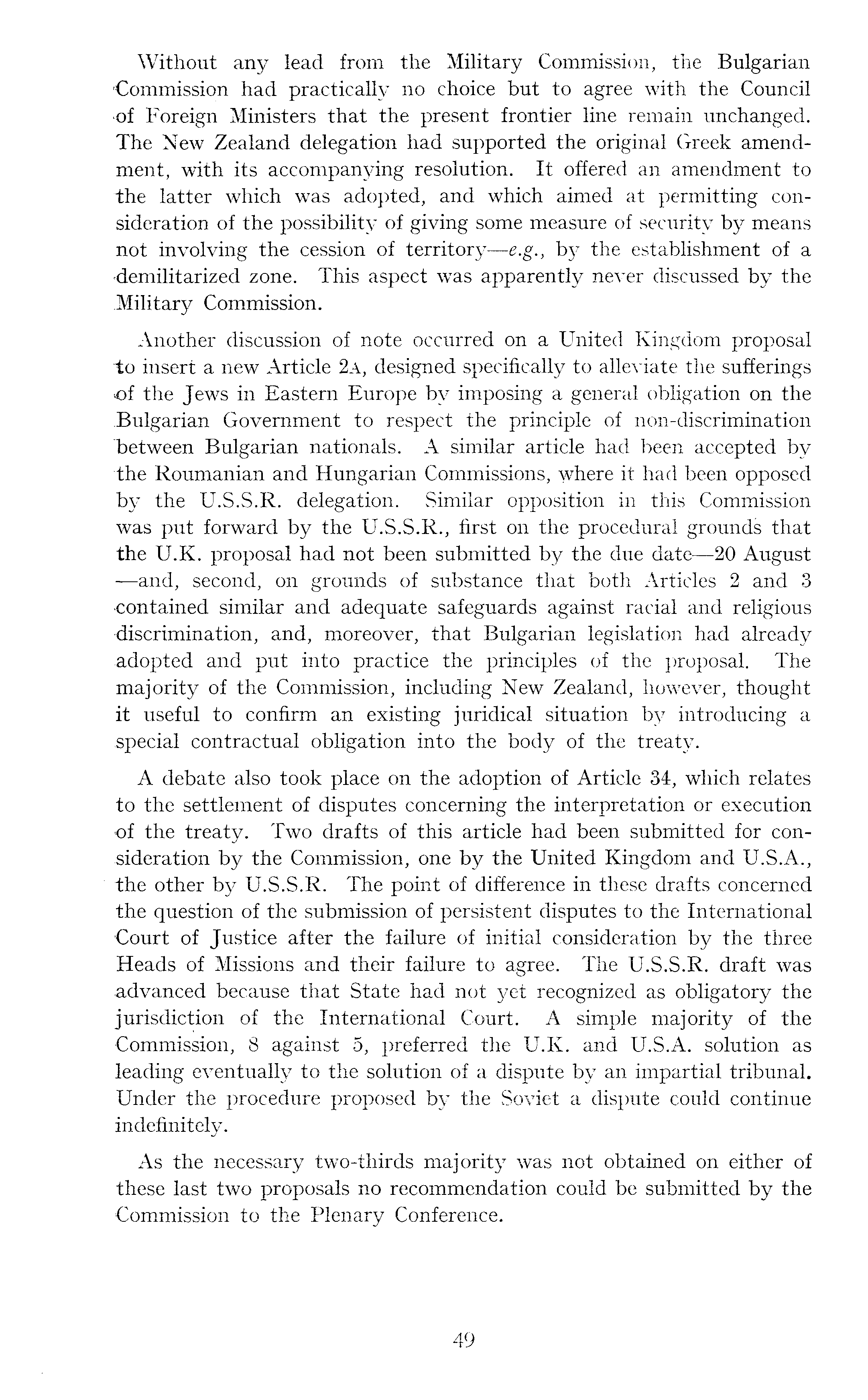 Without any lead from the Military Commission, the Bulgarian Commission had practically no choice but to agree with the Council of Foreign Ministers that the present frontier line remain unchanged. The New Zealand delegation had supported the original Greek amendment, with its accompanying resolution. It offered an amendment to the latter which was adopted, and which aimed at permitting consideration of the possibility of giving some measure of security by means not involving the cession of territory— e.g., by the establishment of a •demilitarized zone. This aspect was apparently never discussed by the Military Commission. Another discussion of note occurred on a United Kingdom proposal to insert a new Article 2a, designed specifically to alleviate the sufferings of the Jews in Eastern Europe by imposing a general obligation on the Bulgarian Government to respect the principle of non-discrimination between Bulgarian nationals. A similar article had been accepted by the Roumanian and Hungarian Commissions, where it had been opposed by the U.S.S.R. delegation. Similar opposition in this Commission was put forward by the U.S.S.R., first on the procedural grounds that the U.K. proposal had not been submitted by the due date —20 August —and, second, on grounds of substance that both Articles 2 and 3 contained similar and adequate safeguards against racial and religious discrimination, and, moreover, that Bulgarian legislation had already adopted and put into practice the principles of the proposal. The majority of the Commission, including New Zealand, however, thought it useful to confirm an existing juridical situation by introducing a special contractual obligation into the body of. the treaty. A debate also took place on the adoption of Article 34, which relates to the settlement of disputes concerning the interpretation or execution of the treaty. Two drafts of this article had been submitted for consideration by the Commission, one by the United Kingdom and U.S.A., the other by U.S.S.R. The point of difference in these drafts concerned the question of the submission of persistent disputes to the International Court of Justice after the failure of initial consideration by the three Heads of Missions and their failure to agree. The U.S.S.R. draft was advanced because that State had not yet recognized as obligatory the jurisdiction of the International Court. A simple majority of the Commission, 8 against 5, preferred the U.K. and U.S.A. solution as leading eventually to the solution of a dispute by an impartial tribunal. Under the procedure proposed by the Soviet a dispute could continue indefinitely. As the necessary two-thirds majority was not obtained on either of these last two proposals no recommendation could be submitted by the Commission to the Plenary Conference.