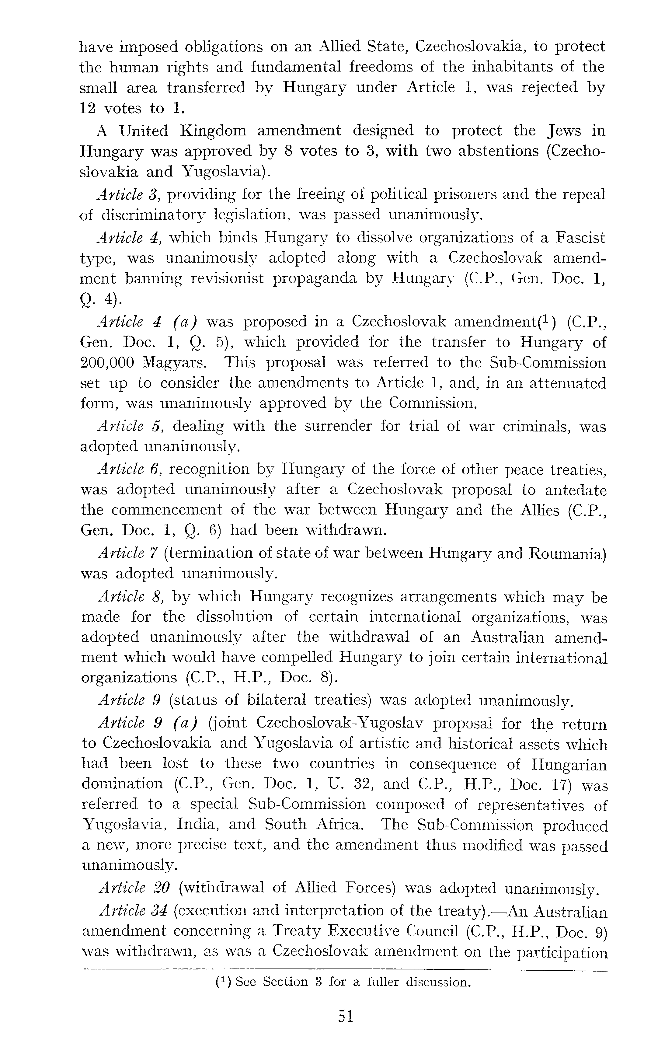 have imposed obligations on an Allied State, Czechoslovakia, to protect the human rights and fundamental freedoms of the inhabitants of the small area transferred by Hungary under Article 1, was rejected by 12 votes to 1. A United Kingdom amendment designed to protect the Jews in Hungary was approved by 8 votes to 3, with two abstentions (Czechoslovakia and Yugoslavia). Article 3, providing for the freeing of political prisoners and the repeal of discriminatory legislation, was passed unanimously. Article 4, which binds Hungary to dissolve organizations of a Fascist type, was unanimously adopted along with a Czechoslovak amendment banning revisionist propaganda by Hungary (C.P., Gen. Doc. 1, Q. 4). Article 4 (a) was proposed in a Czechoslovak amendment^) (C.P., Gen. Doc. 1, Q. 5), which provided for the transfer to Hungary of 200,000 Magyars. This proposal was referred to the Sub-Commission set up to consider the amendments to Article 1, and, in an attenuated form, was unanimously approved by the Commission. Article 5, dealing with the surrender for trial of war criminals, was adopted unanimously. Article 6, recognition by Hungary of the force of other peace treaties, was adopted unanimously after a Czechoslovak proposal to antedate the commencement of the war between Hungary and the Allies (C.P., Gen. Doc. 1, Q. 6) had been withdrawn. Article 7 (termination of state of war between Hungary and Roumania) was adopted unanimously. Article 8, by which Hungary recognizes arrangements which may be made for the dissolution of certain international organizations, was adopted unanimously after the withdrawal of an Australian amendment which would have compelled Hungary to join certain international organizations (C.P., H.P., Doc. 8). Article 9 (status of bilateral treaties) was adopted unanimously. Article 9 (a) (joint Czechoslovak-Yugoslav proposal for the return to Czechoslovakia and Yugoslavia of artistic and historical assets which had been lost to these two countries in consequence of Hungarian domination (C.P., Gen. Doc. 1, U. 32, and C.P., H.P., Doc. 17) was referred to a special Sub-Commission composed of representatives of Yugoslavia, India, and South Africa. The Sub-Commission produced a new, more precise text, and the amendment thus modified was passed unanimously. Article 20 (withdrawal of Allied Forces) was adopted unanimously. Article 34 (execution and interpretation of the treaty).—An Australian amendment concerning a Treaty Executive Council (C.P., H.P., Doc. 9) was withdrawn, as was a Czechoslovak amendment on the participation