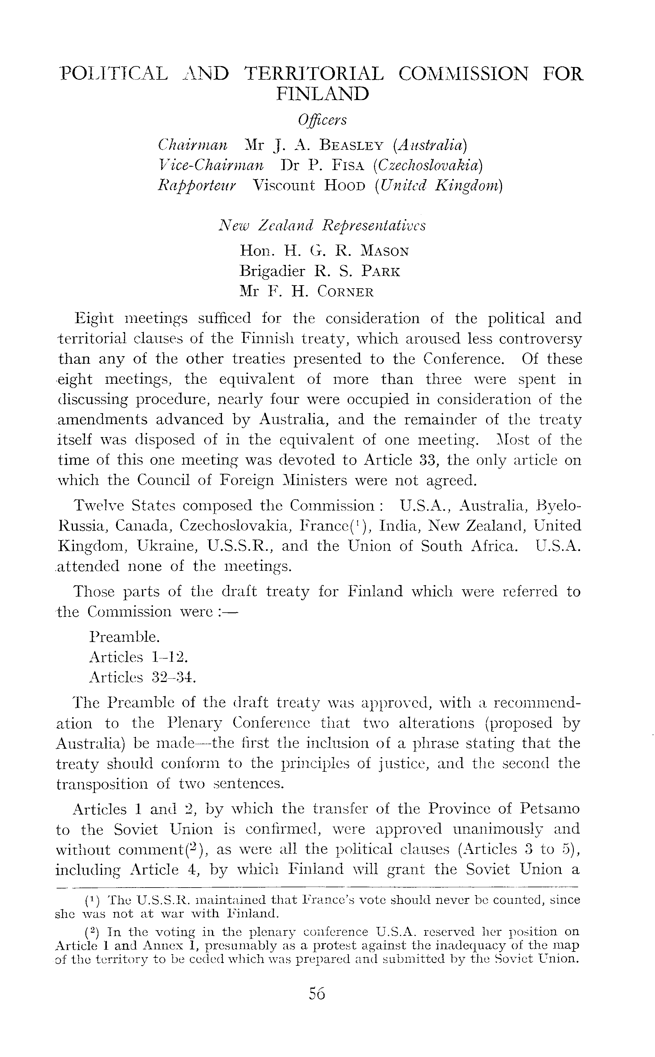 POLITICAL AND TERRITORIAL COMMISSION FOR FINLAND Officers Chairman Mr J. A. Beasley (Australia) Vice-Chairman Dr P. Fisa (Czechoslovakia) Rapporteur Viscount Hood (United Kingdom) New Zealand Representatives Hon. H. G. R. Mason Brigadier R. S. Park Mr F. H. Corner Eight meetings sufficed for the consideration of the political and territorial clauses of the Finnish treaty, which aroused less controversy than any of the other treaties presented to the Conference. Of these eight meetings, the equivalent of more than three were spent in discussing procedure, nearly four were occupied in consideration of the amendments advanced by Australia, and the remainder of the treaty itself was disposed of in the equivalent of one meeting. Most of the time of this one meeting was devoted to Article 33, the only article on which the Council of Foreign Ministers were not agreed. Twelve States composed the Commission : U.S.A., Australia, ByeloRussia, Canada, Czechoslovakia, France('), India, New Zealand, United Kingdom, Ukraine, U.S.S.R., and the Union of South Africa. U.S.A. .attended none of the meetings. Those parts of the draft treaty for Finland which were referred to the Commission were : Preamble. Articles 1-12. Articles 32-34. The Preamble of the draft treaty was approved, with a recommendation to the Plenary Conference that two alterations (proposed by Australia) be made —the first the inclusion of a phrase stating that the treaty should conform to the principles of justice, and the second the transposition of two sentences. Articles 1 and 2, by which the transfer of the Province of Petsamo to the Soviet Union is confirmed, were approved unanimously and without comment( 2 ), as were all the political clauses (Articles 3to 5), including Article 4, by which Finland will grant the Soviet Union a