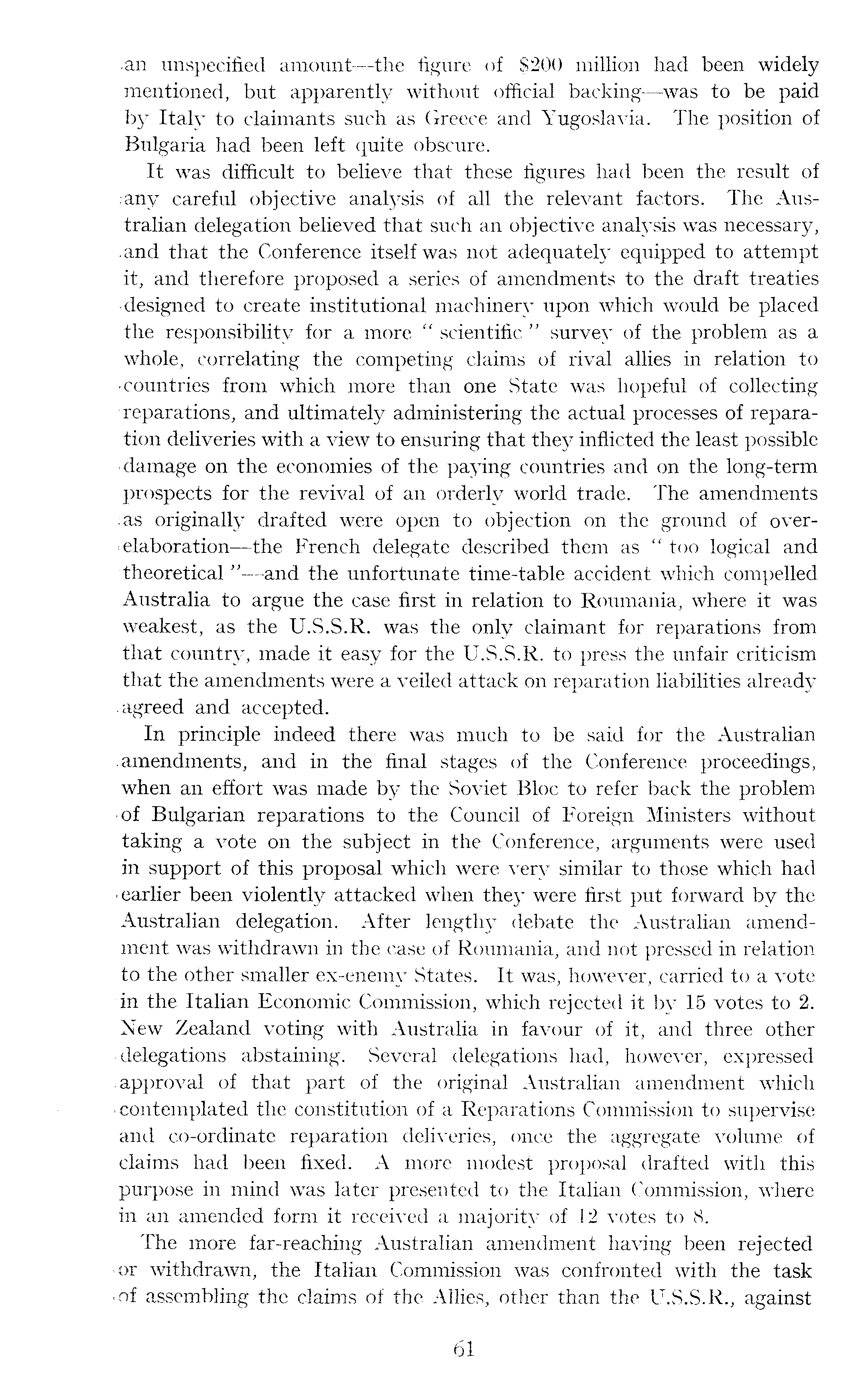 an unspecified amount —the figure of S2OO million had been widely mentioned, but apparently without official backing —was to be paid by Italy to claimants such as Greece and Yugoslavia. The position of Bulgaria had been left quite obscure. It was difficult to believe that these figures had been the result of .any careful objective analysis of all the relevant factors. The Australian delegation believed that such an objective analysis was necessary, .and that the Conference itself was not adequately equipped to attempt it, and therefore proposed a series of amendments to the draft treaties designed to create institutional machinery upon which would be placed the responsibility for a more " scientific " survey of the problem as a whole, correlating the competing claims of rival allies in relation to -countries from which more than one State was hopeful of collecting reparations, and ultimately administering the actual processes of reparation deliveries with a view to ensuring that they inflicted the least possible -damage on the economies of the paying countries and on the long-term prospects for the revival of an orderly world trade. The amendments :as originally drafted were open to objection on the ground of overelaboration —the French delegate described them as " too logical and theoretical " —and the unfortunate time-table accident which compelled Australia to argue the case first in relation to Roumania, where it was weakest, as the U.S.S.R. was the only claimant for reparations from that country, made it easy for the U.S.S.R. to press the unfair criticism that the amendments were a veiled attack on reparation liabilities already agreed and accepted. In principle indeed there was much to be said for the Australian amendments, and in the final stages of the Conference proceedings, when an effort was made by the Soviet Bloc to refer back the problem •of Bulgarian reparations to the Council of Foreign Ministers without taking a vote on the subject in the Conference, arguments were used in support of this proposal which were very similar to those which had ■ earlier been violently attacked when they were first put forward by the Australian delegation. After lengthy debate the Australian amendment was withdrawn in the case of Roumania, and not pressed in relation to the other smaller ex-enemy States. It was, however, carried to a vote in the Italian Economic Commission, which rejected it by 15 votes to 2. New Zealand voting with Australia in favour of it, and three other • delegations abstaining. Several delegations had, however, expressed .approval of that part of the original Australian amendment which contemplated the constitution of a Reparations Commission to supervise and co-ordinate reparation deliveries, once the aggregate volume of claims had been fixed. A more modest proposal drafted with this purpose in mind was later presented to the Italian Commission, where in an amended form it received a majority of 12 votes to 8. The more far-reaching Australian amendment having been rejected or withdrawn, the Italian Commission was confronted with the task of assembling the claims of the Allies, other than the U.S.S.R., against