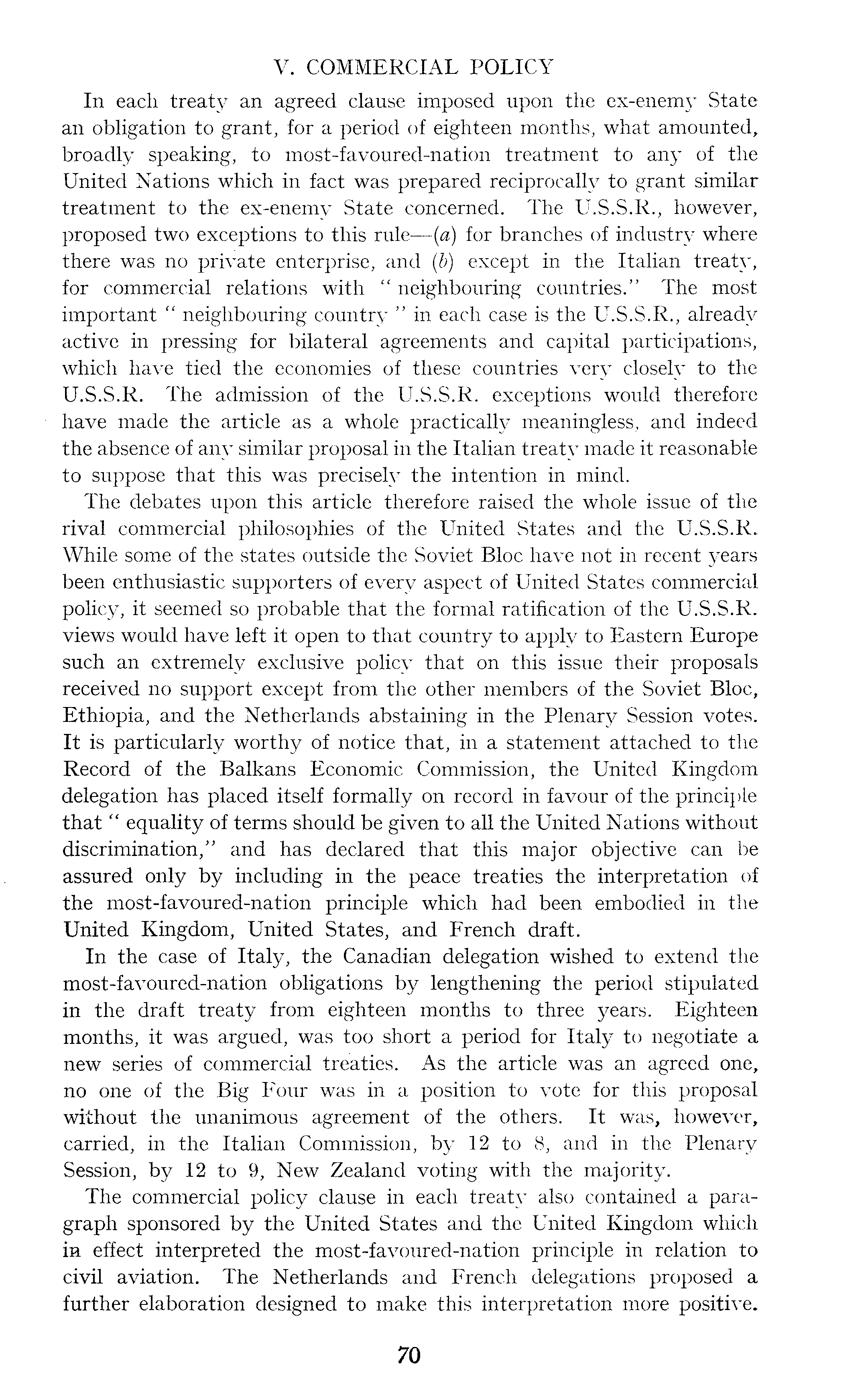 V. COMMERCIAL POLICY In each treaty an agreed clause imposed upon the ex-enemy State an obligation to grant, for a period of eighteen months, what amounted, broadly speaking, to most-favoured-nation treatment to any of the United Nations which in fact was prepared reciprocally to grant similar treatment to the ex-enemy State concerned. The U.S.S.R., however, proposed two exceptions to this rule — (a) for branches of industry where there was no private enterprise, and (b) except in the Italian treaty, for commercial relations with " neighbouring countries." The most important " neighbouring country " in each case is the U.S.S.R., already active in pressing for bilateral agreements and capital participations, which have tied the economies of these countries very closely to the U.S.S.R. The admission of the U.S.S.R. exceptions would therefore have made the article as a whole practically meaningless, and indeed the absence of any similar proposal in the Italian treaty made it reasonable to suppose that this was precisely the intention in mind. The debates upon this article therefore raised the whole issue of the rival commercial philosophies of the United States and the U.S.S.R. While some of the states outside the Soviet Bloc have not in recent years been enthusiastic supporters of every aspect of United States commercial policy, it seemed so probable that the formal ratification of the U.S.S.R. views would have left it open to that country to apply to Eastern Europe such an extremely exclusive policy that on this issue their proposals received no support except from the other members of the Soviet Bloc, Ethiopia, and the Netherlands abstaining in the Plenary Session votes. It is particularly worthy of notice that, in a statement attached to the Record of the Balkans Economic Commission, the United Kingdom delegation has placed itself formally on record in favour of the principle that " equality of terms should be given to all the United Nations without discrimination," and has declared that this major objective can be assured only by including in the peace treaties the interpretation of the most-favoured-nation principle which had been embodied in the United Kingdom, United States, and French draft. In the case of Italy, the Canadian delegation wished to extend the most-favoured-nation obligations by lengthening the period stipulated in the draft treaty from eighteen months to three years. Eighteen months, it was argued, was too short a period for Italy to negotiate a new series of commercial treaties. As the article was an agreed one, no one of the Big Four was in a position to vote for this proposal without the unanimous agreement of the others. It was, however, carried, in the Italian Commission, by 12 to 8, and in the Plenary Session, by 12 to 9, New Zealand voting with the majority. The commercial policy clause in each treaty also contained a paragraph sponsored by the United States and the United Kingdom which in effect interpreted the most-favoured-nation principle in relation to civil aviation. The Netherlands and French delegations proposed a further elaboration designed to make this interpretation more positive.