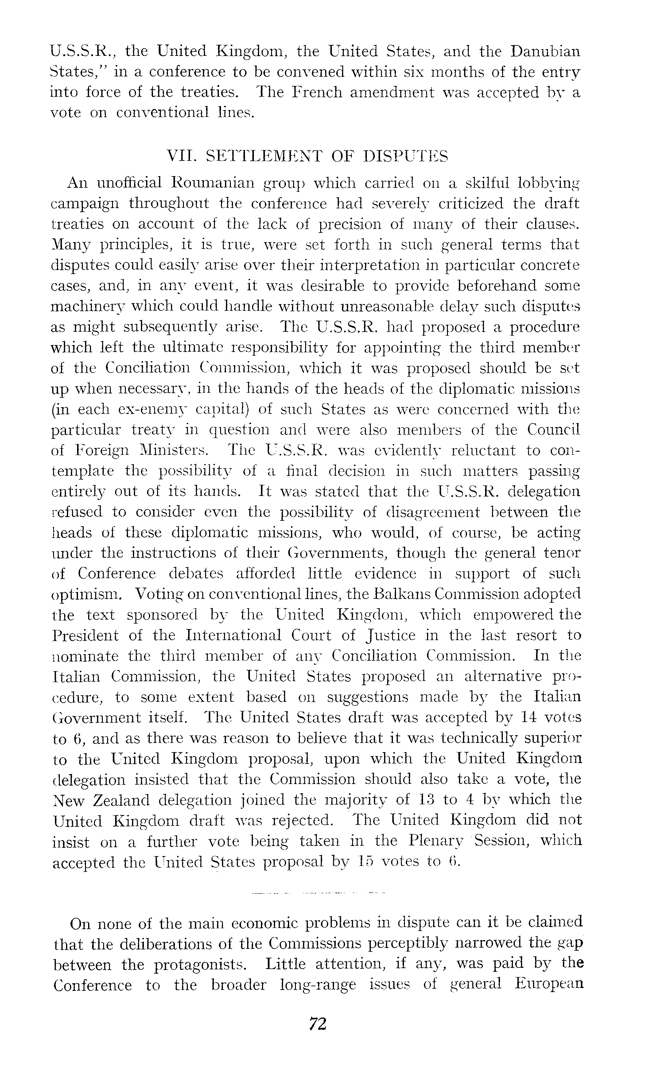 U.S.S.R., the United Kingdom, the United States, and the Danubian States," in a conference to be convened within six months of the entry into force of the treaties. The French amendment was accepted by a vote on conventional lines. VII. SETTLEMENT OF DISPUTES An unofficial Roumanian group which carried on a skilful lobbying campaign throughout the conference had severely criticized the draft treaties on account of the lack of precision of many of their clauses. Many principles, it is true, were set forth in such general terms that disputes could easily arise over their interpretation in particular concrete cases, and, in any event, it was desirable to provide beforehand some machinery which could handle without unreasonable delay such disputes as might subsequently arise. The U.S.S.R. had proposed a procedure which left the ultimate responsibility for appointing the third member of the Conciliation Commission, which it was proposed should be set up when necessary, in the hands of the heads of the diplomatic missions (in each ex-enemy capital) of such States as were concerned with the particular treaty in question and were also members of the Council of Foreign Ministers. The U.S.S.R. was evidently reluctant to contemplate the possibility of a final decision in such matters passing entirely out of its hands. It was stated that the U.S.S.R. delegation refused to consider even the possibility of disagreement between the heads of these diplomatic missions, who would, of course, be acting under the instructions of their Governments, though the general tenor of Conference debates afforded little evidence in support of such optimism. Voting on conventional lines, the Balkans Commission adopted the text sponsored by the United Kingdom, which empowered the President of the International Court of Justice in the last resort to nominate the third member of any Conciliation Commission. In the Italian Commission, the United States proposed an alternative procedure, to some extent based on suggestions made by the Italian Government itself. The United States draft was accepted by 14 votes to 6, and as there was reason to believe that it was technically superior to the United Kingdom proposal, upon which the United Kingdom delegation insisted that the Commission should also take a vote, the New Zealand delegation joined the majority of 13 to 4 by which the United Kingdom draft was rejected. The United Kingdom did not insist on a further vote being taken in the Plenary Session, which accepted the United States proposal by 15 votes to 6. On none of the main economic problems in dispute can it be claimed that the deliberations of the Commissions perceptibly narrowed the gap between the protagonists. Little attention, if any, was paid by the Conference to the broader long-range issues of general European