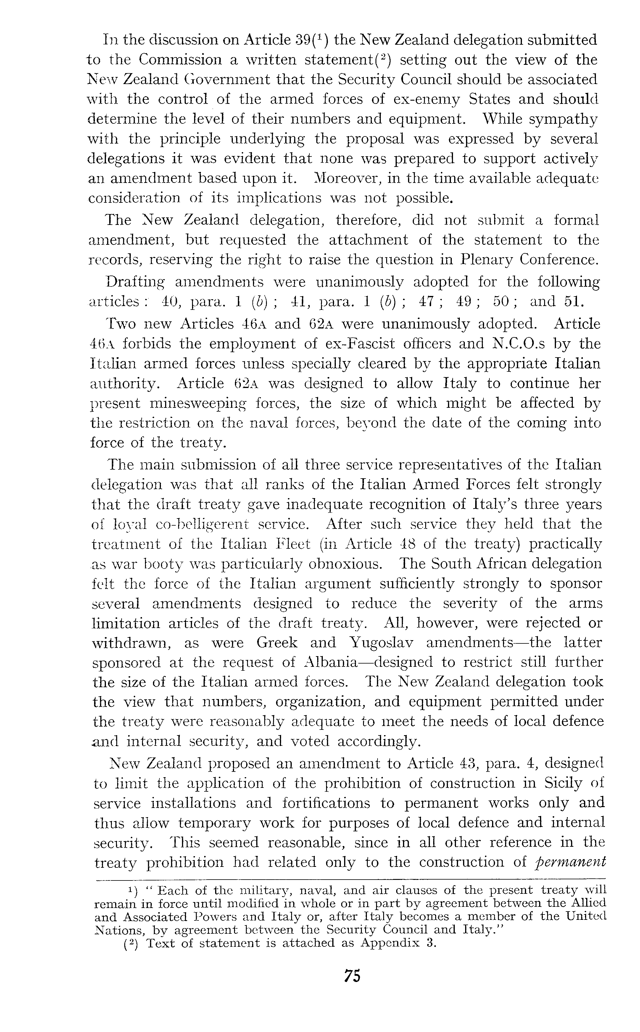 In the discussion on Article 39 (*) the New Zealand delegation submitted to the Commission a written statement( 2 ) setting out the view of the New Zealand Government that the Security Council should be associated with the control of the armed forces of ex-enemy States and should determine the level of their numbers and equipment. While sympathy with the principle underlying the proposal was expressed by several delegations it was evident that none was prepared to support actively an amendment based upon it. Moreover, in the time available adequate consideration of its implications was not possible. The New Zealand delegation, therefore, did not submit a formal amendment, but requested the attachment of the statement to the records, reserving the right to raise the question in Plenary Conference. Drafting amendments were unanimously adopted for the following articles : 40, para. 1 (b) ; 41, para. 1 (b) ; 47 ; 49 ; 50 ; and 51. Two new Articles 46a and 62a were unanimously adopted. Article 46a forbids the employment of ex-Fascist officers and N.C.O.s by the Italian armed forces unless specially cleared by the appropriate Italian authority. Article 62a was designed to allow Italy to continue her present minesweeping forces, the size of which might be affected by the restriction on the naval forces, beyond the date of the coming into force of the treaty. The main submission of all three service representatives of the Italian delegation was that all ranks of the Italian Armed Forces felt strongly that the draft treaty gave inadequate recognition of Italy's three years of loyal co-belligerent service. After such service they held that the treatment of the Italian Fleet (in Article 48 of the treaty) practically .as war booty was particularly obnoxious. The South African delegation felt the force of the Italian argument sufficiently strongly to sponsor several amendments designed to reduce the severity of the arms limitation articles of the draft treaty. All, however, were rejected or withdrawn, as were Greek and Yugoslav amendments—the latter sponsored at the request of Albania —designed to restrict still further the size of the Italian armed forces. The New Zealand delegation took the view that numbers, organization, and equipment permitted under the treaty were reasonably adequate to meet the needs of local defence and internal security, and voted accordingly. New Zealand proposed an amendment to Article 43, para. 4, designed to limit the application of the prohibition of construction in Sicily of service installations and fortifications to permanent works only and thus allow temporary work for purposes of local defence and internal security. This seemed reasonable, since in all other reference in the treaty prohibition had related only to the construction of permanent