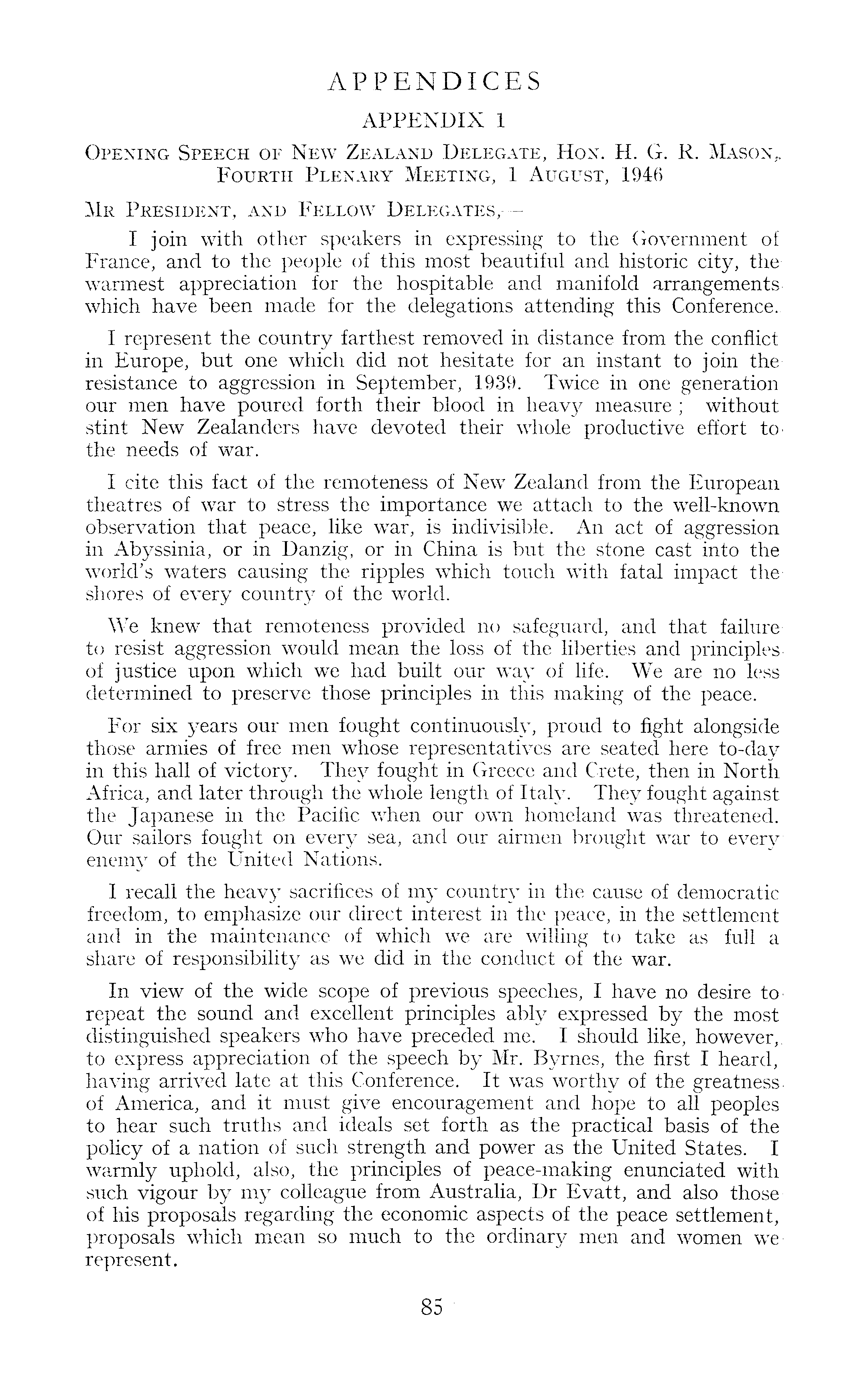 APPENDICES APPENDIX 1 Opening Speech of New Zealand Delegate, Hon. H. G. R. Mason, Fourth Plenary Meeting, 1 August, 1946 Mr President, and Fellow Delegates,— I join with other speakers in expressing to the Government of France, and to the people of this most beautiful and historic city, thewarmest appreciation for the hospitable and manifold arrangements which have been made for the delegations attending this Conference.. I represent the country farthest removed in distance from the conflict in Europe, but one which did not hesitate for an instant to join the resistance to aggression in September, 1939. Twice in one generation our men have poured forth their blood in heavy measure ; without stint New Zealanders have devoted their whole productive effort tothe needs of war. I cite this fact of the remoteness of New Zealand from the European theatres of war to stress the importance we attach to the well-known observation that peace, like war, is indivisible. i\n act of aggression in Abyssinia, or in Danzig, or in China is but the stone cast into the world's waters causing the ripples which touch with fatal impact the shores of every country of the world. We knew that remoteness provided no safeguard, and that failureto resist aggression would mean the loss of the liberties and principles of justice upon which we had built our way of life. We are no less determined to preserve those principles in this making of the peace. For six years our men fought continuously, proud to fight alongside those armies of free men whose representatives are seated here to-day in this hall of victory. They fought in Greece and Crete, then in North Africa, and later through the whole length of Italy. They fought against the Japanese in the Pacific when our own homeland was threatened. Our sailors fought on every sea, and our airmen brought war to every enemy of the United Nations. I recall the heavy sacrifices of my country in the cause of democratic freedom, to emphasize our direct interest in the peace, in the settlement and in the maintenance of which we are willing to take as full a share of responsibility as we did in the conduct of the war. In view of the wide scope of previous speeches, I have no desire to repeat the sound and excellent principles ably expressed by the most distinguished speakers who have preceded me. I should like, however,, to express appreciation of the speech by Mr. Byrnes, the first I heard, having arrived late at this Conference. It was worthy of the greatness of America, and it must give encouragement and hope to all peoples to hear such truths and ideals set forth as the practical basis of the policy of a nation of such strength and power as the United States. I warmly uphold, also, the principles of peace-making enunciated with such vigour by my colleague from Australia, Dr Evatt, and also those of his proposals regarding the economic aspects of the peace settlement, proposals which mean so much to the ordinary men and women we represent.