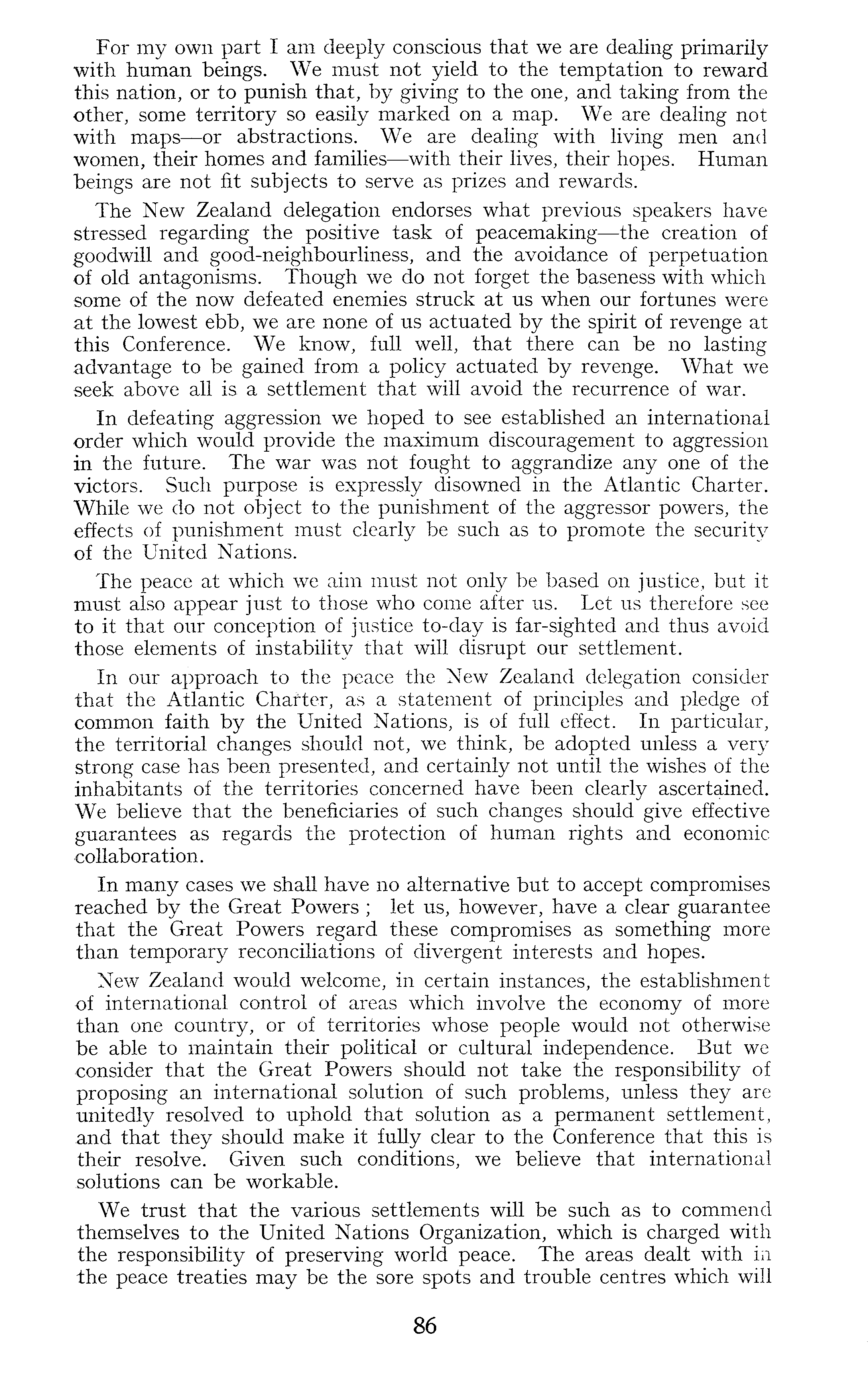 For my own part I am deeply conscious that we are dealing primarily with human beings. We must not yield to the temptation to reward this nation, or to punish that, by giving to the one, and taking from the other, some territory so easily marked on a map. We are dealing not with maps —or abstractions. We are dealing with living men and women, their homes and families —with their lives, their hopes. Human beings are not fit subjects to serve as prizes and rewards. The New Zealand delegation endorses what previous speakers have stressed regarding the positive task of peacemaking—the creation of goodwill and good-neighbourliness, and the avoidance of perpetuation of old antagonisms. Though we do not forget the baseness with which some of the now defeated enemies struck at us when our fortunes were at the lowest ebb, we are none of us actuated by the spirit of revenge at this Conference. We know, full well, that there can be no lasting advantage to be gained from a policy actuated by revenge. What we seek above all is a settlement that will avoid the recurrence of war. In defeating aggression we hoped to see established an international order which would provide the maximum discouragement to aggression in the future. The war was not fought to aggrandize any one of the victors. Such purpose is expressly disowned in the Atlantic Charter. While we do not object to the punishment of the aggressor powers, the effects of punishment must clearly be such as to promote the security of the United Nations. The peace at which we aim must not only be based on justice, but it must also appear just to those who come after us. Let us therefore see to it that our conception of justice to-day is far-sighted and thus avoid those elements of instability that will disrupt our settlement. In our approach to the peace the New Zealand delegation consider that the Atlantic Charter, as a statement of principles and pledge of common faith by the United Nations, is of full effect. In particular, the territorial changes should not, we think, be adopted unless a very strong case has been presented, and certainly not until the wishes of the inhabitants of the territories concerned have been clearly ascertained. We believe that the beneficiaries of such changes should give effective guarantees as regards the protection of human rights and economic collaboration. In many cases we shall have no alternative but to accept compromises reached by the Great Powers ; let us, however, have a clear guarantee that the Great Powers regard these compromises as something more than temporary reconciliations of divergent interests and hopes. New Zealand would welcome, in certain instances, the establishment of international control of areas which involve the economy of more than one country, or of territories whose people would not otherwise be able to maintain their political or cultural independence. But we consider that the Great Powers should not take the responsibility of proposing an international solution of such problems, unless they are unitedly resolved to uphold that solution as a permanent settlement, and that they should make it fully clear to the Conference that this is their resolve. Given such conditions, we believe that international solutions can be workable. We trust that the various settlements will be such as to commend themselves to the United Nations Organization, which is charged with the responsibility of preserving world peace. The areas dealt with in the peace treaties may be the sore spots and trouble centres which will