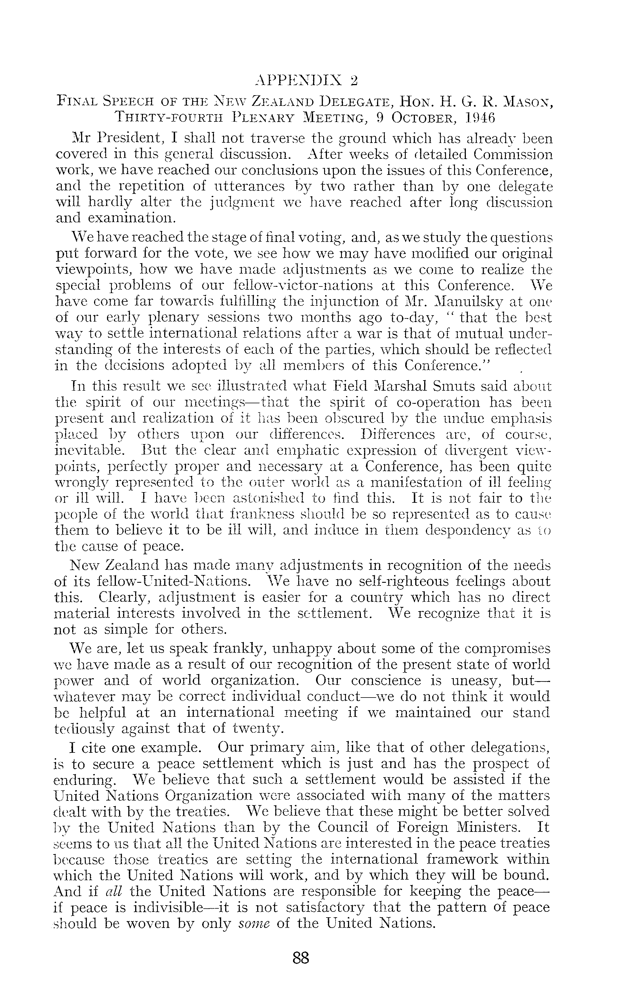 APPENDIX 2 Final Speech of the New Zealand Delegate, Hon. H. G. R. Mason, Thirty-fourth Plenary Meeting, 9 October, 1946 Mr President, I shall not traverse the ground which has already been covered in this general discussion. After weeks of detailed Commission work, we have reached our conclusions upon the issues of this Conference, and the repetition of utterances by two rather than by one delegate will hardly alter the judgment we have reached after long discussion and examination. We have reached the stage of final voting, and, as we study the questions put forward for the vote, we see how we may have modified our original viewpoints, how we have made adjustments as we come to realize the special problems of our fellow-victor-nations at this Conference. We have come far towards fulfilling the injunction of Mr. Manuilsky at one of our early plenary sessions two months ago to-day, " that the best way to settle international relations after a war is that of mutual understanding of the interests of each of the parties, which should be reflected in the decisions adopted by all members of this Conference." In this result we see illustrated what Field Marshal Smuts said about the spirit of our meetings —that the spirit of co-operation has been present and realization of it has been obscured by the undue emphasis placed by others upon our differences. Differences are, of course, inevitable. But the clear and emphatic expression of divergent viewpoints, perfectly proper and necessary at a Conference, has been quite wrongly represented to the outer world as a manifestation of ill feeling or ill will. I have been astonished to find this. It is not fair to the people of the world that frankness should be so represented as to cause them to believe it to be ill will, and induce in them despondency as to the cause of peace. New Zealand has made many adjustments in recognition of the needs of its fellow-United-Nations. We have no self-righteous feelings about this. Clearly, adjustment is easier for a country which has no direct material interests involved in the settlement. We recognize that it is not as simple for others. We are, let us speak frankly, unhappy about some of the compromises we have made as a result of our recognition of the present state of world power and of world organization. Our conscience is uneasy, but — whatever may be correct individual conduct —we do not think it would be helpful at an international meeting if we maintained our stand tediously against that of twenty. I cite one example. Our primary aim, like that of other delegations, is to secure a peace settlement which is just and has the prospect of enduring. We believe that such a settlement would be assisted if the United Nations Organization were associated with many of the matters •dealt with by the treaties. We believe that these might be better solved by the United Nations than by the Council of Foreign Ministers. It seems to us that all the United Nations are interested in the peace treaties because those treaties are setting the international framework within which the United Nations will work, and by which they will be bound. And if all the United Nations are responsible for keeping the peace — if peace is indivisible —it is not satisfactory that the pattern of peace should be woven by only some of the United Nations.