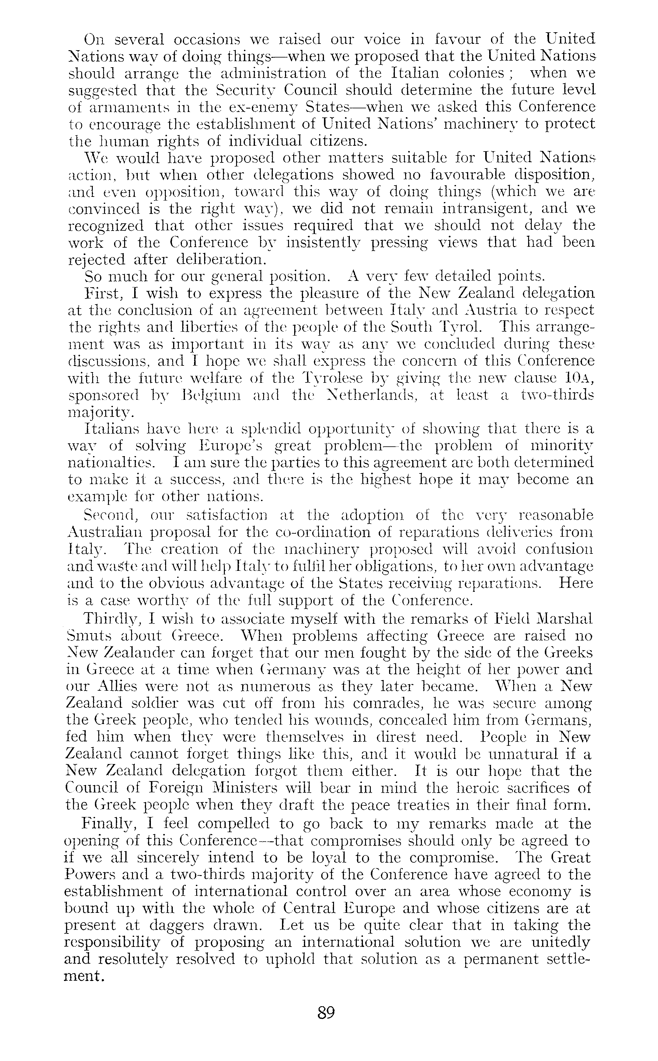 On several occasions we raised our voice in favour of the United Nations way of doing things —when we proposed that the United Nations should arrange the administration of the Italian colonies ; when we suggested that the Security Council should determine the future level of armaments in the ex-enemy States —when we asked this Conference to encourage the establishment of United Nations' machinery to protect the human rights of individual citizens. We would have proposed other matters suitable for United Nations action, but when other delegations showed no favourable disposition, and even opposition, toward this way of doing things (which we are convinced is the right way), we did not remain intransigent, and we recognized that other issues required that we should not delay the work of the Conference by insistently pressing views that had been rejected after deliberation. So much for our general position. A very few detailed points. First, I wish to express the pleasure of the New Zealand delegation at the conclusion of an agreement between Italy and Austria to respect the rights and liberties of the people of the South Tyrol. This arrangement was as important in its way as any we concluded during these discussions, and I hope we shall express the concern of this Conference with the future welfare of the Tyrolese by giving the new clause 10a, sponsored by Belgium and the Netherlands, at least a two-thirds majority. Italians have here a splendid opportunity of showing that there is a way of solving Europe's great problem—the problem of minority nationalties. lam sure the parties to this agreement are both determined to make it a success, and there is the highest hope it may become an example for other nations. Second, our satisfaction at the adoption of the very reasonable Australian proposal for the co-ordination of reparations deliveries from Italy. The creation of the machinery proposed will avoid confusion and waste and will help Italy to fulfil her obligations, to her own advantage and to the obvious advantage of the States receiving reparations. Here is a case worthy of the full support of the Conference. Thirdly, I wish to associate myself with the remarks of Field Marshal Smuts about Greece. When problems affecting Greece are raised no New Zealander can forget that our men fought by the side of the Greeks in Greece at a time when Germany was at the height of her power and our Allies were not as numerous as they later became. When a New Zealand soldier was cut off from his comrades, he was secure among the Greek people, who tended his wounds, concealed him from Germans, fed him when they were themselves in direst need. People in New Zealand cannot forget things like this, and it would be unnatural if a New Zealand delegation forgot them either. It is our hope that the Council of Foreign Ministers will bear in mind the heroic sacrifices of the Greek people when they draft the peace treaties in their final form. Finally, I feel compelled to go back to my remarks made at the opening of this Conference —that compromises should only be agreed to if we all sincerely intend to be loyal to the compromise. The Great Powers and a two-thirds majority of the Conference have agreed to the establishment of international control over an area whose economy is bound up with the whole of Central Europe and whose citizens are at present at daggers drawn. Let us be quite clear that in taking the responsibility of proposing an international solution we are unitedly and resolutely resolved to uphold that solution as a permanent settlement.