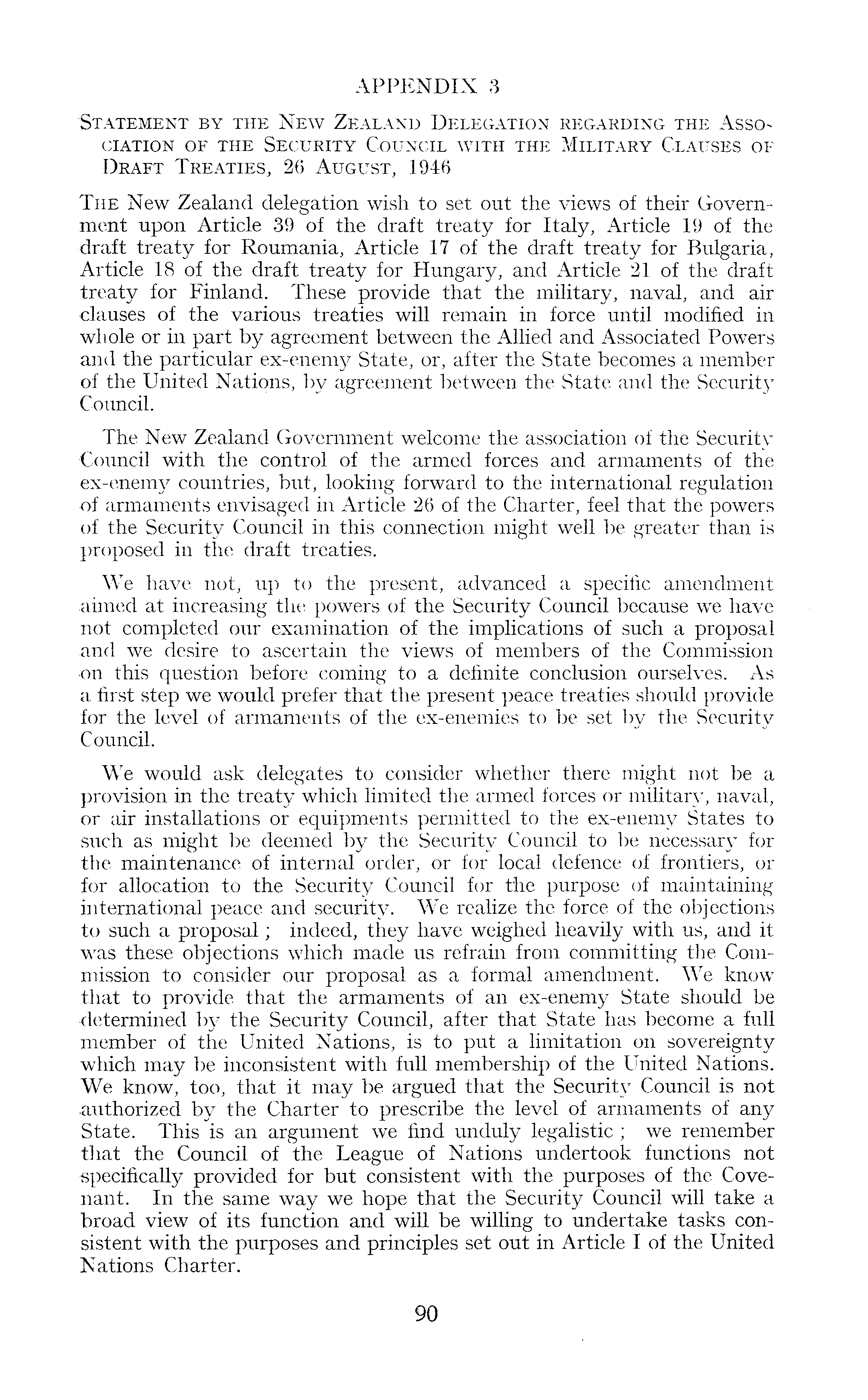 APPENDIX 3 Statement by the New Zealand Delegation regarding the Association of the Security Council with the Military Clauses of Draft Treaties, 26 August, 1946 The New Zealand delegation wish to set out the views of their Government upon Article 39 of the draft treaty for Italy, Article 19 of the draft treaty for Roumania, Article 17 of the draft treaty for Bulgaria, Article 18 of the draft treaty for Hungary, and Article 21 of the draft treaty for Finland. These provide that the military, naval, and air clauses of the various treaties will remain in force until modified in whole or in part by agreement between the Allied and Associated Powers and the particular ex-enemy State, or, after the State becomes a member of the United Nations, by agreement between the State and the Security Council. The New Zealand Government welcome the association of the Security Council with the control of the armed forces and armaments of the ex-enemy countries, but, looking forward to the international regulation of armaments envisaged in Article 26 of the Charter, feel that the powers of the Security Council in this connection might well be greater than is proposed in the draft treaties. We have not, up to the present, advanced a specific amendment aimed at increasing the powers of the Security Council because we have not completed our examination of the implications of such a proposal and we desire to ascertain the views of members of the Commission on this question before coming to a definite conclusion ourselves. As a first step we would prefer that the present peace treaties should provide for the level of armaments of the ex-enemies to be set by the Security Council. We would ask delegates to consider whether there might not be a provision in the treaty which limited the armed forces or military, naval, or air installations or equipments permitted to the ex-enemy States to such as might be deemed by the Security Council to be necessary for the maintenance of internal order, or for local defence of frontiers, or for allocation to the Security Council for the purpose of maintaining international peace and security. We realize the force of the objections to such a proposal; indeed, they have weighed heavily with us, and it was these objections which made us refrain from committing the Commission to consider our proposal as a formal amendment. We know that to provide that the armaments of an ex-enemy State should be determined by the Security Council, after that State has become a full member of the United Nations, is to put a limitation on sovereignty which may be inconsistent with full membership of the United Nations. We know, too, that it may be argued that the Security Council is not authorized by the Charter to prescribe the level of armaments of any State. This is an argument we find unduly legalistic ; we remember that the Council of the League of Nations undertook functions not specifically provided for but consistent with the purposes of the Covenant. In the same way we hope that the Security Council wiU take a broad view of its function and will be willing to undertake tasks consistent with the purposes and principles set out in Article I of the United Nations Charter.