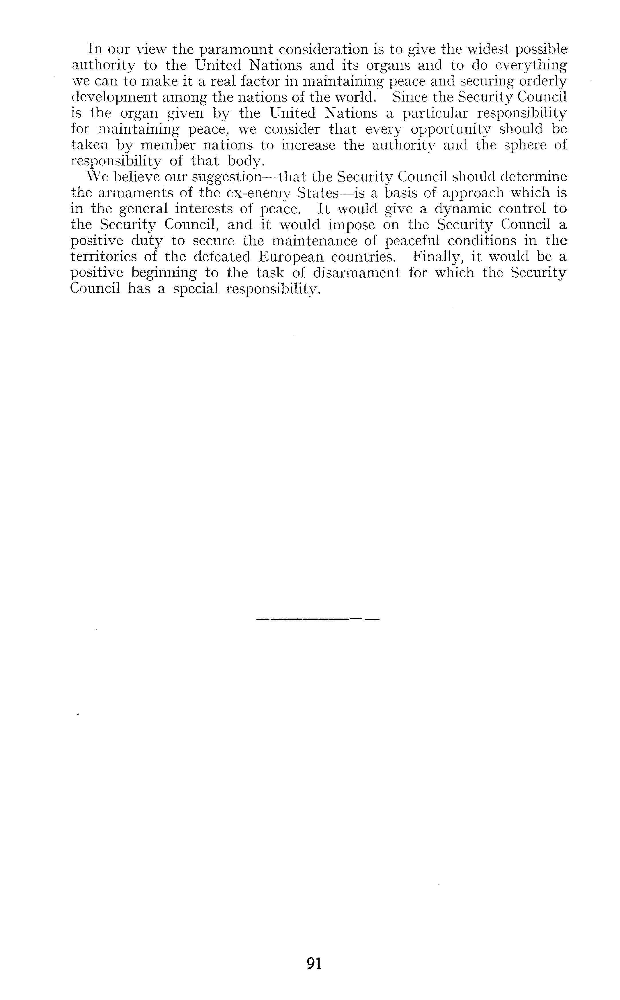 In our view the paramount consideration is to give the widest possible authority to the United Nations and its organs and to do everything we can to make it a real factor in maintaining peace and securing orderly development among the nations of the world. Since the Security Council is the organ given by the United Nations a particular responsibility for maintaining peace, we consider that every opportunity should be taken by member nations to increase the authority and the sphere of responsibility of that body. We believe our suggestion—that the Security Council should determine the armaments of the ex-enemy States —is a basis of approach which is in the general interests of peace. It would give a dynamic control to the Security Council, and it would impose on the Security Council a positive duty to secure the maintenance of peaceful conditions in the territories of the defeated European countries. Finally, it would be a positive beginning to the task of disarmament for which the Security Council has a special responsibility.