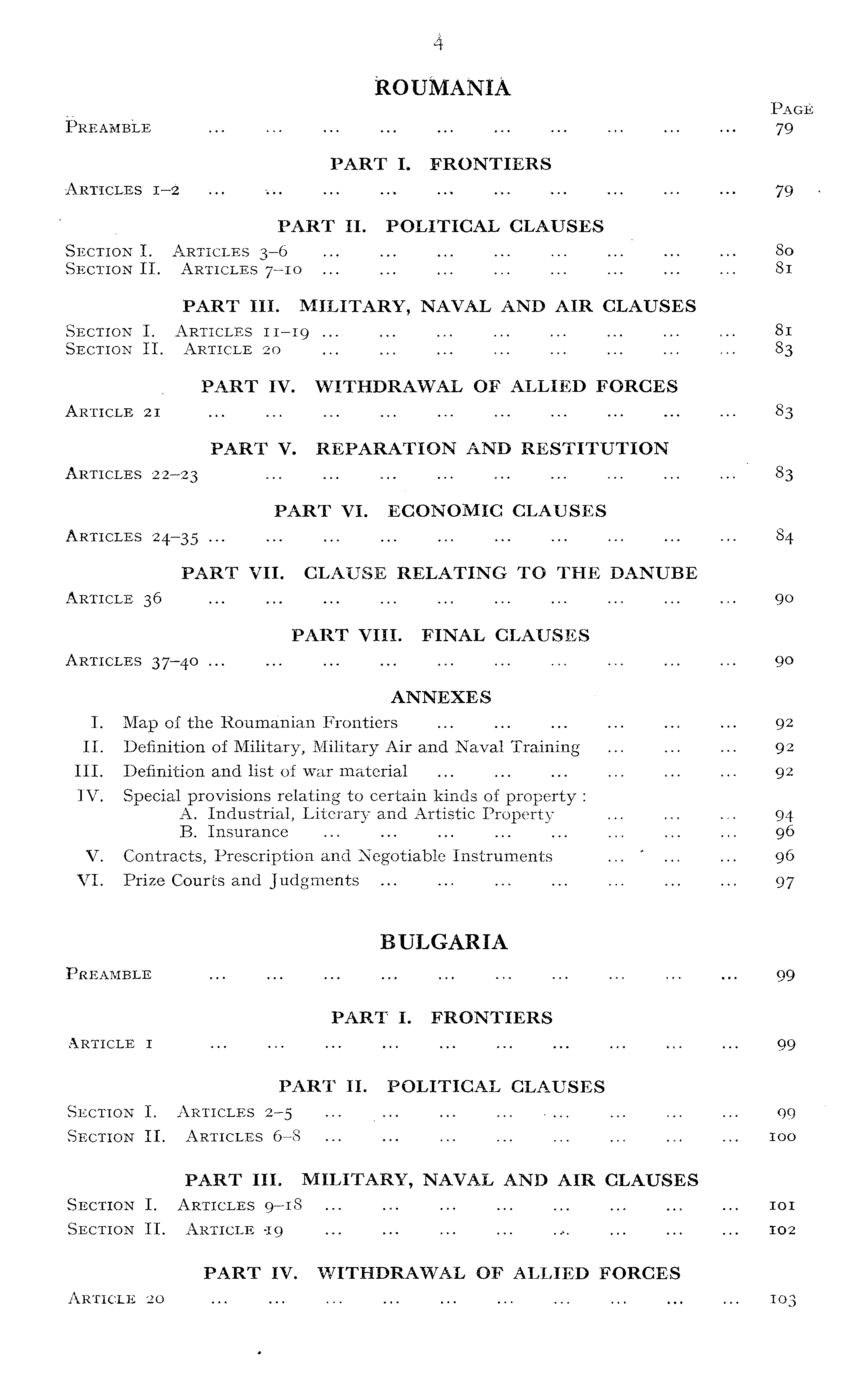 ROUMANIA Page Preamble 79 PART I, FRONTIERS Articles 1-2 ... ... ... ... ... ... ... ... ... ... 79 PART 11. POLITICAL GLAUSES Section I. Articles 3-6 ... ... ... ... ... ... ... ... 80 Section 11. Articles 7-10 ... ... ... ... ... ... ... ... 81 PART 111. MILITARY, NAVAL AND AIR GLAUSES Section I. Articles 11-19 ... ... ... ... ... ... ... ... 81 Section 11. Article 20 ... ... ... ... ... ... ... ... 83 PART IV. WITHDRAWAL OF ALLIED FORGES Article 21 ... ... ... ... ... ... ... ... ... ... 83 PART V. REPARATION AND RESTITUTION Articles 22-23 •■• ••• ••• •■• ••• ••• ••• ••• ••• &3 PART VI. ECONOMIC CLAUSES Articles 24-35 ... ... ... ... ... ... ... ... ... ... 84 PART VII. CLAUSE RELATING TO THE DANUBE Article 36 ... ... ... ... ... ... ... ... ... ... 90 PART VIII. FINAL CLAUSES Articles 37-40 ... ... ... ... ... ... ... ... ... ... 90 ANNEXES I. Map of the Roumanian Frontiers ... ... ... ... ... ... 92 11. Definition of Military, Military Air and Naval Training ... ... ... 92 111. Definition and list of war material ... ... ... ... ... ... 92 IV. Special provisions relating to certain kinds of property : A. Industrial, Literary and Artistic Property ... ... ... 94 B. Insurance ... ... ... ... ... ... ... ... 96 V. Contracts, Prescription and Negotiable Instruments ... * ... ... 96 Vl.' Prize Courts and Judgments ... ... ... ... ... ... ... 97 BULGARIA Preamble ... ... ... ... ... ... ... ... ... ... 99 PART I. FRONTIERS Article i ... ... ... ... ... ... ... ... ... ... 99 PART 11. POLITICAL CLAUSES Section I. Articles 2-5 ... ... ... ... • ... ... ... ... 99 Section 11. Articles 6-8 ... 100 PART 111. MILITARY, NAVAL AND AIR GLAUSES Section I. Articles 9-18 ... ... ... ... ... ... ... ... 101 Section 11. Article -19 ... ... ... ... ~. ... ... ... 102 PART IV. WITHDRAWAL OF ALLIED FORGES Article 20 ... ... ... ... ... ... ... ... ... ... 103