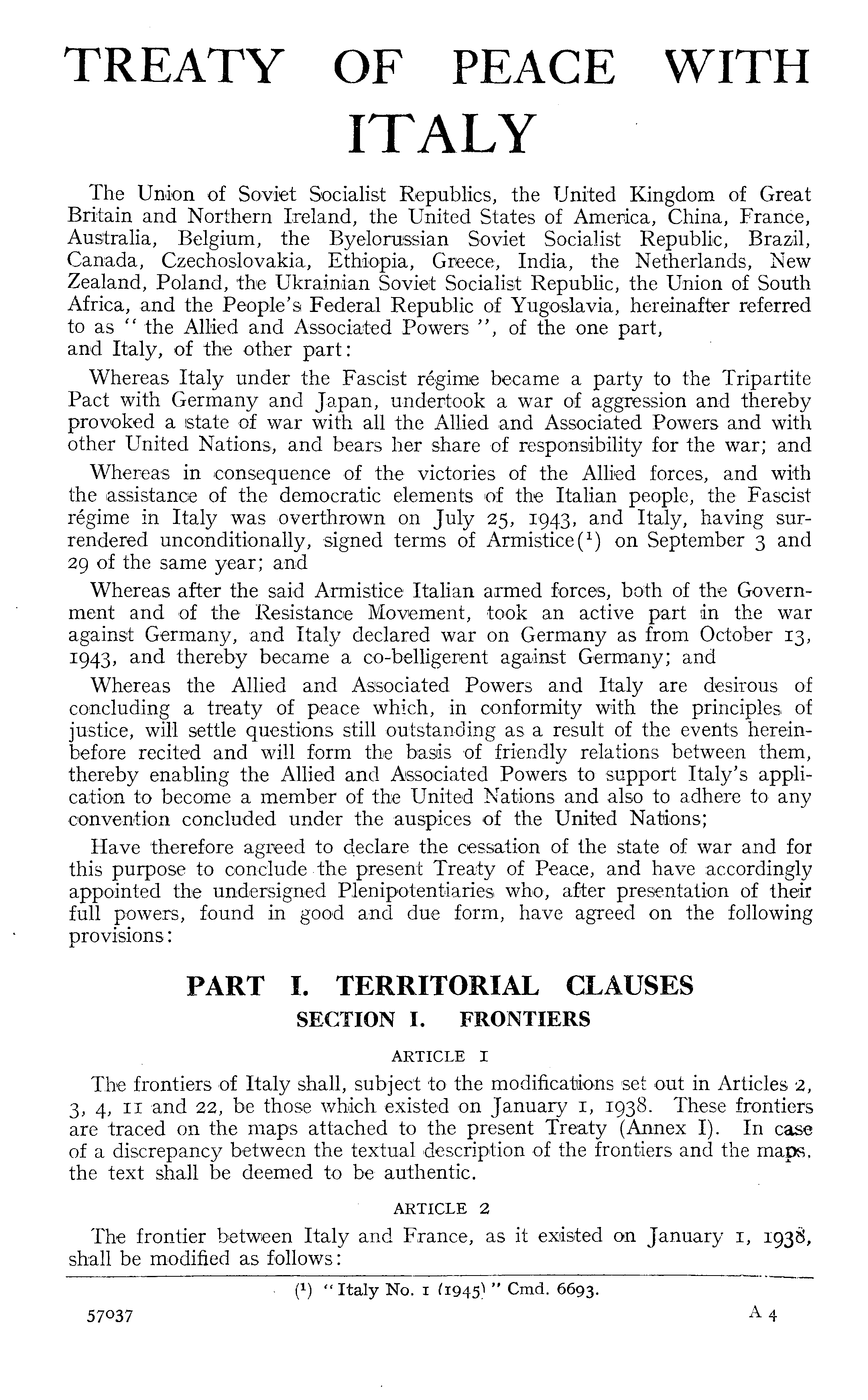 TREATY OF PEACE WITH ITALY The Union of Soviet Socialist Republics, the United Kingdom of Great Britain and Northern Ireland, the United States of America, China, France, Australia, Belgium, the Byelorussian Soviet Socialist Republic, Brazil, Canada, Czechoslovakia, Ethiopia, Greece, India, the Netherlands, New Zealand, Poland, the Ukrainian Soviet Socialist Republic, the Union of South Africa, and the People's Federal Republic of Yugoslavia, hereinafter referred to as " the Allied and Associated Powers ", of the one part, and Italy, of the other part: Whereas Italy under the Fascist regime became a party to the Tripartite Pact with Germany and Japan, undertook a war of aggression and thereby provoked a state of war with all the Allied and Associated Powers and with other United Nations, and bears her share of responsibility for the war; and Whereas in consequence of the victories of the Allied forces, and with the assistance of the democratic elements of the Italian people, the Fascist regime in Italy was overthrown on July 25, 1943, and Italy, having surrendered unconditionally, signed terms of Armistice( x ) on September 3 and 29 of the same year; and Whereas after the said Armistice Italian armed forces, both of the Government and of the Resistance Movement, took an active part in the war against Germany, and Italy declared war on Germany as from October 13, 1943, and thereby became a co-belligerent against Germany; and Whereas the Allied and Associated Powers and Italy are desirous of concluding a treaty of peace which, in conformity with the principles of justice, will settle questions still outstanding as a result of the events hereinbefore recited and will form the basis of friendly relations between them, thereby enabling the Allied and Associated Powers to' support Italy's application to become a member of the United Nations and also to adhere to any convention concluded under the auspices of the United Nations; Have therefore agreed to declare the cessation of the state of war and for this purpose to conclude the present Treaty of Peace, and have accordingly appointed the undersigned Plenipotentiaries who, after presentation of their full powers, found in good and due form, have agreed on the following provisions: PART I. TERRITORIAL CLAUSES SECTION I. FRONTIERS ARTICLE I The frontiers of Italy shall, subject to the modifications set out in Articles 2, 3, 4, 11 and 22, be those which existed on January 1, 1938. These frontiers are traced on the maps attached to the present Treaty (Annex I). In case of a discrepancy between the textual description of the frontiers and the maps, the text shall be deemed to be authentic. ARTICLE 2 The frontier between Italy and France, as it existed on January 1, 1938, shall be modified as follows: