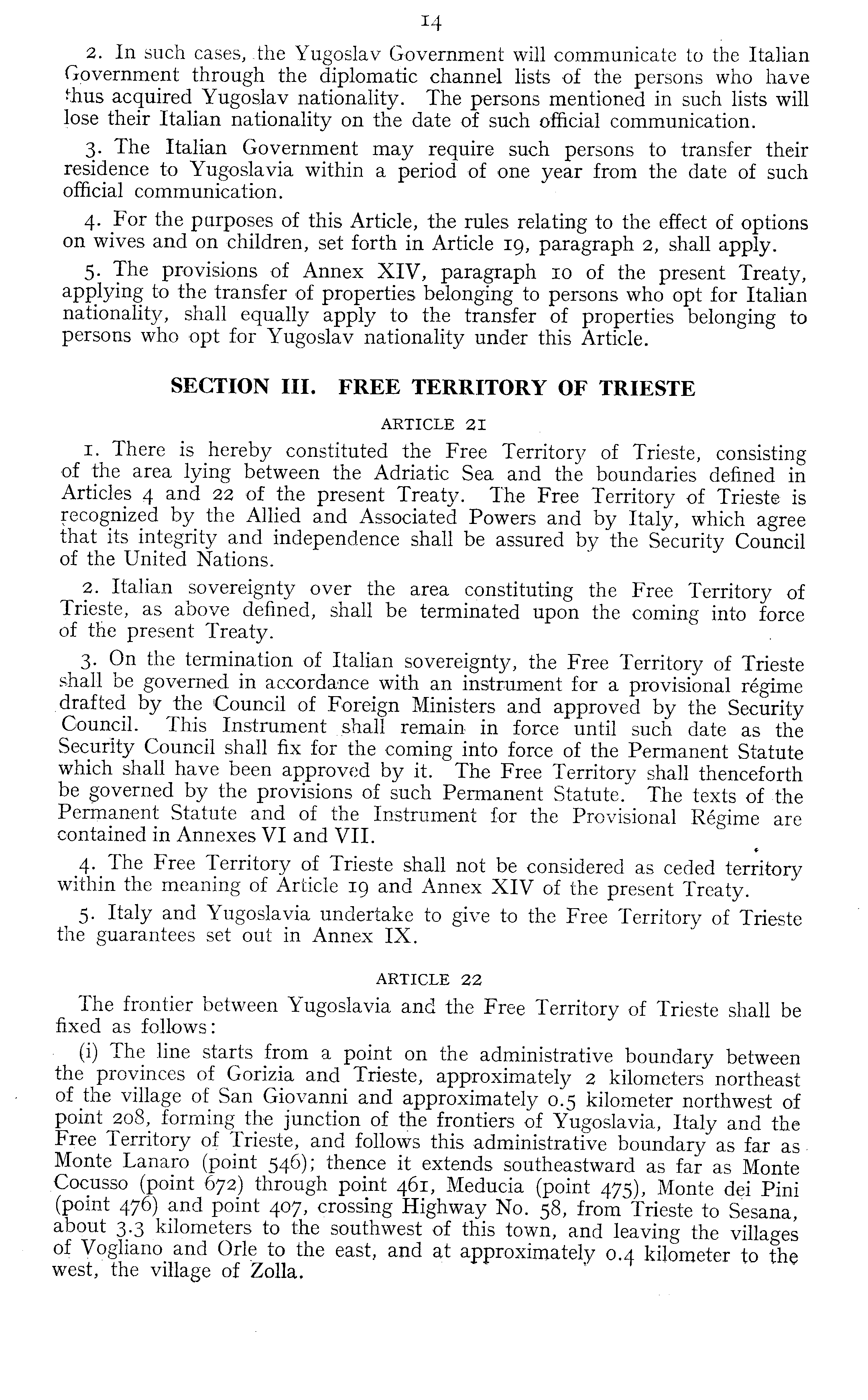 2. In such cases, .the Yugoslav Government will communicate to the Italian Government through the diplomatic channel lists of the persons who have thus acquired Yugoslav nationality. The persons mentioned in such lists will lose their Italian nationality on the date of such official communication. 3. The Italian Government may require such persons to transfer their residence to Yugoslavia within a period of one year from the date of such official communication. 4. For the purposes of this Article, the rules relating to the effect of options on wives and on children, set forth in Article 19, paragraph 2, shall apply. 5. The provisions of Annex XIV, paragraph 10 of the present Treaty, applying to the transfer of properties belonging to persons who opt for Italian nationality, shall equally apply to the transfer of properties belonging to persons who opt for Yugoslav nationality under this Article. SECTION 111. FREE TERRITORY OF TRIESTE ARTICLE 21 1. There is hereby constituted the Free Territory of Trieste, consisting of the area lying between the Adriatic Sea and the boundaries defined in Articles 4 and 22 of the present Treaty. The Free Territory of Trieste is recognized by the Allied and Associated Powers and by Italy, which agree that its integrity and independence shall be assured by the Security Council of the United Nations. 2. Italian sovereignty over the area constituting the Free Territory of Trieste, as above defined, shall be terminated upon the coming into force of the present Treaty. 3. On the termination of Italian sovereignty, the Free Territory of Trieste shall be governed in accordance with an instrument for a provisional regime drafted by the Council of Foreign Ministers and approved by the Security Council. This Instrument shall remain in force until such date as the Security Council shall fix for the coming into force of the Permanent Statute which shall have been approved by it. The Free Territory shall thenceforth be governed by the provisions of such Permanent Statute. The texts of the Permanent Statute and of the Instrument for the Provisional Regime are contained in Annexes VI and VII. 4. The Free Territory of Trieste shall not be considered as ceded territory within the meaning of Article 19 and Annex XIV of the present Treaty. 5. Italy and Yugoslavia undertake to give to the Free Territory of Trieste the guarantees set out in Annex IX. ARTICLE 22 The frontier between Yugoslavia and the Free Territory of Trieste shall be fixed as follows: (i) The line starts from a point on the administrative boundary between the provinces of Gorizia and Trieste, approximately 2 kilometers northeast of the village of San Giovanni and approximately 0.5 kilometer northwest of point 208, forming the junction of the frontiers of Yugoslavia, Italy and the Free Territory of Trieste, and follows this administrative boundary as far as Monte Lanaro (point 546); thence it extends southeastward as far as Monte Cocusso (point 672) through point 461, Meducia (point 475), Monte dei Pini (point 476) and point 407, crossing Highway No. 58, from Trieste to Sesana, about 3.3 kilometers to the southwest of this town, and leaving the villages of Vogliano and Orle to the east, and at approximately 0.4 kilometer to the west, the village of Zolla.