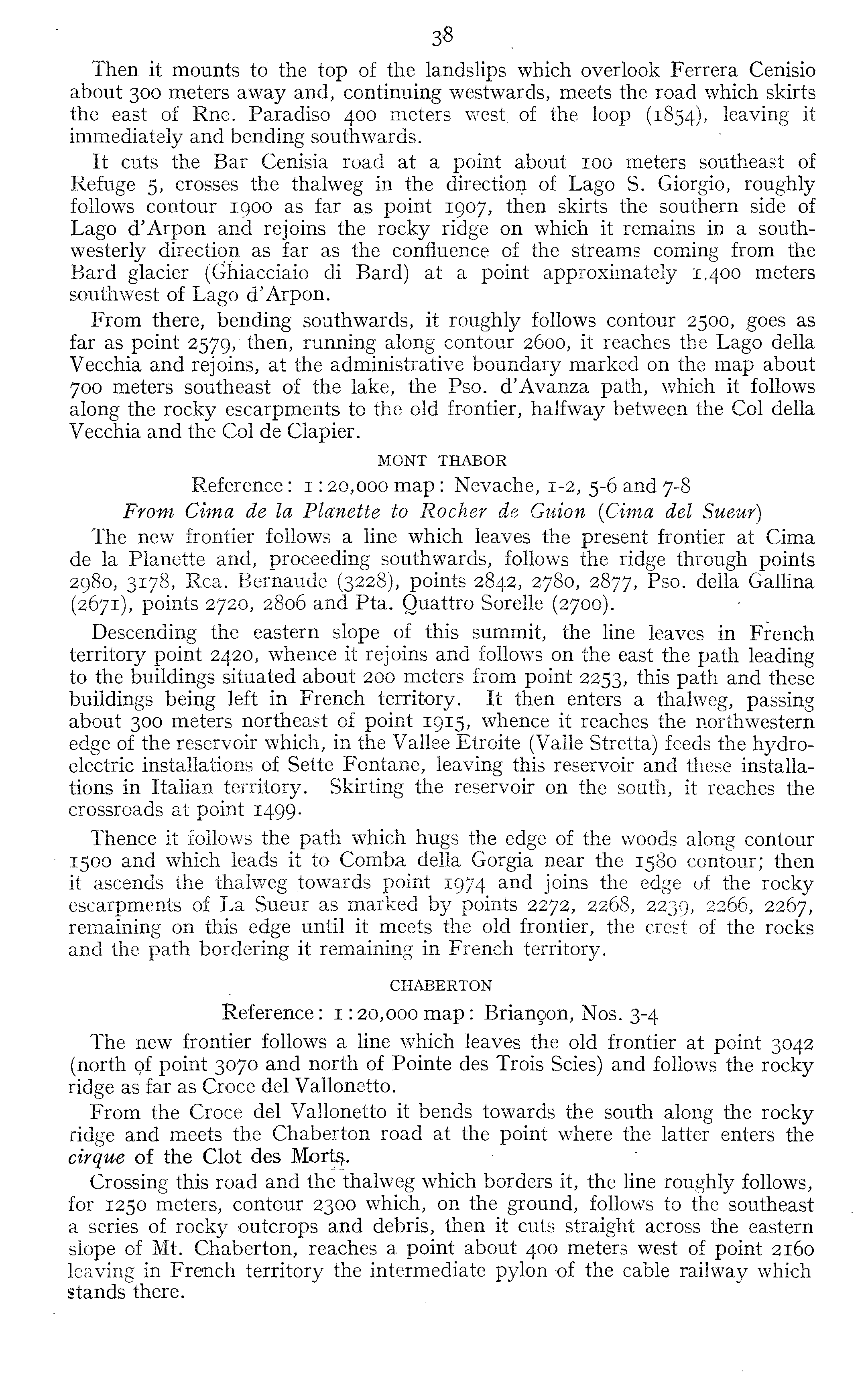 Then it mounts to' the top of the landslips which overlook Ferrera Cenisio about 300 meters away and, continuing westwards, meets the road which skirts the east of Rne. Paradiso 400 meters west, of the loop (1854), leaving it immediately and bending southwards. It cuts the Bar Cenisia road at a point about 100 meters southeast of Refuge 5, crosses the thalweg in the direction of Lago S. Giorgio, roughly follows contour 1900 as far as point 1907, then skirts the southern side of Lago d'Arpon and rejoins the rocky ridge on which it remains in a southwesterly direction as far as the confluence of the streams coming from the Bard glacier (Gliiacciaio di Bard) at a point approximately 1,400 meters southwest of Lago d'Arpon. From there, bending southwards, it roughly follows contour 2500, goes as far as point 2579/ then, running along contour 2600, it reaches the Lago della Vecchia and rejoins, at the administrative boundary marked on the map about 700 meters southeast of the lake, the Pso. d'Avanza path, which it follows along the rocky escarpments to the old frontier, halfway between the Col della Vecchia and the Col de Clapier. MONT THABOR Reference: 1:20,000 map: Nevache, 1-2, 5-6 and 7-8 Front Cima de la Pianette to Rocher de Guion (Cima del Sueur) The new frontier follows a line which leaves the present frontier at Cima de la Pianette and, proceeding southwards, follows the ridge through points 2980, 3178, Rca. Bernaude (3228), points 2842, 2780, 2877, Pso. della Gallina (2671), points 2720, 2806 and Pta. Quattro Sorelle (2700). Descending the eastern slope of this summit, the line leaves in French territory point 2420, whence it rejoins and follows on the east the path leading to the buildings situated about 200 meters from point 2253, this path and these buildings being left in French territory. It then enters a thalweg, passing about 300 meters northeast of point 1915, whence it reaches the northwestern edge of the reservoir which, in the Vallee Etroite (Valle Stretta) feeds the hydroelectric installations of Sette Fontane, leaving this reservoir and these installations in Italian territory. Skirting the reservoir on the south, it reaches the crossroads at point 1499. Thence it follows the path which hugs the edge of the woods along contour 1500 and which leads it to Comba della Gorgia near the 1580 contour; then it ascends the thalweg towards point 1974 and joins the edge of the rocky escarpments of La Sueur as marked by points 2272, 2268, 2239, 2266, 2267, remaining on this edge until it meets the old frontier, the crest of the rocks and the path bordering it remaining in French territory. CHABERTON Reference: 1:20,000 map: Brianoon, Nos. 3-4 The new frontier follows a line which leaves the old frontier at point 3042 (north oJF point 3070 and north of Pointe des Trois Scies) and follows the rocky ridge as.iar as Croce del Vallonetto. From the Croce del Vallonetto it bends towards the south along the rocky ridge and meets the Chaberton road at the point where the latter enters the cirque of the Clot des Mort|, Crossing this road and the thalweg which borders it, the line roughly follows, for 1250 meters, contour 2300 which, on the ground, follows to the southeast a series of rocky outcrops and debris, then it cuts straight across the eastern slope of Mt. Chaberton, reaches a point about 400 meters west of point 2160 leaving in French territory the intermediate pylon of the cable railway which stands there.
