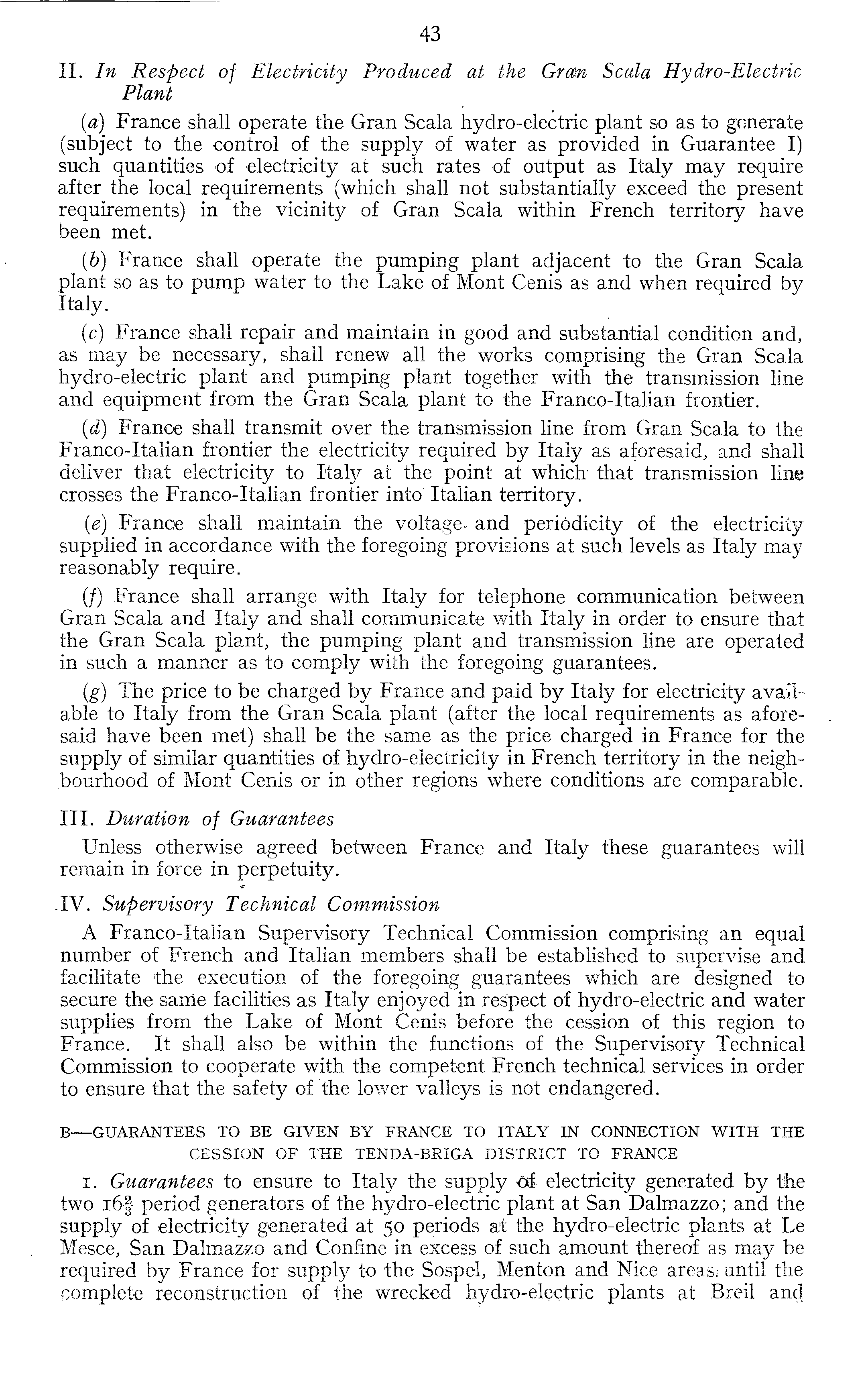 11. In Respect of Electricity Produced at the Gran Scala Hydro-Electric Plant {a) France shall operate the Gran Scala hydro-electric plant so as to generate (subject to the control of the supply of water as provided in Guarantee I) such quantities of electricity at such rates of output as Italy may require after the local requirements (which shall not substantially exceed the present requirements) in the vicinity of Gran Scala within French territory have been met. (b) France shall operate the pumping plant adjacent to the Gran Scala plant so as to pump water to the Lake of Mont Cenis as and when required by Italy. (c) France shall repair and maintain in good and substantial condition and, as may be necessary, shall renew all the works comprising the Gran Scala hydro-electric plant and pumping plant together with the transmission line and equipment from the Gran Scala plant to the Franco-Italian frontier. (d) France shall transmit over the transmission line from Gran Scala to the Franco-Italian frontier the electricity required by Italy as aforesaid, and shall deliver that electricity to Italy at the point at which - that transmission line crosses the Franco-Italian frontier into Italian territory. (e) France shall maintain the voltage- and periodicity of the electricity supplied in accordance with the foregoing provisions at such levels as Italy may reasonably require. (/) France shall arrange with Italy for telephone communication between Gran Scala and Italy and shall communicate with Italy in order to ensure that the Gran Scala plant, the pumping plant and transmission line are operated in such a manner as to comply with the foregoing guarantees. (g) The price to be charged by France and paid by Italy for electricity available to Italy from the Gran Scala plant (after the local requirements as aforesaid have been met) shall be the same as the price charged in France for the supply of similar quantities of hydro-electricity in French territory in the neighbourhood of Mont Cenis or in other regions where conditions are comparable. 111. Duration of Guarantees Unless otherwise agreed between France and Italy these guarantees will remain in force in perpetuity. .IV. Supervisory Technical Commission A Franco-Italian Supervisory Technical Commission comprising an equal number of French and Italian members shall be established to supervise and facilitate the execution of the foregoing guarantees which are designed to secure the sarrie facilities as Italy enjoyed in respect of hydro-electric and water supplies from the Lake of Mont Cenis before the cession of this region to France. It shall also be within the functions of the Supervisory Technical Commission to cooperate with the competent French technical services in order to ensure that the safety of the lower valleys is not endangered. B —GUARANTEES TO BE GIVEN BY FRANCE TO ITALY IN CONNECTION WITH THE CESSION OF THE TENDA-BRIGA DISTRICT TO FRANCE i. Guarantees to ensure to Italy the supply s£g electricity generated by the two i6-| period generators of the hydro-electric plant at San Dalmazzo; and the supply of electricity generated at 50 periods at the hydro-electric plants at Le Mesce, San Dalmazzo and Confine in excess of such amount thereof as may be required by France for supply to the Sospel, Menton and Nice areasf until the complete reconstruction of the wrecked hydro-electric plants at IBreil and
