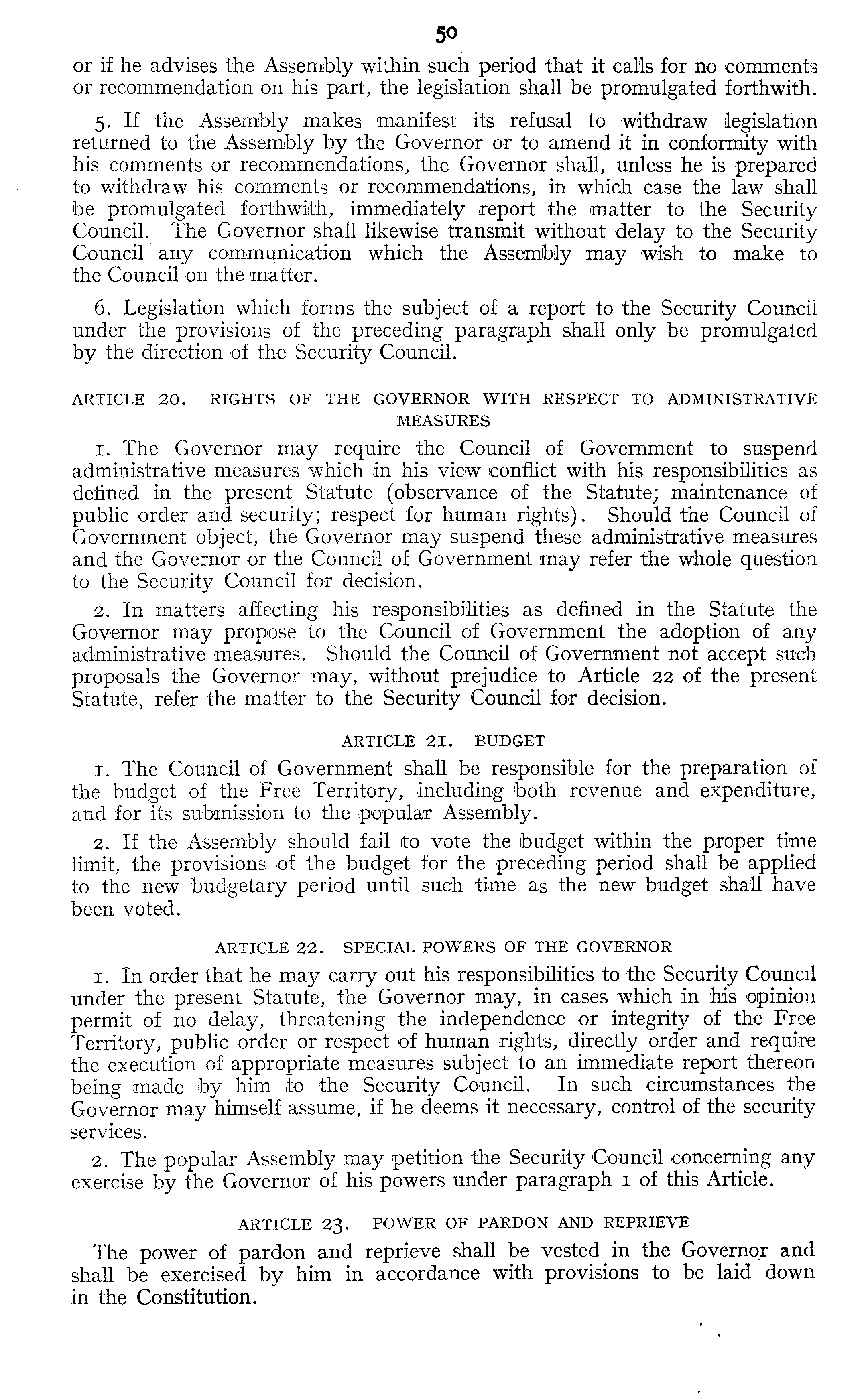 or if he advises the Assembly within such period that it calls for no comments or recommendation on his part, the legislation shall be promulgated forthwith. 5. If the Assembly makes manifest its refusal to withdraw legislation returned to the Assembly by the Governor or to amend it in conformity with his comments or recommendations, the Governor shall, unless he is prepared to withdraw his comments or recommendations, in which case the law shall be promulgated forthwith, immediately report the matter to the Security Council. The Governor shall likewise transmit without delay to the Security Council any communication which the Assembly may wish to make to the Council on the matter. 6. Legislation which forms the subject of a report to the Security Council under the provisions of the preceding paragraph shall only be promulgated by the direction of the Security Council. ARTICLE 20. RIGHTS OF THE GOVERNOR WITH RESPECT TO ADMINISTRATIVE MEASURES 1. The Governor may require the Council of Government to suspend administrative measures which in his view conflict with his responsibilities as defined in the present Statute (observance of the Statute; maintenance of public order and security; respect for human rights). Should the Council of Government object, the Governor may suspend these administrative measures and the Governor or the Council of Government may refer the whole question to the Security Council for decision. 2. In matters affecting his responsibilities as defined in the Statute the Governor may propose to the Council of Government the adoption of any administrative measures. Should the Council of Government not accept such proposals the Governor may, without prejudice to Article 22 of the present Statute, refer the matter to the Security Council for decision. ARTICLE 21. BUDGET i. The Council of Government shall be responsible for the preparation of the budget of the Free Territory, including both revenue and expenditure, and for its submission to the popular Assembly. 2. If the Assembly should fail to vote the ibudget within the proper time limit, the provisions of the budget for the preceding period shall be applied to the new budgetary period until such time as the new budget shall have been voted. ARTICLE 22. SPECIAL POWERS OF THE GOVERNOR i. In order that he may carry out his responsibilities to the Security Council under the present Statute, the Governor may, in cases which in his opinion permit of no delay, threatening the independence or integrity of the Free Territory, public order or respect of human rights, directly order and require the execution of appropriate measures subject to an immediate report thereon being made by him to the Security Council. In such circumstances the Governor may himself assume, if he deems it necessary, control of the security services. 2. The popular Assembly may petition the Security Council concerning any exercise by the Governor of his powers under paragraph 1 of this Article. ARTICLE 23. POWER OF PARDON AND REPRIEVE The power of pardon and reprieve shall be vested in the Governor and shall be exercised by him in accordance with provisions to be laid down in the Constitution.