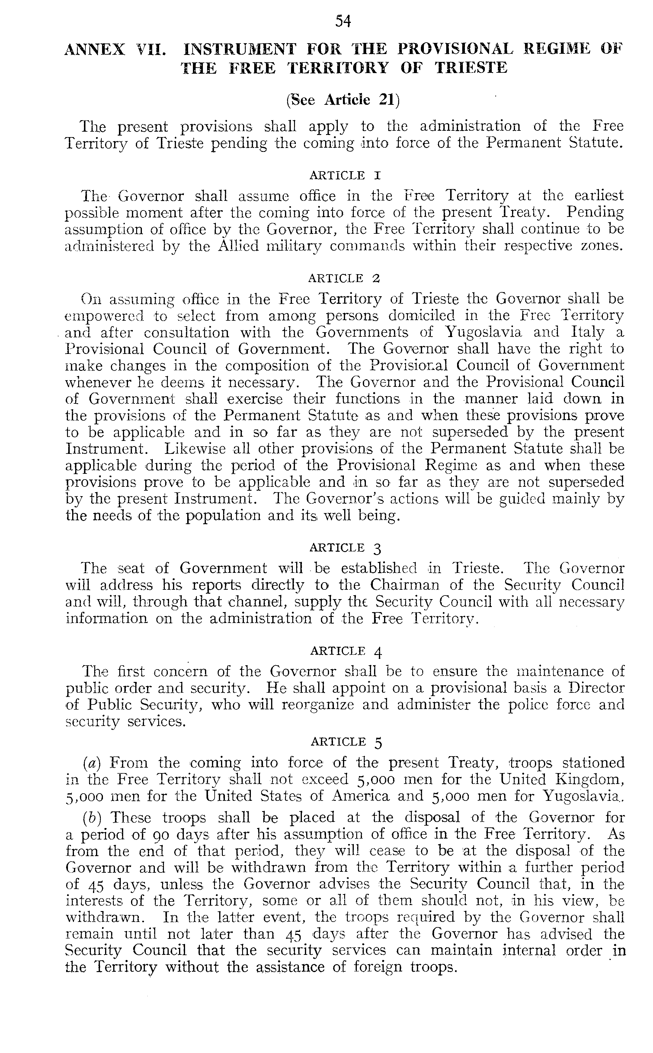 ANNEX VII. INSTRUMENT FOR THE PROVISIONAL REGIME OF THE FREE TERRITORY OF TRIESTE (See Article 21) The present provisions shall apply to the administration of the Free Territory of Trieste pending the coming into force of the Permanent Statute. ARTICLE I The Governor shall assume office in the Free Territory at the earliest possible moment after the coming into force of the present Treaty. Pending assumption of office by the Governor, the Free Territory shall continue to be administered by the Allied military commands within their respective zones. ARTICLE 2 On assuming office in the Free Territory of Trieste the Governor shall be empowered to select from among persons domiciled in the Free Territory and after consultation with the Governments of Yugoslavia and Italy a Provisional Gouncil of Government. The Governor shall have the right to make changes in the composition of the Provisional Council of Government whenever he deems it necessary. The Governor and the Provisional Council of Government shall exercise their functions in the manner laid down in the provisions of the Permanent Statute as and when these provisions prove to be applicable and in so far as they are not superseded by the present Instrument. Likewise all other provisions of the Permanent Statute shall be applicable during the period of the Provisional Regime as and when these provisions prove to be applicable and in so far as they are not superseded by the present Instrument. The Governor's actions will be guided mainly by the needs of the population and its well being. ARTICLE 3 The seat of Government will be established in Trieste. The Governor will address his reports directly to the Chairman of the Security Council and will, through that channel, supply the Security Council with all necessary information on the administration of the Free Territory. ARTICLE 4 The first concern of the Governor shall be to ensure the maintenance of public order and security. He shall appoint on a provisional basis a Director of Public Security, who will reorganize and administer the police force and security services. ARTICLE 5 (a) From the coming into force of the present Treaty, troops stationed in the Free Territory shall not exceed 5,000 men for the United Kingdom, 5,000 men for the United States of America and 5,000 men for Yugoslavia., (b) These troops shall be placed at the disposal of the Governor for a period of 90 days after his assumption of office in the Free Territory. As from the end of that period, they will cease to be at the disposal of the Governor and will be withdrawn from the Territory within a further period of 45 days, unless the Governor advises the Security Council that, in the interests of the Territory, some or all of them should not, in his view, be withdrawn. In the latter event, the troops required by the Governor shall remain until not later than 45 days after the Governor has advised the Security Council that the security services can maintain internal order in the Territory without the assistance of foreign troops.