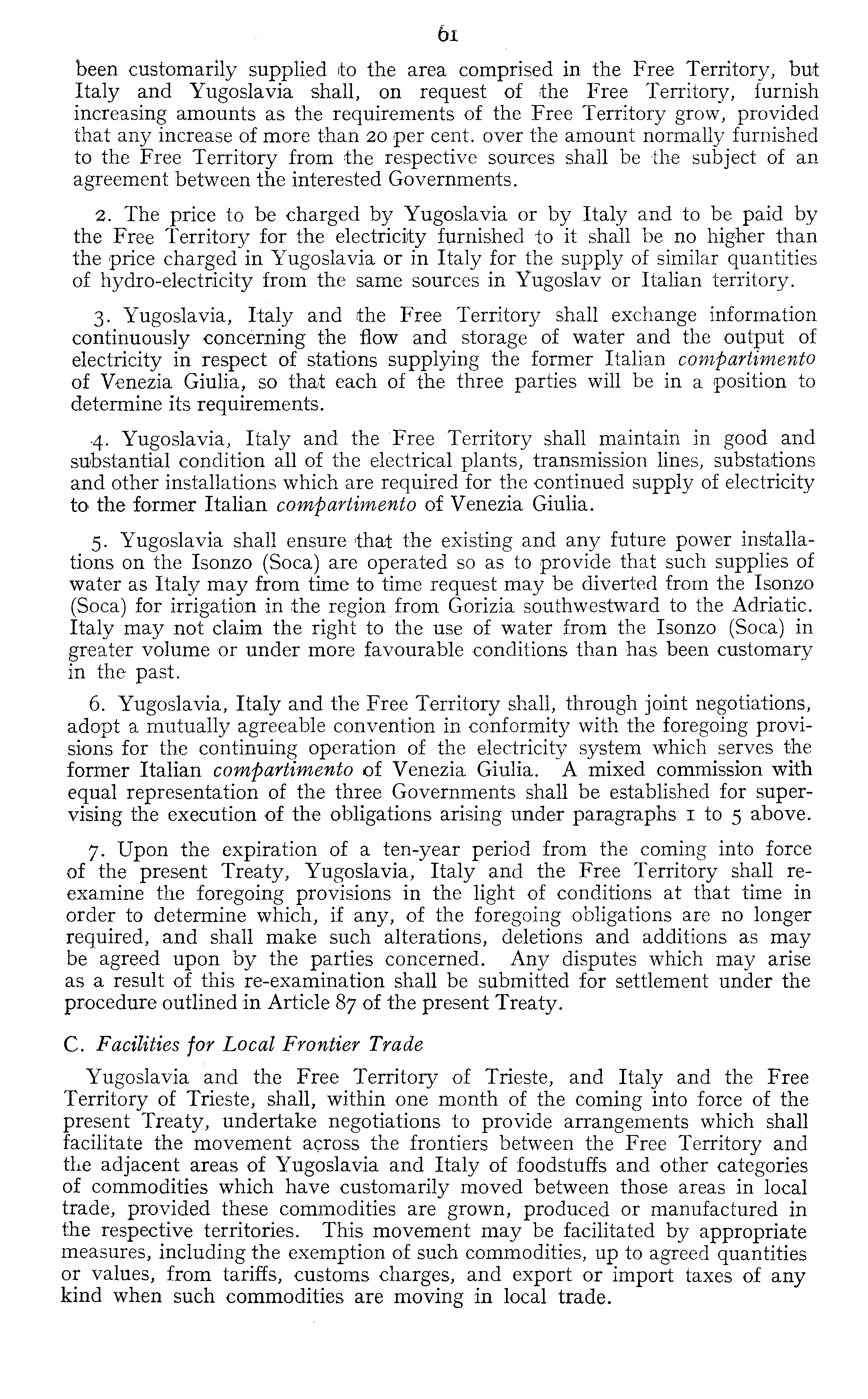 been customarily supplied to the area comprised in the Free Territory, but Italy and Yugoslavia shall, on request of the Free Territory, furnish increasing amounts as the requirements of the Free Territory grow, provided that any increase of more than 20 per cent, over the amount normally furnished to the Free Territory from the respective sources shall be the subject of an agreement between the interested Governments. 2. The price to be charged by Yugoslavia or by Italy and to be paid by the Free Territory for the electricity furnished to it shall be no higher than the price charged in Yugoslavia or in Italy for the supply of similar quantities of hydro-electricity from the same sources in Yugoslav or Italian territory. 3. Yugoslavia, Italy and the Free Territory shall exchange information continuously concerning the flow and storage of water and the output of electricity in respect of stations supplying the former Italian compartimento of Venezia Giulia, so that each of the three parties will be in a position to determine its requirements. •4. Yugoslavia, Italy and the Free Territory shall maintain in good and substantial condition all of the electrical plants, transmission lines, substations and other installations which are required for the continued supply of electricity to the former Italian compartimento of Venezia Giulia. 5. Yugoslavia shall ensure that the existing and any future power installations on the Isonzo (Soca) are operated so as to provide that such supplies of water as Italy may from time to time request may be diverted from the Isonzo (Soca) for irrigation in the region from Gorizia southwestward to the Adriatic. Italy may not claim the right to the use of water from the Isonzo (Soca) in greater volume or under more favourable conditions than has been customary in the past. 6. Yugoslavia, Italy and the Free Territory shall, through joint negotiations, adopt a mutually agreeable convention in conformity with the foregoing provisions for the continuing operation of the electricity system which serves the former Italian compartimento of Venezia Giulia. A mixed commission with equal representation of the three Governments shall be established for supervising the execution of the obligations arising under paragraphs 1 to 5 above. 7. Upon the expiration of a ten-year period from the coming into force of the present Treaty, Yugoslavia, Italy and the Free Territory shall reexamine the foregoing provisions in the light of conditions at that time in order to determine which, if any, of the foregoing obligations are no longer required, and shall make such alterations, deletions and additions as may be agreed upon by the parties concerned. Any disputes which may arise as a result of this re-examination shall be submitted for settlement under the procedure outlined in Article 87 of the present Treaty. C. Facilities for Local Frontier Trade Yugoslavia and the Free Territory of Trieste, and Italy and the Free Territory of Trieste, shall, within one month of the coming into force of the present Treaty, undertake negotiations to provide arrangements which shall facilitate the movement across the frontiers between the Free Territory and the adjacent areas of Yugoslavia and Italy of foodstuffs and other categories of commodities which have customarily moved between those areas in local trade, provided these commodities are grown, produced or manufactured in the respective territories. This movement may be facilitated by appropriate measures, including the exemption of such commodities, up to agreed quantities or values, from tariffs, customs charges, and export or import taxes of any kind when such commodities are moving in local trade.