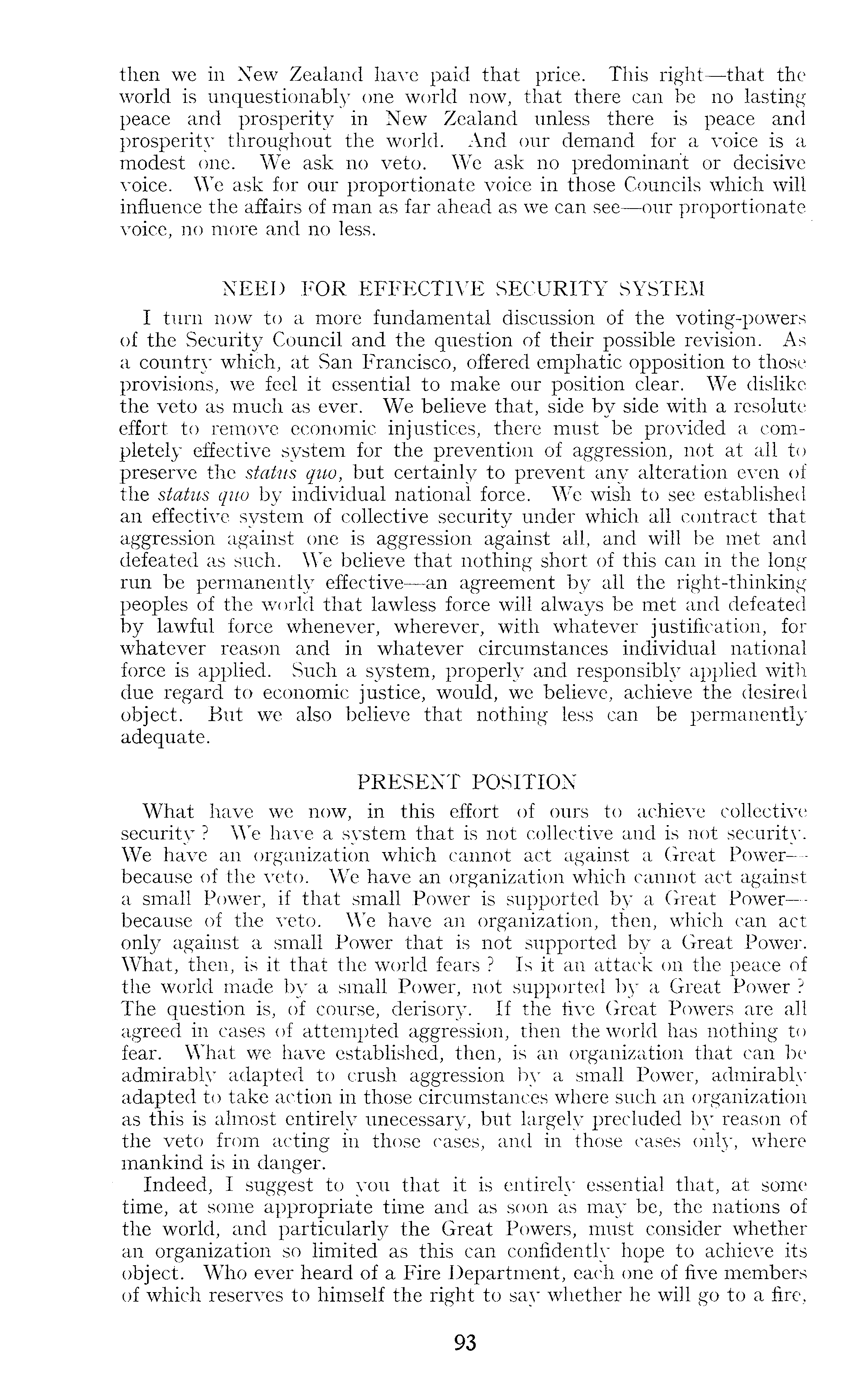 then we in New Zealand have paid that price. This right —that the world is unquestionably one world now, that there can be no lasting peace and prosperity in New Zealand unless there is peace and prosperity throughout the world. And our demand for a voice is a modest one. We ask no veto.. We ask no predominant or decisive voice. We ask for our proportionate voice in those Councils which will influence the affairs of man as far ahead as we can see —our proportionate voice, no more and no less, NEED FOR EFFECTIVE SECURITY SYSTEM I turn now to a. more fundamental discussion of the voting-powers of the Security Council and the question of their possible revision. As a country which, at San Francisco, offered emphatic opposition to those provisions, we feel it essential to make our position clear. We dislike the veto as much as ever. We believe that, side by side with a resolute effort to remove economic injustices, there must be provided a completely effective system for the prevention of aggression, not at all to preserve the status quo, but certainly to prevent any alteration even of the status quo by individual national force. We wish to see established an effective system of collective security under which all contract that aggression against one is aggression against all, and will be met and defeated as such. We believe that nothing short of this can in the long run be permanently effective —an agreement by all the right-thinking peoples of the world that lawless force will always be met and defeated by lawful force whenever, wherever, with whatever justification, for whatever reason and in whatever circumstances individual national force is applied. Such a system, properly and responsibly applied with due regard to economic justice, would, we believe, achieve the desired object. But we also believe that nothing less can be permanently adequate. PRESENT POSITION What have we now, in this effort of ours to achieve collective security ? We have a system that is not collective and is not security. We have an organization which cannot act against a Great Power—because of the veto. We have an organization which cannot'act against a small Power, if that small Power is supported by a Great Power — because of the veto. We have an organization, then, which can act only against a small Power that is not supported by a Great Power. What, then, is it that the world fears ? Is it an attack on the peace of the world made by a small Power, not supported by a Great Power ? The question is, of course, derisory. If the five Great Powers are all agreed in cases of attempted aggression, then the world has nothing to fear. What we have established, then, is an organization that can be admirably adapted to crush aggression by a small Power, admirably adapted to take action in those circumstances where such an organization as this is almost entirely unecessary, but largely precluded by reason of the veto from acting in those cases, and in those cases only, where mankind is in danger. Indeed, I suggest to you that it is entirely essential that, at some time, at some appropriate time and as soon as may be, the nations of the world, and particularly the Great Powers, must consider whether an organization so limited as this can confidently hope to achieve its object. Who ever heard of a Fire Department, each one of five members of which reserves to himself the right to say whether he will go to a fire,
