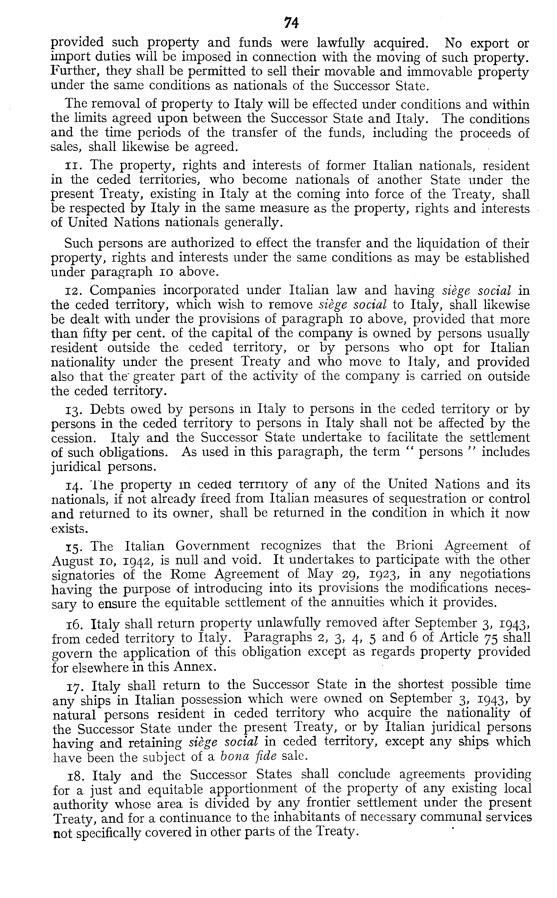 provided such property and funds were lawfully acquired. No export or import duties will be imposed in connection with the moving of such property. Further, they shall be permitted to sell their movable and immovable property under the same conditions as nationals of the Successor State. The removal of property to Italy will be effected under conditions and within the limits agreed upon between the Successor State and Italy. The conditions and the time periods of the transfer of the funds, including the proceeds of sales, shall likewise be agreed. ii. The property, rights and interests of former Italian nationals, resident in the ceded territories, who become nationals of another State under the present Treaty, existing in Italy at the coming into force of the Treaty, shall be respected by Italy in the same measure as the property, rights and interests of United Nations nationals generally. Such persons are authorized to effect the transfer and the liquidation of their property, rights and interests under the same conditions as may be established under paragraph 10 above. 12. Companies incorporated under Italian law and having siege social in the ceded territory, which wish to remove siege social to Italy, shall likewise be dealt with under the provisions of paragraph 10 above, provided that more than fifty per cent, of the capital of the company is owned by persons usually resident outside the ceded territory, or by persons who opt for Italian nationality under the present Treaty and who move to Italy, and provided also that the : greater part of the activity of the company is carried on outside the ceded territory. 13. Debts owed by persons in Italy to persons in the ceded territory or by persons in the ceded territory to persons in Italy shall not be affected by the cession. Italy and the Successor State undertake to facilitate the settlement of such obligations. As used in this paragraph, the term " persons " includes juridical persons. 14. The property in ceded territory of any of the United Nations and its nationals, if not already freed from Italian measures of sequestration or control and returned to its owner, shall be returned in the condition in which it now •exists. 15. The Italian Government recognizes that the Brioni Agreement of August 10, 1942, is null and void. It undertakes to participate with the other signatories of the Rome Agreement of May 29, 1923, in any negotiations having the purpose of introducing into its provisions the modifications necessary to ensure the equitable settlement of the annuities which it provides. 16. Italy shall return property unlawfully removed after September 3, 1943, from ceded territory to Italy. Paragraphs 2, 3, 4, 5 and 6 of Article 75 shall govern the application of this obligation except as regards property provided for elsewhere in this Annex. 17. Italy shall return to the Successor State in the shortest possible time any ships in Italian possession which were owned on September 3, 1943, by natural persons resident in ceded territory who acquire the nationality of the Successor State under the present Treaty, or by Italian juridical persons having and retaining siege social in ceded territory, except any ships which have been the subject of a bona fide sale. 18. Italy and the Successor States shall conclude agreements providing for a just and equitable apportionment of the property of any existing local authority whose area is divided by any frontier settlement under the present Treaty, and for a continuance to the inhabitants of necessary communal services not specifically covered in other parts of the Treaty.
