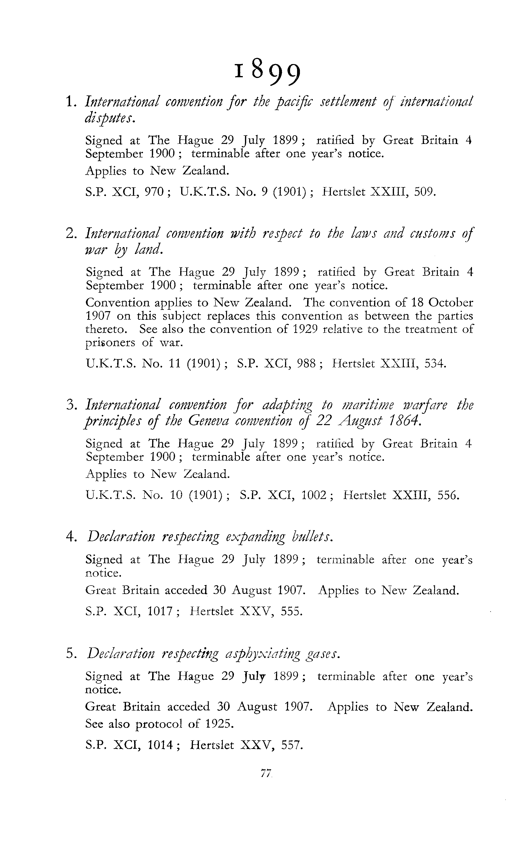 i 8 99 1. International convention for the pacific settlement of international disputes. Signed at The Hague 29 July 1899 ; ratified by Great Britain 4 September 1900 ; terminable after one year's notice. Applies to New Zealand. S.P. XCI, 970 ; U.K.T.S. No. 9 (1901); Hertslet XXIII, 509. 2. International convention with respect to the laws and customs of war by land. Signed at The Hague 29 July 1899 ; ratified by Great Britain 4 September 1900; terminable after one year's notice. Convention applies to New Zealand. The convention of 18 October 1907 on this subject replaces this convention as between the parties thereto. See also the convention of 1929 relative to the treatment of prisoners of war. U.K.T.S. No. 11 (1901); S.P. XCI, 988 ; Hertslet XXIII, 534. 3. International convention for adapting to maritime warfare the principles of the Geneva convention of 22 August 1864. Signed at The Hague 29 July 1899 ; ratified by Great Britain 4 September 1900 ; terminable after one year's notice. Applies to New Zealand. U.K.T.S. No. 10 (1901); S.P. XCI, 1002 ; Hertslet XXIII, 556. 4. Declaration respecting expanding bullets. Signed at The Hague 29 July 1899 ; terminable after one year's notice. Great Britain acceded 30 August 1907. Applies to New Zealand. S.P. XCI, 1017 ; Hertslet XXV, 555. 5. Declaration respecting asphyxiating gases. Signed at The Hague 29 July 1899 ; terminable after one year's notice. Great Britain acceded 30 August 1907. Applies to New Zealand. See also protocol of 1925. S.P. XCI, 1014; Hertslet XXV, 557.