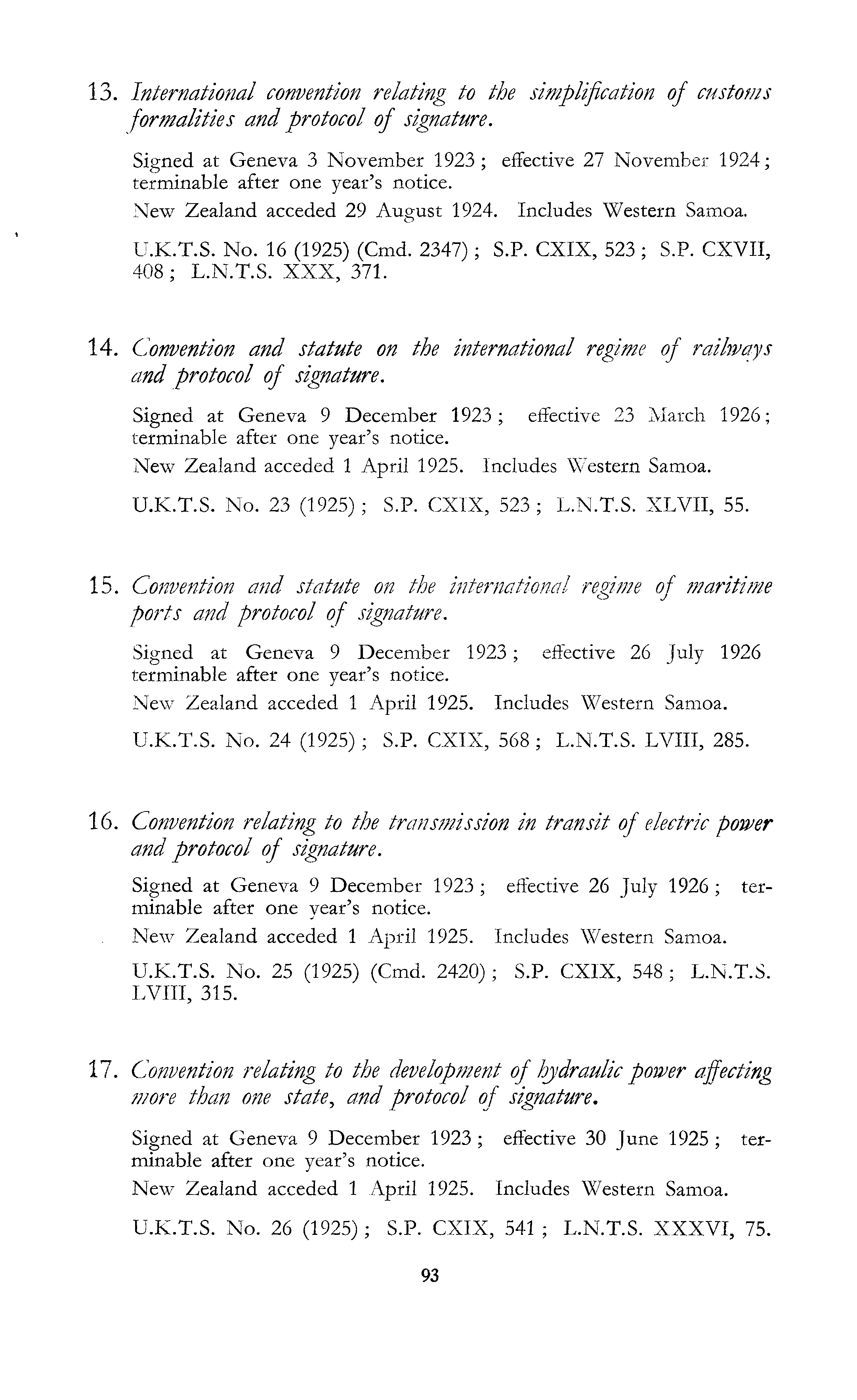 13. International convention relating to the simplification of customs formalities and protocol of signature. Signed at Geneva 3 November 1923; effective 27 November 1924; terminable after one year's notice. New Zealand acceded 29 August 1924. Includes Western Samoa. U.K.T.S. No. 16 (1925) (Cmd. 2347); S.P. CXIX, 523; S.P. CXVII, 408 ; L.N.T.S. XXX, 371. 14. Convention and statute on the international regime of railways and protocol of signature. Signed at Geneva 9 December 1923; effective 23 March 1926; terminable after one year's notice. New Zealand acceded 1 April 1925. Includes Western Samoa. U.K.T.S. No. 23 (1925); S.P. CXIX, 523 ; L.N.T.S. XLVII, 55. 15. Convention and statute on the international regime of maritime ports and protocol of signature. Signed at Geneva 9 December 1923; effective 26 July 1926 terminable after one year's notice. New Zealand acceded 1 April 1925. Includes Western Samoa. U.K.T.S. No. 24 (1925) ; S.P. CXIX, 568; L.N.T.S. LVIII, 285. 16. Convention relating to the transmission in transit of electric power and protocol of signature. Signed at Geneva 9 December 1923 ; effective 26 July 1926 ; terminable after one year's notice. New Zealand acceded 1 April 1925. Includes Western Samoa. U.K.T.S. No. 25 (1925) (Cmd. 2420); S.P. CXIX, 548; L.N.T.S. LVIII, 315. 17. Convention relating to the development of hydraulic power affecting more than one state, and protocol of signature. Signed at Geneva 9 December 1923 ; effective 30 June 1925 ; terminable after one year's notice. New Zealand acceded 1 April 1925. Includes Western Samoa. U.K.T.S. No. 26 (1925) ; S.P. CXIX, 541 ; L.N.T.S. XXXVI, 75.