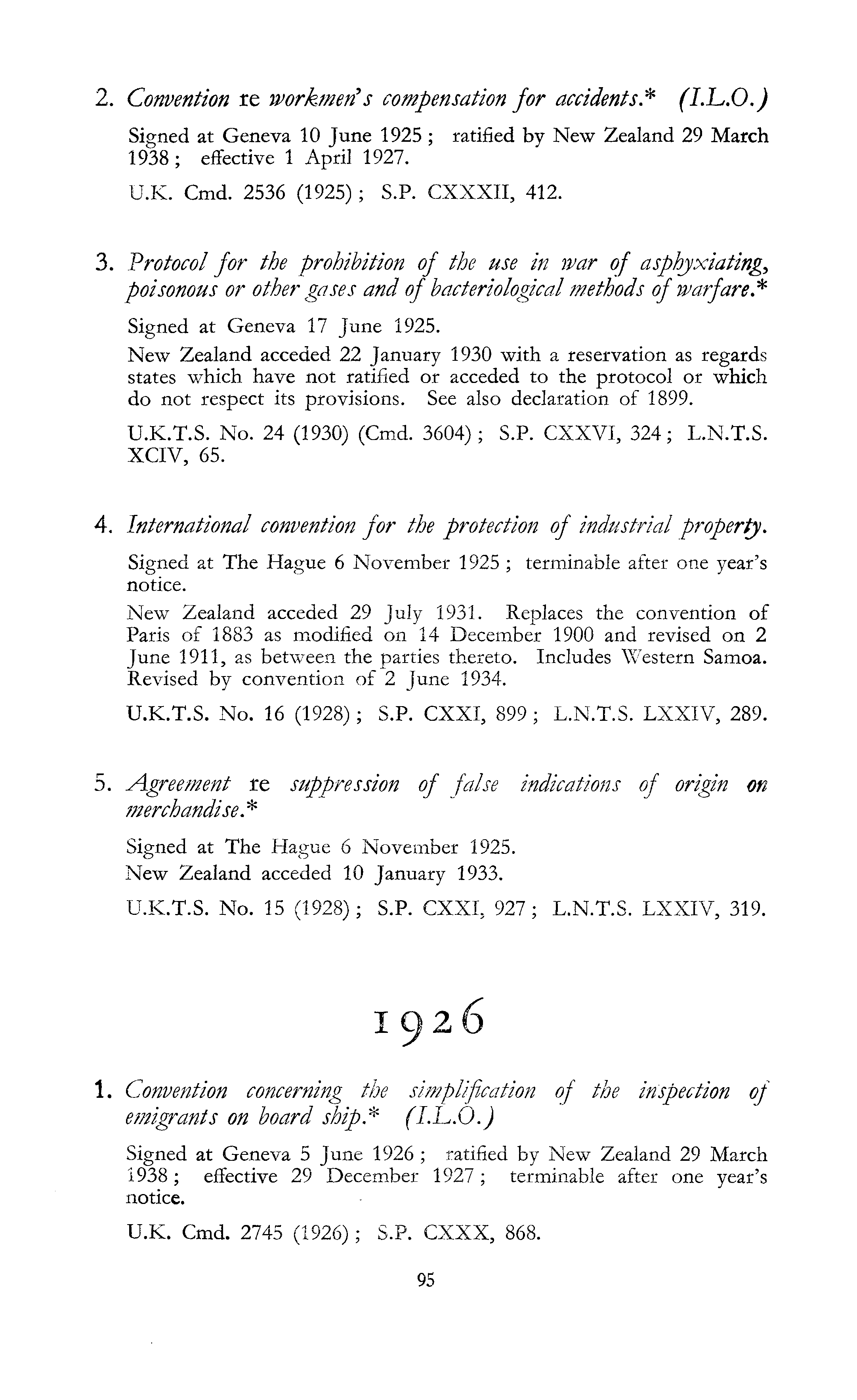 2. Convention re workmen''s compensation for accidents.* (1.L.0.) Signed at Geneva 10 June 1925; ratified by New Zealand 29 March 1938 ; effective 1 April 1927. U.K. Cmd. 2536 (1925) ; S.P. CXXXII, 412. 3. Protocol for the prohibition of the use in war of asphyxiating, poisonous or other gases and of bacteriological methods of warfare.* Signed at Geneva 17 June 1925. New Zealand acceded 22 January 1930 with a reservation as regards states which have not ratified or acceded to the protocol or which do not respect its provisions. See also declaration of 1899. U.K.T.S. No. 24 (1930) (Cmd. 3604); S.P. CXXVI, 324; L.N.T.S. XCIV, 65. 4. International convention for the protection of industrial property. Signed at The Hague 6 November 1925 ; terminable after one year's notice. New Zealand acceded 29 July 1931. Replaces the convention of Paris of 1883 as modified on 14 December 1900 and revised on 2 June 1911, as between the parties thereto. Includes Western Samoa. Revised by convention of 2 June 1934. U.K.T.S. No. 16 (1928) ; S.P. CXXI, 899; L.N.T.S. LXXIV, 289. 5. Agreement re suppression of false indications of origin on merchandise* Signed at The Hague 6 November 1925. New Zealand acceded 10 January 1933. U.K.T.S. No. 15 (1928) ; S.P. CXXI, 927; L.N.T.S. LXXIV, 319. 1926 1. Convention concerning the simplification of the inspection of emigrants on board ship* (1.L.0.) Signed at Geneva 5 June 1926 ; ratified by New Zealand 29 March 1938; effective 29 December 1927; terminable after one year's notice. U.K. Cmd. 2745 (1926) ; S.P. CXXX, 868.
