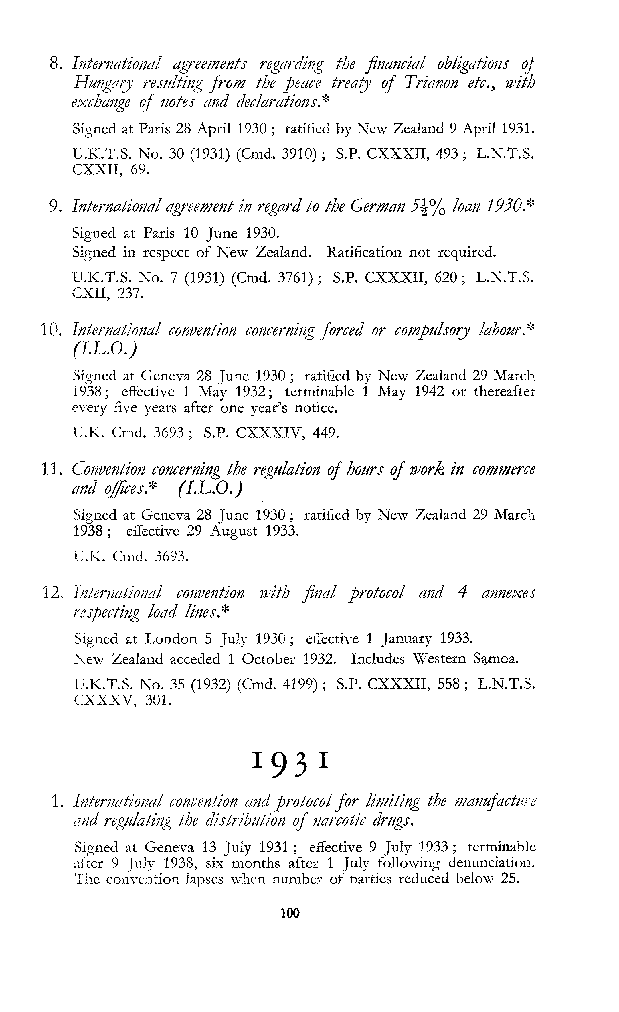 8. International agreements regarding the financial obligations of Hungary resulting from the peace treaty of Trianon etc., with exchange of notes and declarations* Signed at Paris 28 April 1930 ; ratified by New Zealand 9 April 1931. U.K.T.S. No. 30 (1931) (Cmd. 3910) ; S.P. CXXXII, 493 ; L.N.T.S. CXXII, 69. 9. International agreement in regard to the German -5J% loan 1930* Signed at Paris 10 June 1930. Signed in respect of New Zealand. Ratification not required. U.K.T.S. No. 7 (1931) (Cmd. 3761) ; S.P. CXXXII, 620; L.N.T.S. CXII, 237. 10. International convention concerning forced or compulsory labour.* (1.L.0.) Signed at Geneva 28 June 1930; ratified by New Zealand 29 March 1938; effective 1 May 1932; terminable 1 May 1942 or thereafter every five years after one year's notice. U.K. Cmd. 3693; S.P. CXXXIV, 449. 11. Convention concerning the regulation of hours of work in commerce and offices.* (1.L.0.) Signed at Geneva 28 June 1930; ratified by New Zealand 29 March 1938; effective 29 August 1933. U.K. Cmd. 3693. 12. International convention with final protocol and 4 annexes respecting load lines* Signed at London 5 July 1930; effective 1 January 1933. New Zealand acceded 1 October 1932. Includes Western Samoa. U.K.T.S. No. 35 (1932) (Cmd. 4199) ; S.P. CXXXII, 558; L.N.T.S. CXXXV, 301. 1931 1. International convention and protocol for limiting the manufacture and regulating the distribution of narcotic drugs. Signed at Geneva 13 July 1931 ; effective 9 July 1933 ; terminable after 9 July 1938, six months after 1 July following denunciation. The convention lapses when number of parties reduced below 25.