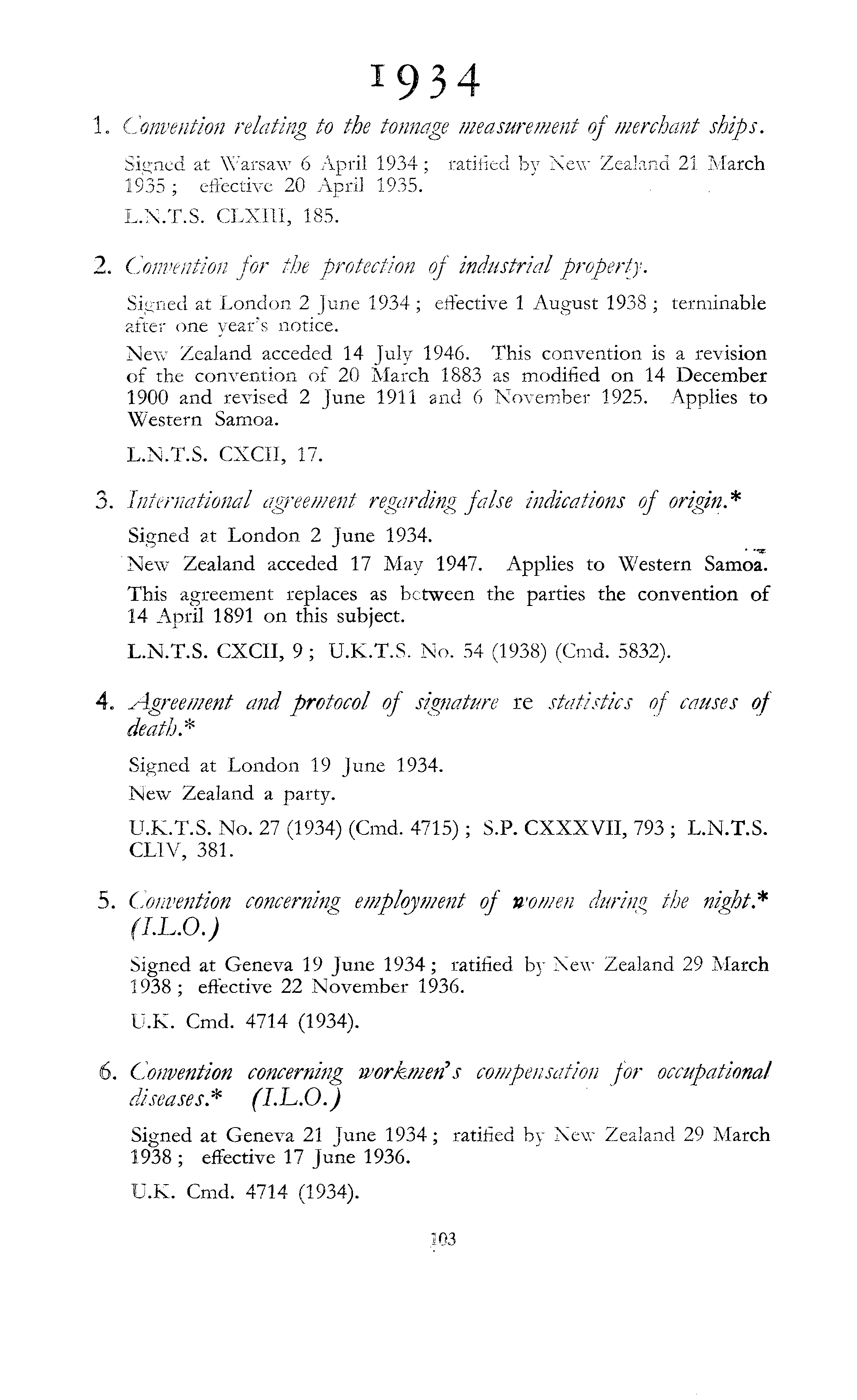 i 934 1. Convention relating to the tonnage measurement of merchant ships. Signed at Warsaw 6 April 1934; ratified by New Zealand 21 March 1935 ; effective 20 April 1935. L.N.T.S. CLXIII, 185. 2. Convention for the protection of industrial property. Signed at London 2 June 1934 ; effective 1 August 1938 ; terminable after one year's notice. New Zealand acceded 14 July 1946. This convention is a revision of the convention of 20 March 1883 as modified on 14 December 1900 and revised 2 June 1911 and 6 November 1925. Applies to Western Samoa. L.N.T.S. CXCII, 17. 3. International agreement regarding false indications of origin* Signed at London 2 June 1934. New Zealand acceded 17 May 1947. Applies to Western Samoa. This agreement replaces as between the parties the convention of 14 April 1891 on this subject. L.N.T.S. CXCII, 9; U.K.T.S. No. 54 (1938) (Cmd. 5832). 4. Agreement and protocol of signature re statistics of causes of death.* Signed at London 19 June 1934. New Zealand a party. U.K.T.S. No. 27 (1934) (Cmd. 4715); S.P. CXXXVII, 793 ; L.N.T.S. CLIV, 381. 5. Convention concerning employment of women during the night* (1.L.0.) Signed at Geneva 19 June 1934; ratified by New Zealand 29 March 1938 ; effective 22 November 1936. U.K. Cmd. 4714 (1934). 6. Convention concerning workmen's compensation for occupational diseases* (1.L.0.) Signed at Geneva 21 June 1934; ratified bv New Zealand 29 March 1938 ; effective 17 June 1936. U.K. Cmd. 4714 (1934).