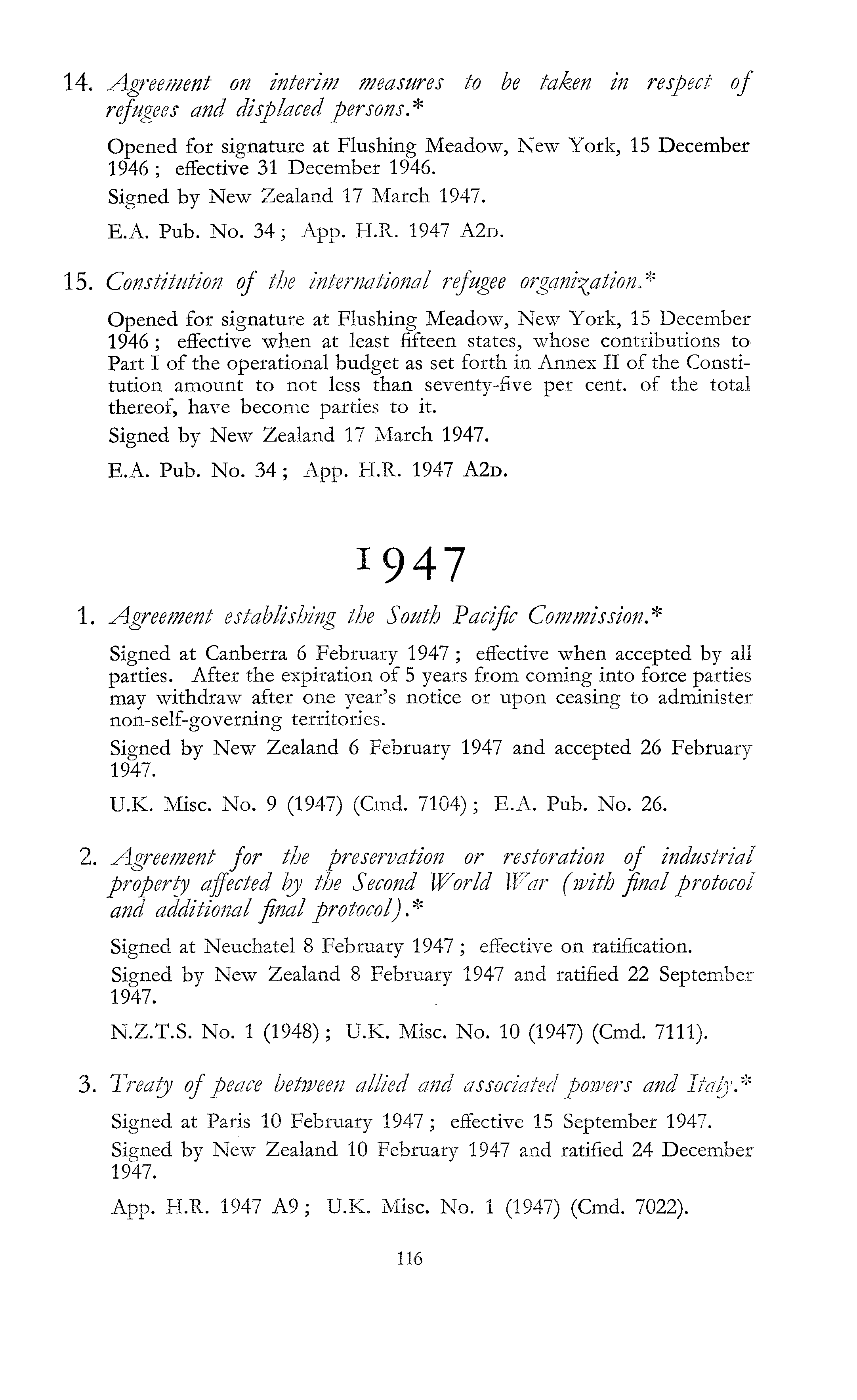 14. Agreement on interim measures to be taken in respect of refugees and displaced persons. * Opened for signature at Flushing Meadow, New York, 15 December 1946 ; effective 31 December 1946. Signed by New Zealand 17 March 1947. E.A. Pub. No. 34; App. H.R. 1947 A2d. 15. Constitution of the international refugee organisation* Opened for signature at Flushing Meadow, New York, 15 December 1946 ; effective when at least fifteen states, whose contributions to Part I of the operational budget as set forth in Annex II of the Constitution amount to not less than seventy-five per cent, of the total thereof, have become parties to it. Signed by New Zealand 17 March 1947. E.A. Pub. No. 34; App. H.R. 1947 A2d. 1947 1. Agreement establishing the South Pacific Commission* Signed at Canberra 6 February 1947 ; effective when accepted by all parties. After the expiration of 5 years from coming into force parties may withdraw after one year's notice or upon ceasing to administer non-self-governing territories. Signed by New Zealand 6 February 1947 and accepted 26 February 1947. U.K. Misc. No. 9 (1947) (Cmd. 7104); E.A. Pub. No. 26. 2. Agreement for the preservation or restoration of industrial property affected by the Second World War (with final protocol and additional final protocol) . * Signed at Neuchatel 8 February 1947 ; effective on ratification. Signed by New Zealand 8 February 1947 and ratified 22 September 1947. N.Z.T.S. No. 1 (1948); U.K. Misc. No. 10 (1947) (Cmd. 7111). 3. Treaty of peace between allied and associated powers and Italy* Signed at Paris 10 February 1947 ; effective 15 September 1947. Signed by New Zealand 10 February 1947 and ratified 24 December 1947. App. H.R. 1947 A 9; U.K. Misc. No. 1 (1947) (Cmd. 7022).