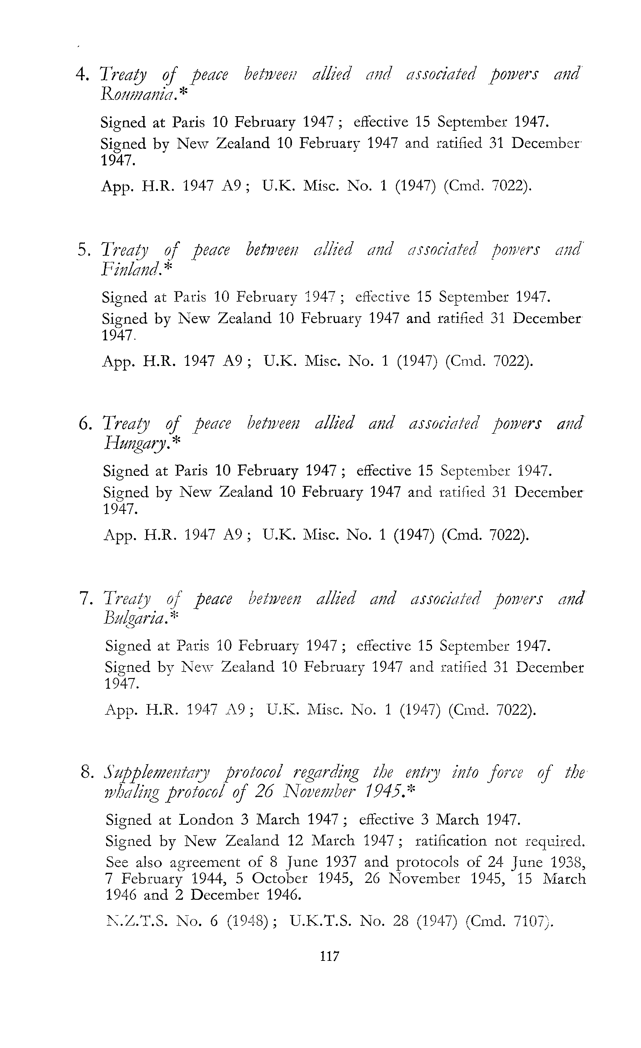 4. Treaty of peace between allied and associated powers and Koumania* Signed at Paris 10 February 1947 ; effective 15 September 1947. Signed by New Zealand 10 February 1947 and ratified 31 December 1947. App. H.R. 1947 A 9 ; U.K. Misc. No. 1 (1947) (Cmd. 7022). 5. Treaty of peace between allied and associated powers and Finland* Signed at Paris 10 February 1947 ; effective 15 September 1947. Signed by New Zealand 10 February 1947 and ratified 31 December 1947. App. H.R. 1947 A 9 ; U.K. Misc. No. 1 (1947) (Cmd. 7022). 6. Treaty of peace between allied and associated powers and Hungary* Signed at Paris 10 February 1947; effective 15 September 1947. Signed by New Zealand 10 February 1947 and ratified 31 December 1947. App. H.R. 1947 A 9 ; U.K. Misc. No. 1 (1947) (Cmd. 7022). 7. Treaty of peace between allied and associated powers and 'Bulgaria. * Signed at Paris 10 February 1947; effective 15 September 1947. Signed by New Zealand 10 February 1947 and ratified 31 December 1947. App. H.R. 1947 A 9; U.K. Misc. No. 1 (1947) (Cmd. 7022). 8. Supplementary protocol regarding the entry into force of the whaling protocol of 26 November 1945.* Signed at London 3 March 1947; effective 3 March 1947. Signed by New Zealand 12 March 1947 ; ratification not required. See also agreement of 8 June 1937 and protocols of 24 June 1938, 7 February 1944, 5 October 1945, 26 November 1945, 15 March 1946 and 2 December 1946. N.Z.T.S. No. 6 (1948); U.K.T.S. No. 28 (1947) (Cmd. 7107).
