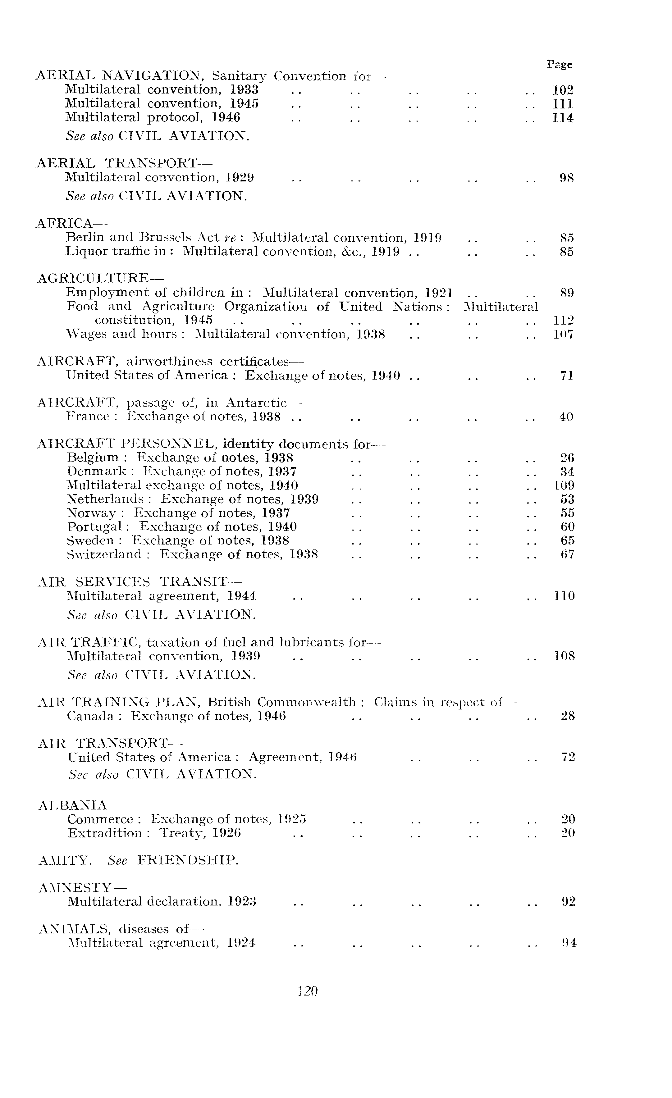Psgc AERIAL NAVIGATION, Sanitary Convention for— Multilateral convention, 1933 .. . . . . . . 102 Multilateral convention, 1945 .. .. .. .. ..11l Multilateral protocol, 1946 . . . . . . . . 114 See also CIVIL AVIATION. AERIAL TRANSPORT— Multilateral convention, 1929 . . . . . . . . 98 See also CIVIL AVIATION. AFRICA— Berlin and Brussels Act re : Multilateral convention, 1919 . . . . 85 Liquor traffic in : Multilateral convention, &c, 1919 .. .. ..85 AGRICULTURE— Employment of children in : Multilateral convention, 1921 .. . . 89 Food and Agriculture Organization of United Nations : Multilateral constitution, 1945 .. .. .. .. .. ..112 Wages and hours : Multilateral convention, 1938 .. . . . . 107 AIRCRAFT, airworthiness certificates — United States of America : Exchange of notes, 1940 .. .. .. 71 AIRCRAFT, passage of, in Antarctic — France : Exchange of notes, 1938 . . .. .. .. 40 AIRCRAFT PERSONNEL, identity documents for— Belgium : Exchange of notes, 1938 . . . . . . 26 Denmark : Exchange of notes, 1937 . . . . . . 34 Multilateral exchange of notes, 1940 . . . . .. . . 109 Netherlands : Exchange of notes, 1939 . . . . .. 53 Norway: Exchange of notes, 1937 . . . . . . 55 Portugal: Exchange of notes, 1940 . . . . .. 60 Sweden : Exchange of notes, 1938 . . .. .. 65 Switzerland : Exchange of notes, 1938 . . . . .. 67 AIR SERVICES TRANSIT— Multilateral agreement, 1944 .. .. .. .. ..110 See also CIVIL AVIATION. AIR TRAFFIC, taxation of fuel and lubricants for — Multilateral convention, 1939 .. .. .. .. . . 108 See also CIVIL AVIATION. AIR TRAINING PLAN, British Commonwealth : Claims in respect of— Canada: Fbcchange of notes, 1946 .. .. .. ..28 AIR TRANSPORT— United States of America: Agreement, 1946 . . . . 72 See also CIVIL AVIATION. ALBANIA— Commerce : Exchange of notes, 1925 . . . . . . 20 Extradition : Treaty, 1926 .. . . . . .. 20 AMITY. See FRIENDSHIP. AMNESTY— Multilateral declaration, 1923 .. . . . . .. 92 ANIMALS, diseases of— Multilateral agreement, 1924 .. .. .. .. 94