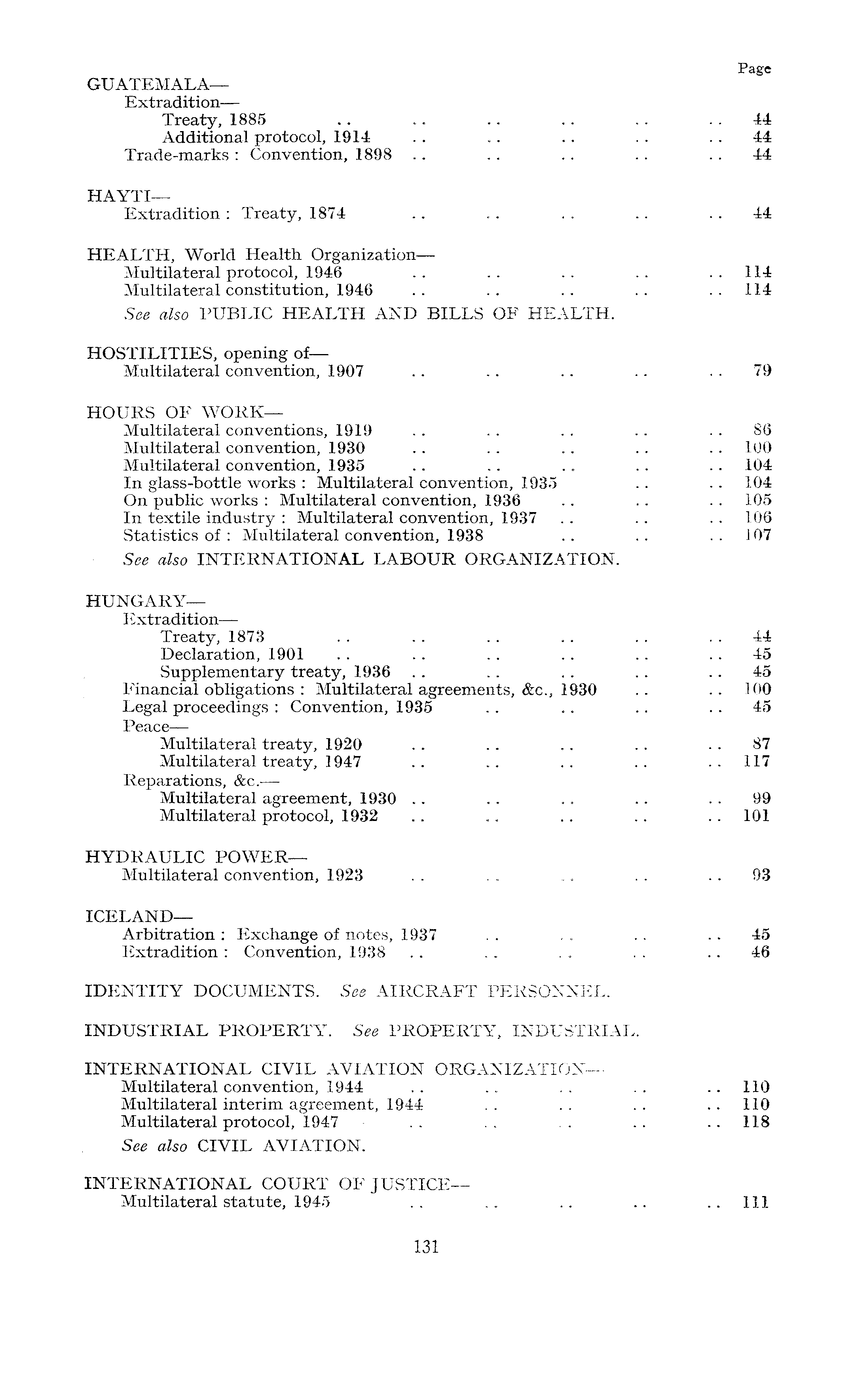 Page GUATEMALA— Extradition — Treaty, 1885 .. .. .. .. .. 44 Additional protocol, 1914 . . . . . . . . . . 44 Trade-marks : Convention, 1898 . . . . . . .. 44 HAYTI— Extradition : Treaty, 1874 . . . . . . .. 44 HEALTH, World Health OrganizationMultilateral protocol, 1946 . . .. . . .. . . 114 Multilateral constitution, 1946 .. .. .. .. ..114 See also PUBLIC HEALTH AND BILLS OF HEALTH. HOSTILITIES, opening of— Multilateral convention, 1907 . . . . . . . . 79 HOURS OF WORK— Multilateral conventions, 1919 . . . . . . .. . . S6 Multilateral convention, 1930 . . . . .. .. . . 100 Multilateral convention, 1935 . . . . . . . . . . 104 In glass-bottle works : Multilateral convention, 1935 .. . . 104 On public works : Multilateral convention, 1936 .. . . 105 In textile industry : Multilateral convention, 1937 . . .. 106 Statistics of : Multilateral convention, 1938 .. .. . . 107 See also INTERNATIONAL LABOUR ORGANIZATION. HUNGARY— Extradition — Treaty, 1873 . . .. .. . . . . 44 Declaration, 1901 . . .. . . . . . . 45 Supplementary treaty, 1936 . . .. . . .. 45 Financial obligations : Multilateral agreements, &c, 1930 . . . . 100 Legal proceedings : Convention, 1935 .. . . .. 45 Peace— Multilateral treaty, 1920 . . . . .. .. 87 Multilateral treaty, 1947 .. .. .. .. ..117 Reparations, &c.— Multilateral agreement, 1930 .. .. . . .. 99 Multilateral protocol, 1932 .. . . . . . . . . 101 HYDRAULIC POWER— Multilateral convention, 1923 .. . . . . . . 93 ICELAND— Arbitration : Exchange of notes, 1937 . . . . . . 45 Extradition : Convention, 1938 .. . . . . .. 46 IDENTITY DOCUMENTS. See AIRCRAFT PERSONNEL. INDUSTRIAL PROPERTY. See PROPERTY, INDUSTRIAL. INTERNATIONAL CIVIL AVIATION ORGANIZATION— Multilateral convention, 1944 .. .. .. .. ..110 Multilateral interim agreement, 1944 .. .. .. ..110 Multilateral protocol, 1947 . . . . . . .. . . 118 See also CIVIL AVIATION. INTERNATIONAL COURT OF JUSTICE— Multilateral statute, 1945 .. . . .. .. . . 11l