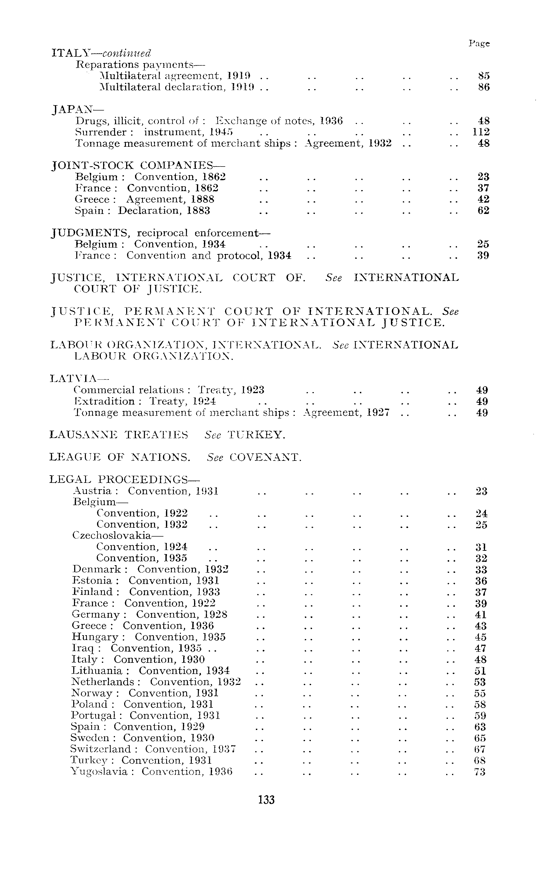 Page ITALY — continued Reparations payments — Multilateral agreement, 1919 . . .. .. . . . . 85 Multilateral declaration, 1919 . . .. .. . . . . 86 JAPAN— Drugs, illicit, control of : Exchange of notes, 1936 . . . . 48 Surrender : instrument, 1945 . . . . . . .. 112 Tonnage measurement of merchant ships : Agreement, 1932 .. . . 48 JOINT-STOCK COMPANIES— Belgium : Convention, 1862 .. .. .. .. 23 France : Convention, 1862 .. .. .. .. 37 Greece : Agreement, 1888 .. .. .. . . 42 Spain : Declaration, 1883 .. .. .. .. 62 JUDGMENTS, reciprocal enforcement — Belgium : Convention, 1934 . . ... .. .. 25 France : Convention and protocol, 1934 .. .. .. 39 JUSTICE, INTERNATIONAL COURT OF. See INTERNATIONAL COURT OF JUSTICE. JUSTICE, PERMANENT COURT OF INTERNATIONAL. See PERMANENT COURT OF INTERNATIONAL JUSTICE. LABOUR ORGANIZATION, INTERNATIONAL. See INTERNATIONAL LABOUR ORGANIZATION. LATVIA— Commercial relations : Treaty, 1923 . . .. .. 49 Extradition : Treaty, 1924 . . .. .. .. 49 Tonnage measurement of merchant ships : Agreement, 1927 .. .. 49 LAUSANNE TREATIES See TURKEY. LEAGUE OF NATIONS. See COVENANT. LEGAL PROCEEDINGS— Austria : Convention, 1931 . . .. . . . . 23 Belgium— Convention, 1922 . . .. . . .. . . 24 Convention, 1932 . . . . .. .. .. 25 Czechoslovakia —- Convention, 1924 . . .. . . .. .. 31 Convention, 1935 . . .. .. .. .. 32 Denmark : Convention, 1932 .. .. .. .. 33 Estonia : Convention, 1931 .. . . . . .. 36 Finland : Convention, 1933 .. .. . . .. 37 France : Convention, 1922 .. .. . . .. 39 Germany : Convention, 1928 .. .. .. . . .. 41 Greece : Convention, 1936 .. .. .. .. 43 Hungary: Convention, 1935 .. .. . . .. 45 Iraq : Convention, 1935 . . . . .. .. .. 47 Italy : Convention, 1930 . . .. .. . . 48 Lithuania : Convention, 1934 .. .. . . .. 51 Netherlands: Convention, 1932 .. .. . . . . 53 Norway : Convention, 1931 .. .. .. . . 55 Poland: Convention, 1931 .. .. .. .. ..58 Portugal : Convention, 1931 . . .. .. . . 59 Spain : Convention, 1929 . . .. . . . . 63 Sweden : Convention, 1930 .. . . . . . . 65 Switzerland : Convention, 1937 .. .. .. .. .. 67 Turkey : Convention, 1931 .. . . . . .. 68 Yugoslavia : Convention, 1936 . . .. . . . . 73