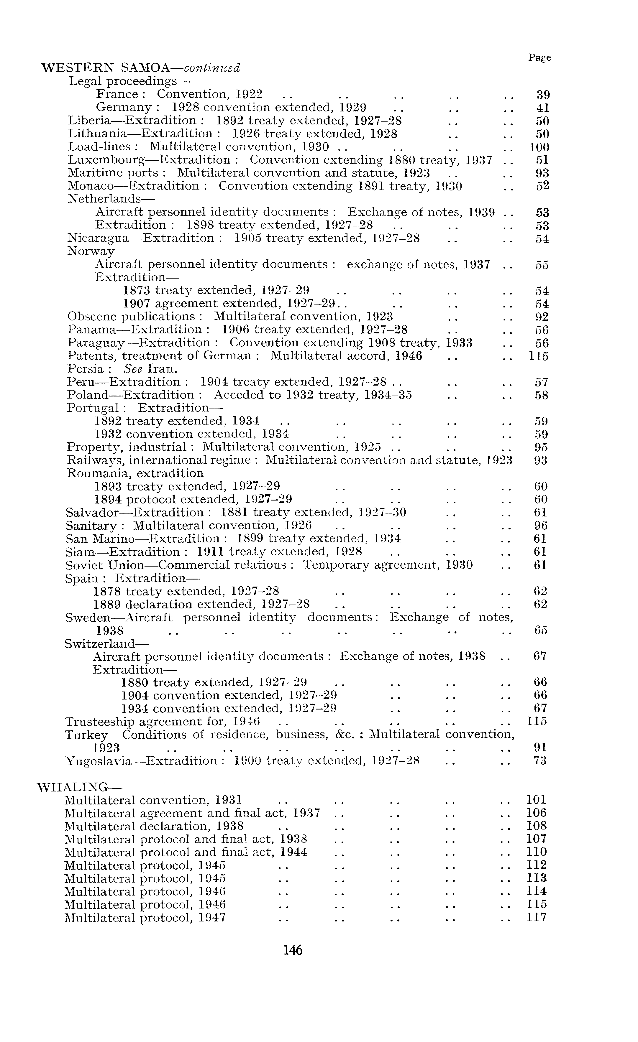 Page WESTERN SAMOA—continued Legal proceedings— France : Convention, 1922 . . . . .. .. 39 Germany : 1928 convention extended, 1929 . . .. 41 Liberia —Extradition : 1892 treaty extended, 1927-28 . . . . 50 Lithuania—Extradition : 1926 treaty extended, 1928 .. . . 50 Load-lines : Multilateral convention, 1930 . . .. .. . . 100 Luxembourg—Extradition : Convention extending 1880 treaty, 1937 .. 51 Maritime ports : Multilateral convention and statute, 1923 . . . . 93 Monaco —Extradition : Convention extending 1891 treaty, 1930 .. 52 Netherlands — Aircraft personnel identity documents : Exchange of notes, 1939 . . 53 Extradition : 1898 treaty extended, 1927-28 . . .. 53 Nicaragua—Extradition : 1905 treaty extended, 1927-28 .. .. 54 NorwayAircraft personnel identity documents : exchange of notes, 1937 .. 55 Extradition—1873 treaty extended, 1927-29 . . . . . . 54 1907 agreement extended, 1927-29. . .. .. ..54 Obscene publications : Multilateral convention, 1923 . . .. 92 Panama—Extradition : 1906 treaty extended, 1927-28 . . . . 56 Paraguay—Extradition : Convention extending 1908 treaty, 1933 . . 56 Patents, treatment of German : Multilateral accord, 1946 . . 115 Persia : See Iran. Peru—Extradition : 1904 treaty extended, 1927-28 . . . . 57 Poland—Extradition : Acceded to 1932 treaty, 1934-35 .. .. 58 Portugal : Extradition—--1892 treaty extended, 1934 . . . . . . 59 1932 convention extended, 1934 . . . . . . 59 Property, industrial : Multilateral convention, 1925 . . .. 95 Railways, international regime : Multilateral convention and statute, 1923 93 Roumania, extradition—--1893 treaty extended, 1927-29 . . . . . . 60 1894 protocol extended, 1927-29 .. . . . . 60 Salvador—Extradition : 1881 treaty extended, 1927-30 . . . . 61 Sanitary : Multilateral convention, 1926 . . . . .. 96 San Marino—Extradition: 1899 treaty extended, 1934 .. .. 61 Siam—Extradition : 1911 treaty extended, 1928 .. .. .. 61 Soviet Union —Commercial relations : Temporary agreement, 1930 . . 61 Spain : Extradition — 1878 treaty extended, 1927-28 . . .. . . 62 1889 declaration extended, 1927-28 . . . . . . 62 Sweden —Aircraft personnel identity documents: Exchange of notes, 1938 .. . . .. .. .. •• 65 Switzerland—Aircraft personnel identity documents : Exchange of notes, 1938 .. 67 Extradition—--1880 treaty extended, 1927-29 . . . . . . 66 1904 convention extended, 1927-29 .. .. 66 1934 convention extended, 1927-29 .. .. 67 Trusteeship agreement for, 1946 . . . . .. . . .. 115 Turkey—-Conditions of residence, business, &c. : Multilateral convention, 1923 . . .. .. .. . . .. 91 Yugoslavia—Extradition : 1900 treaty extended, 1927-28 .. .. 73 WHALING— Multilateral convention, 1931 .. .. . . .. .. 101 Multilateral agreement and final act, 1937 . . .. .. . . 106 Multilateral declaration, 1938 . . .. . . . . . . 108 Multilateral protocol and final act, 1938 . . . . .. .. 107 Multilateral protocol and final act, 1944 .. . . . . .. 110 Multilateral protocol, 1945 .. .. . . .. . . 112 Multilateral protocol, 1945 .. .. .. .. . . 113 Multilateral protocol, 1946 .. .. .. .. .. 114 Multilateral protocol, 1946 . . . . . . .. . . 115 Multilateral protocol, 1947 .. .. .. .. ..117